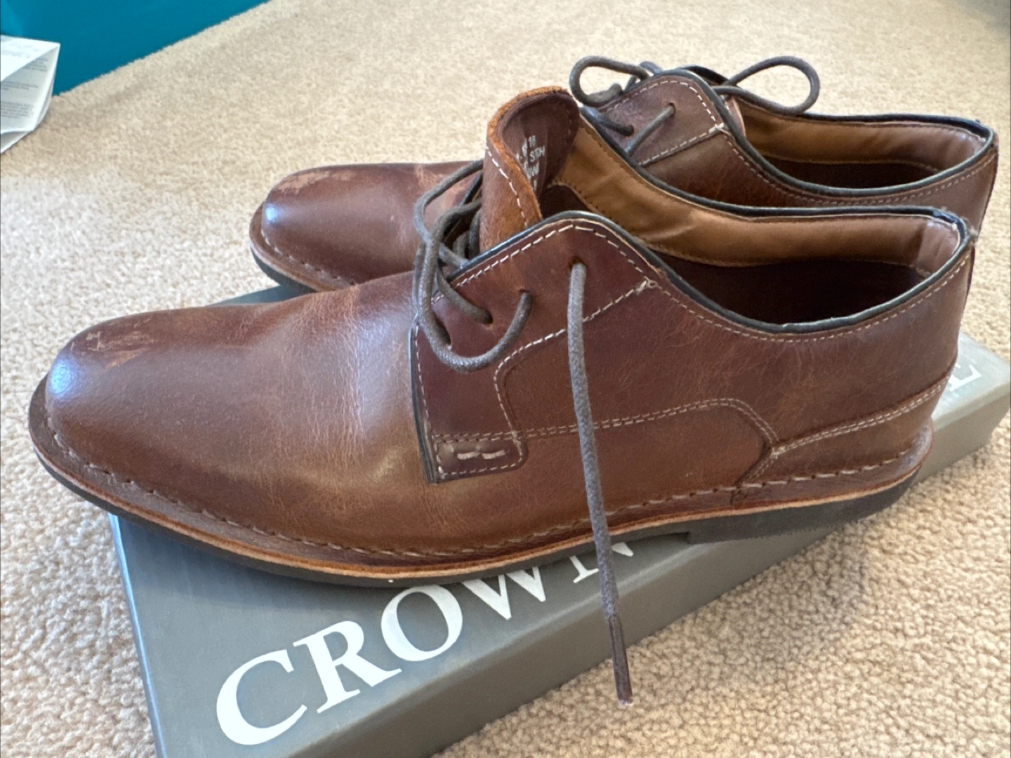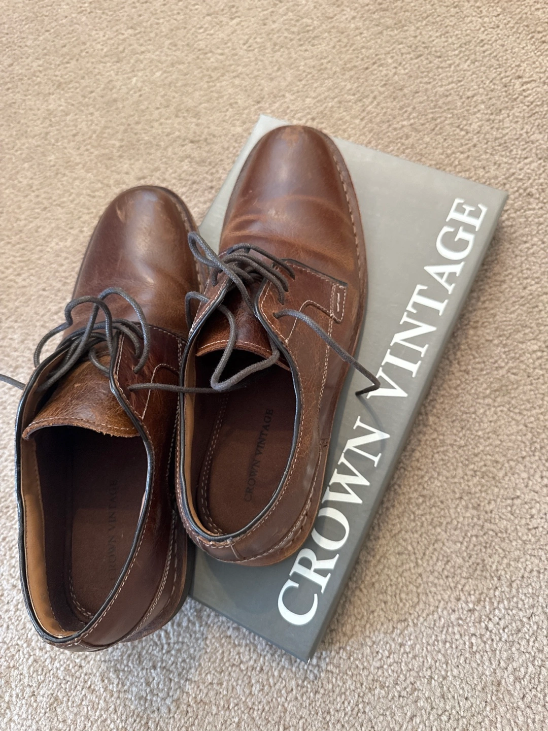 Selling a pair of Crown Vintage Leitchworth dress shoes in brown. They are a size 9. The shoes come with the original box. They are in good condition, worn once for Grad!