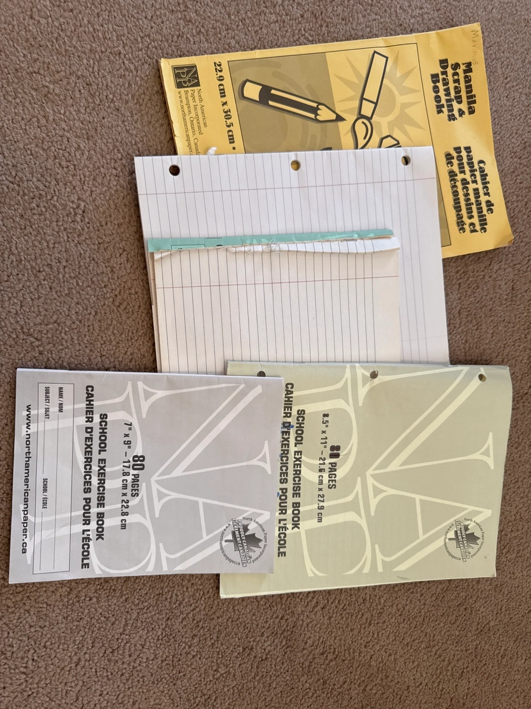FREE. school exercise books from North American Paper. There's a manila scrap & drawing book (22.9 cm x 30.5 cm) and two school exercise books (8.5" x 11" - 21.6 cm x 27.9 cm and 7" x 9" - 17.8 cm x 22.8 cm) with 80 pages each. Great for school or home!