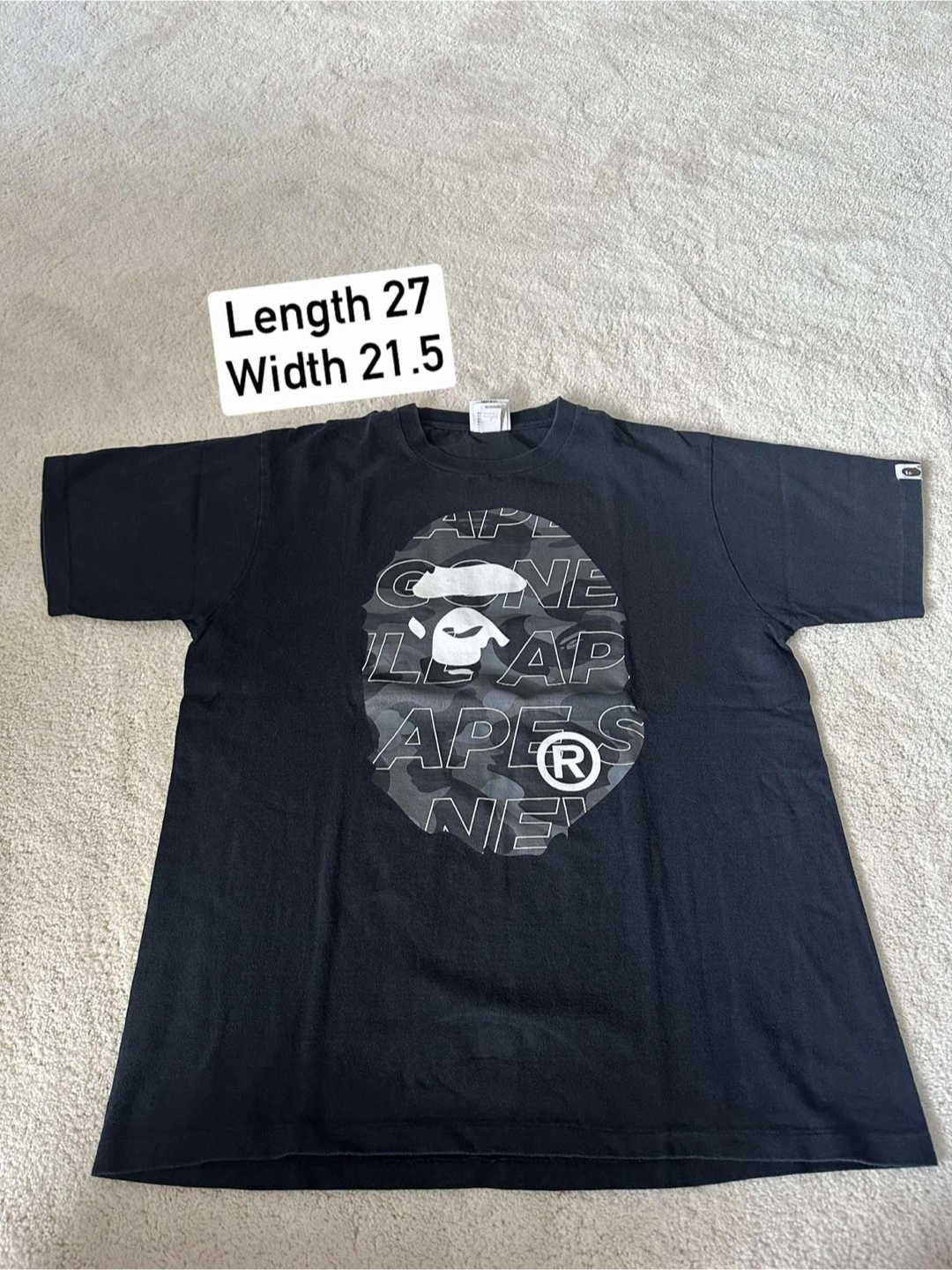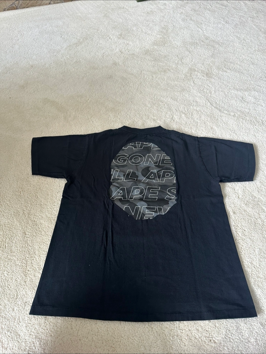 Selling a black BAPE t-shirt in size large. It features the iconic BAPE logo design on the front and back. The shirt is in great condition and ready for a new home!