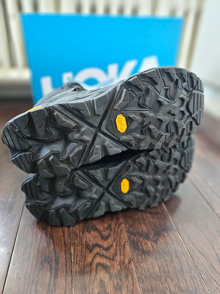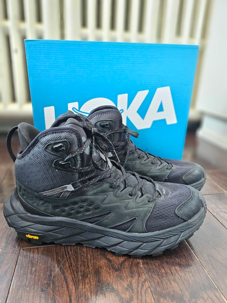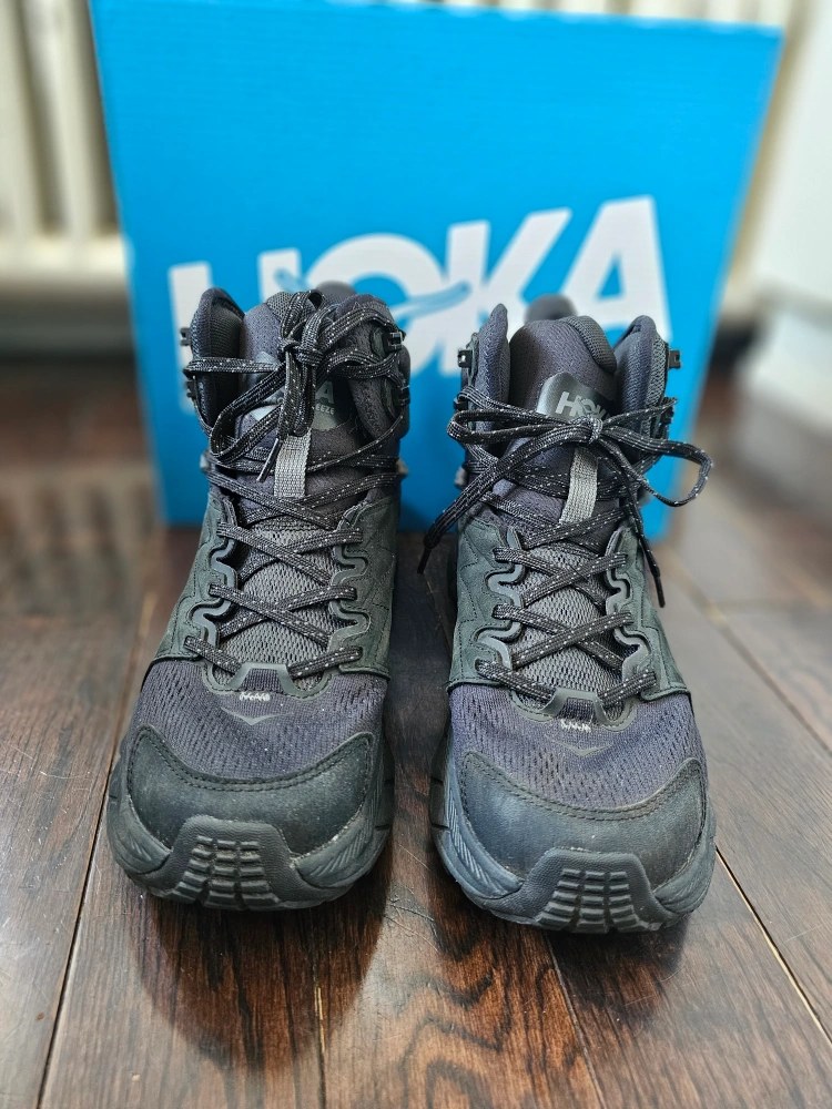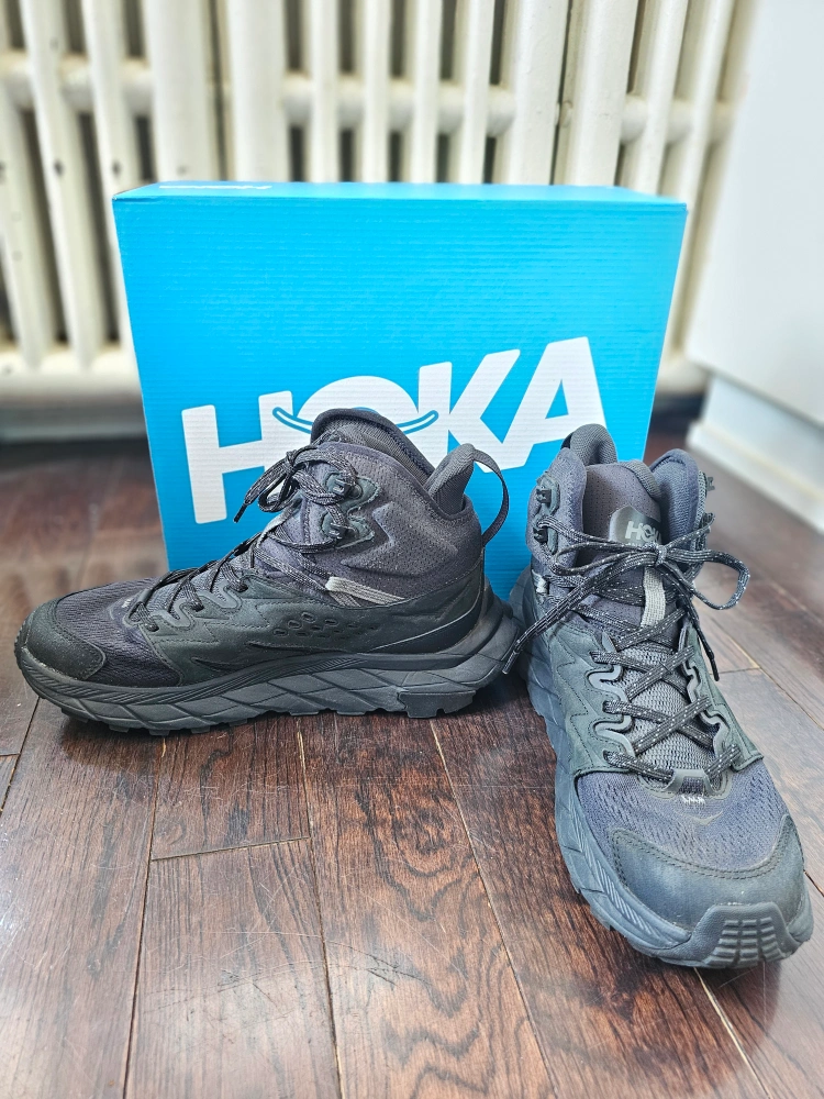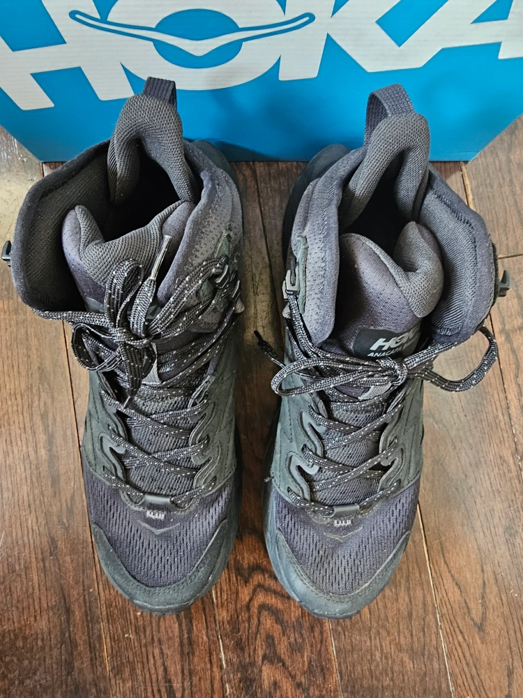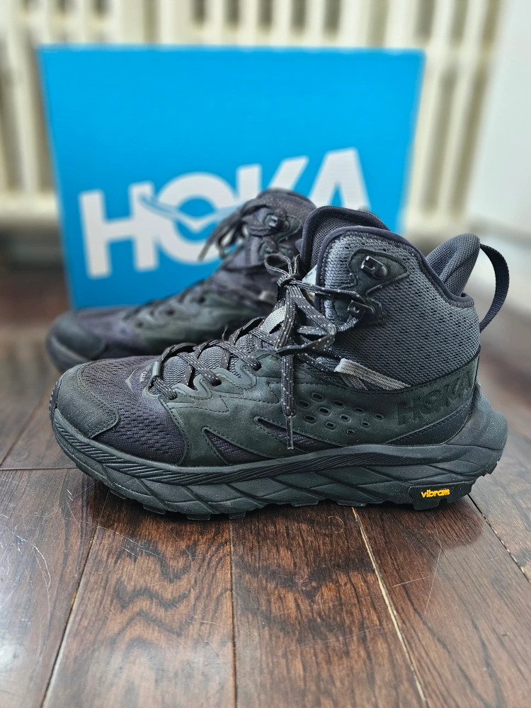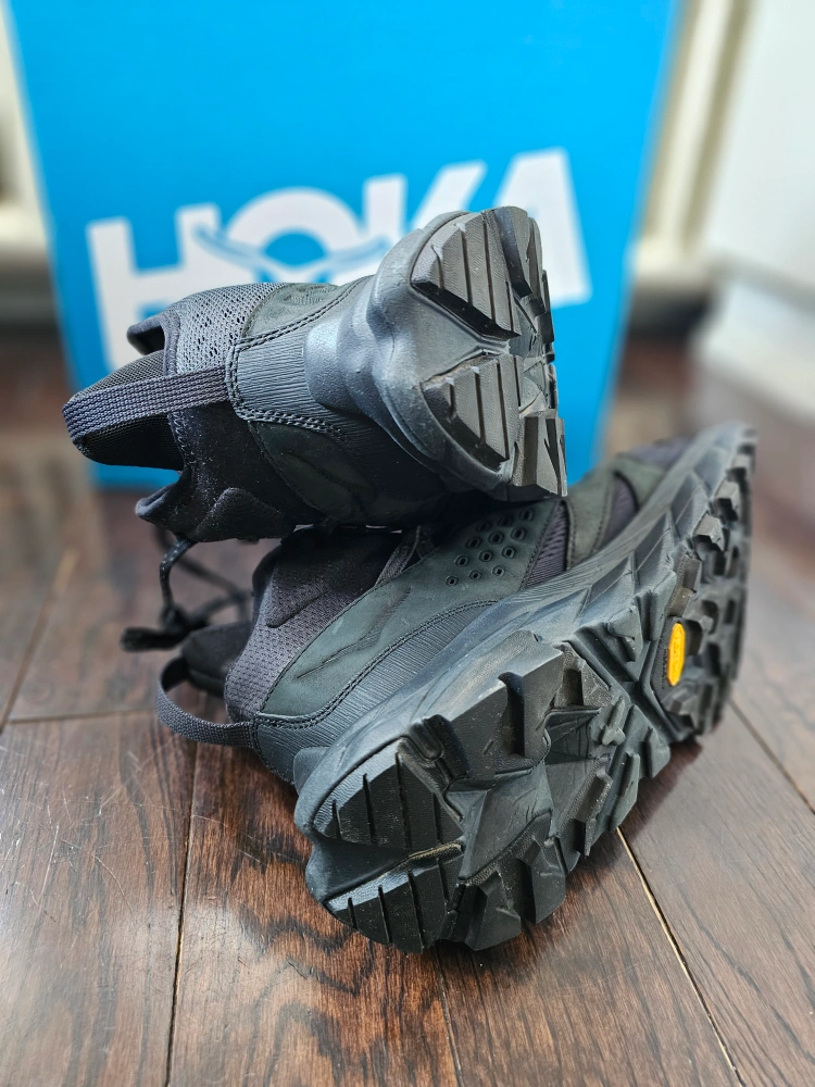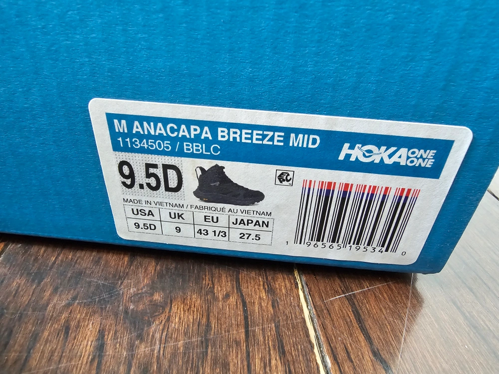 Experience ultimate comfort and foot-friendly orthopedic support with HOKA men's Anacapa Breeze Mid black hiking shoes. Shoes are in like new condition, they were worn once for a couple of hours but turned out to be the wrong size and we missed the return window. From the HOKA website: "Light. Airy. Addictively Comfortable. Back and more breathable than ever, the Anacapa returns with an ultra-ventilated upper and the same sharp focus on sustainability. Engineered for warmer climates, the Breeze Mid adopts a 100% rPET engineered knit upper, lateral Ariaprene® collar, and the same iconic HUBBLE® heel geometry and Vibram® Megagrip outsole that made its predecessor a trail icon. Engineered air mesh with 100% recycled yarns For enhanced breathability in warmer climates Compression molded EVA foam midsole Engineered for lightweight cushioning Hubble® heel geometry Ensures smoother heel-to-toe transitions SwallowTail® heel Forked heel allows for easy adjustment on uneven terrain Vibram® Megagrip outsole Provides traction on variable terrain"