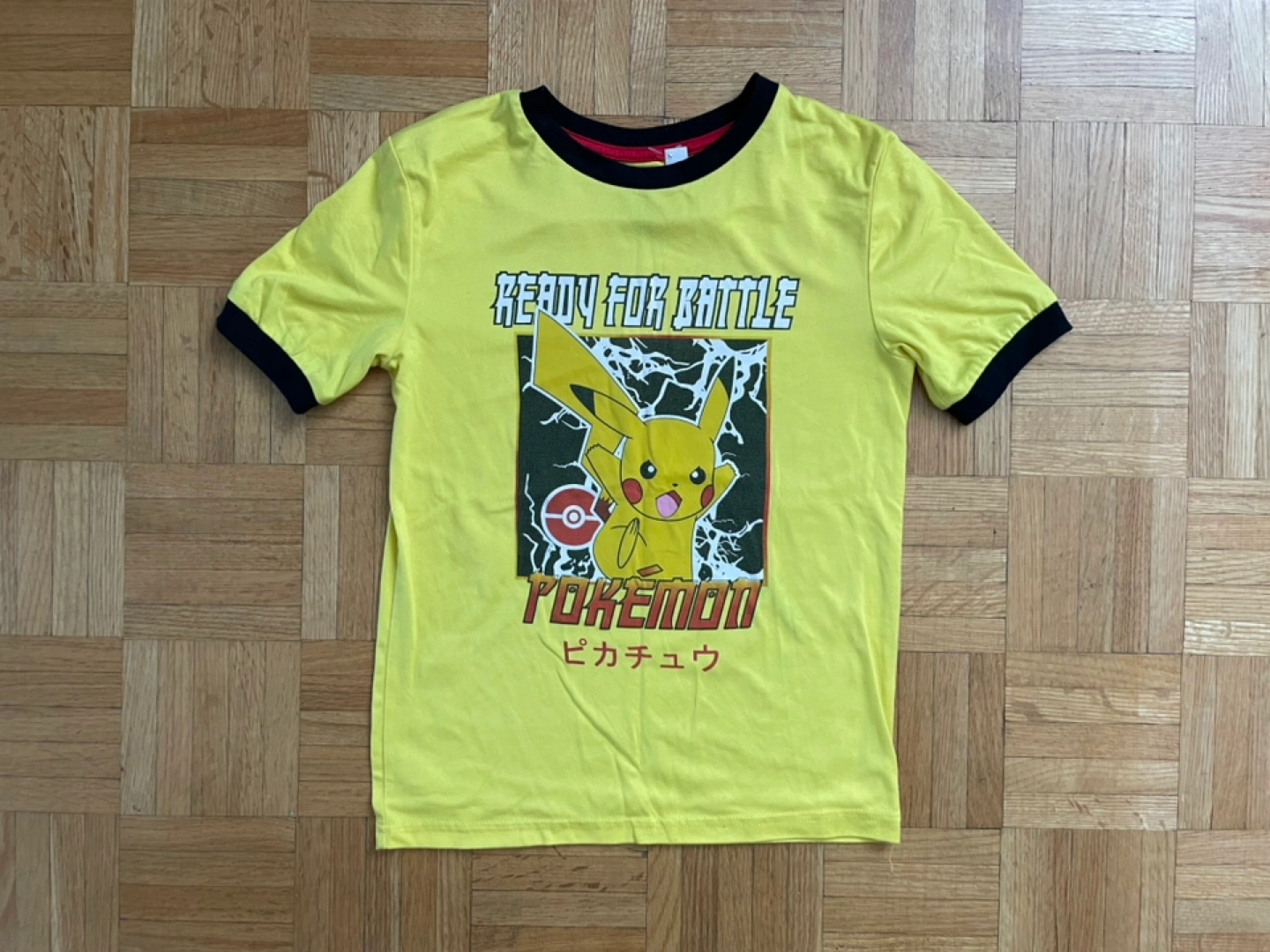 A fun yellow t-shirt featuring Pikachu from Pokémon! The shirt has black trim around the neck and sleeves. Great for any Pokémon fan!