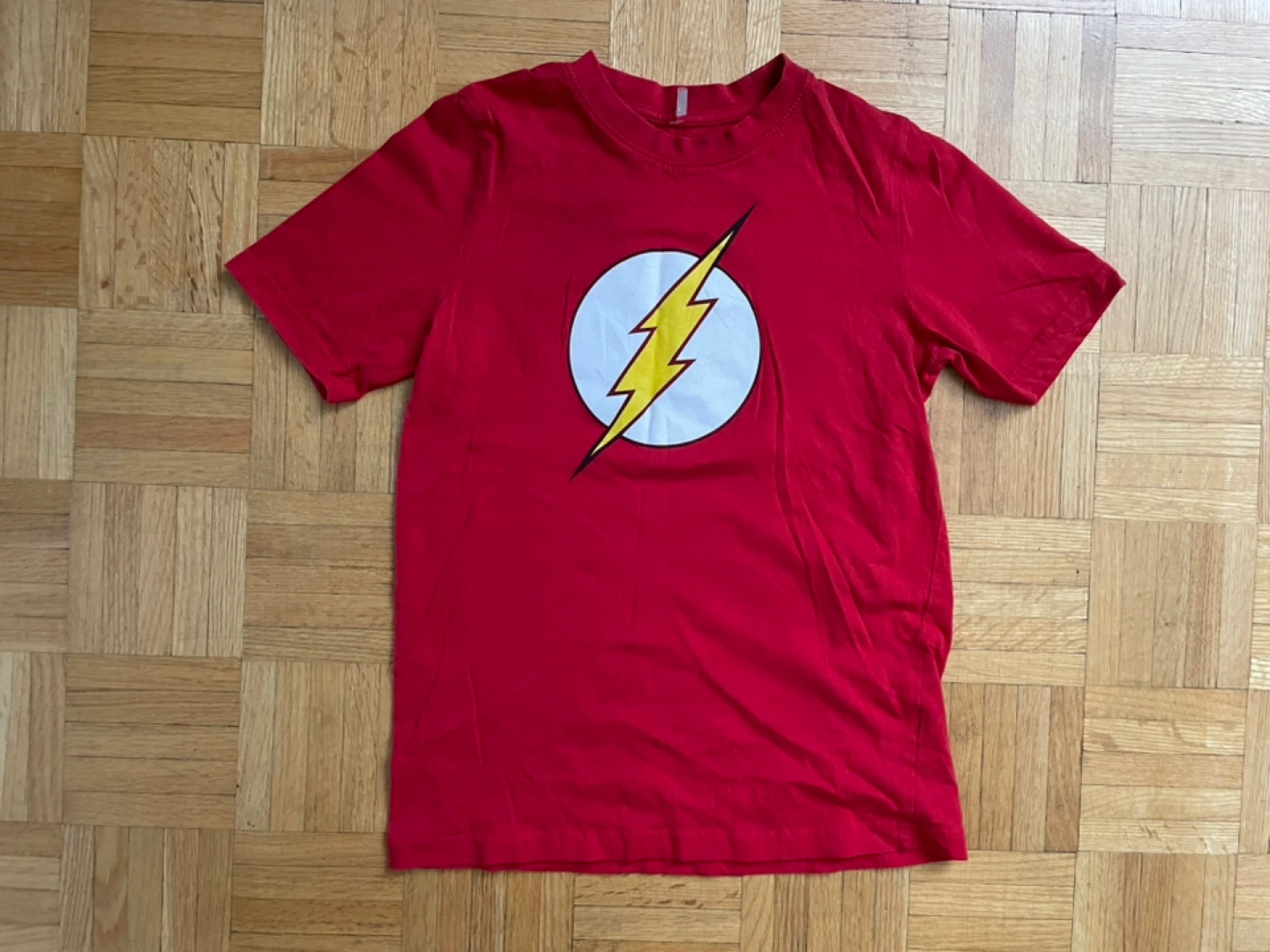 Selling a red t-shirt with The Flash logo on it! It's in great condition and perfect for any fan of the superhero