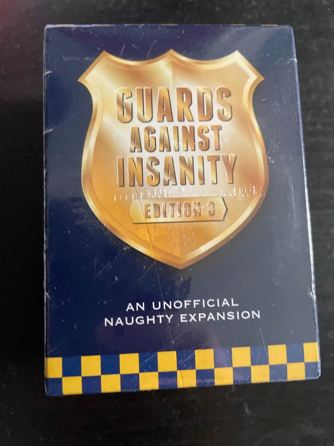 Guards Against Insanity Edition 3 expansion card game! It's an unofficial naughty expansion for ages 17+. It can be played in 0.5-1.5 hours with 4-20+ players. It includes 22 black question cards and 90 white answer cards Game