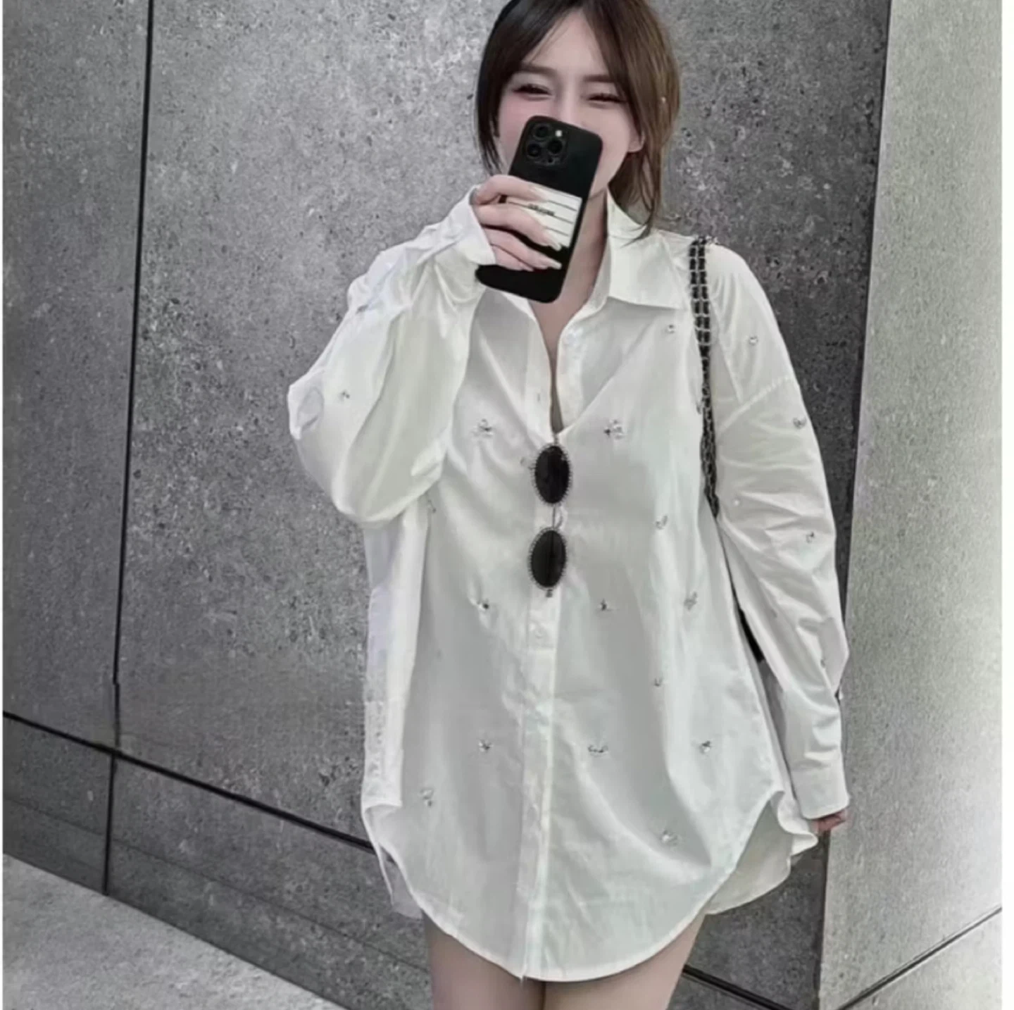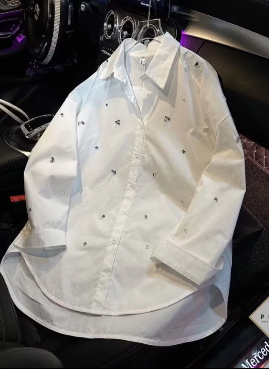 A stylish white button-down shirt is up for grabs! It has a relaxed fit and is adorned with subtle embellishments. Perfect for a casual yet put-together look, whether you're heading to brunch or a day out
