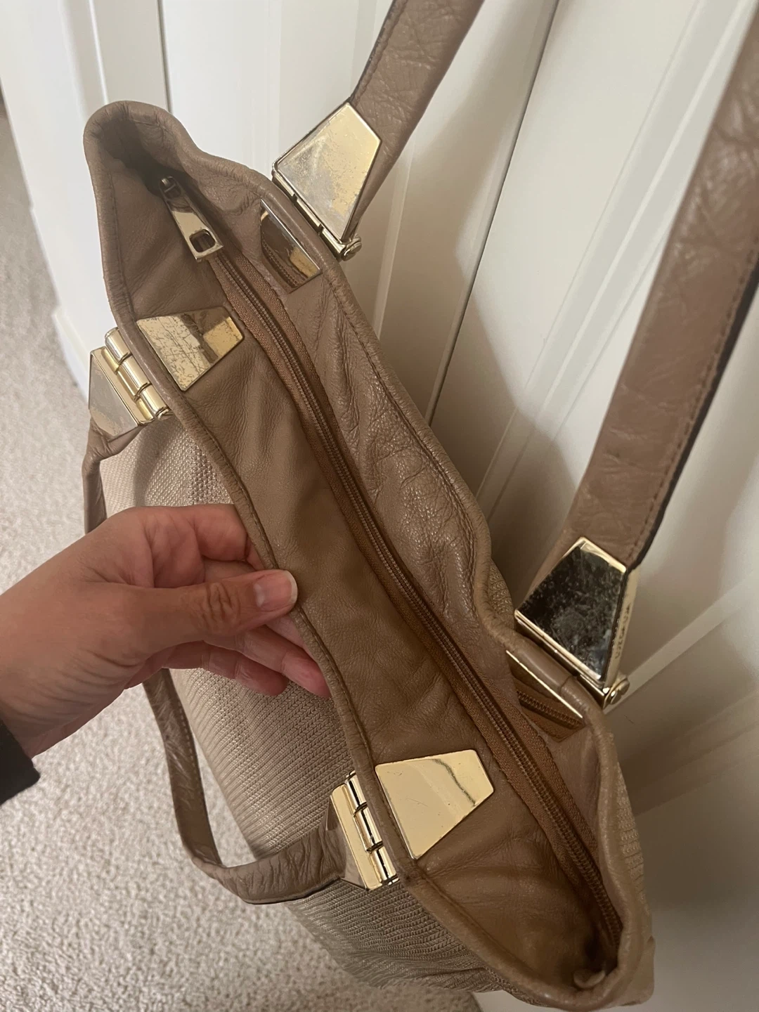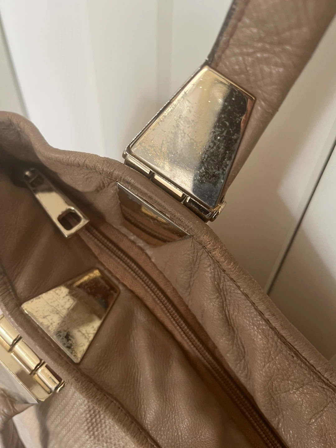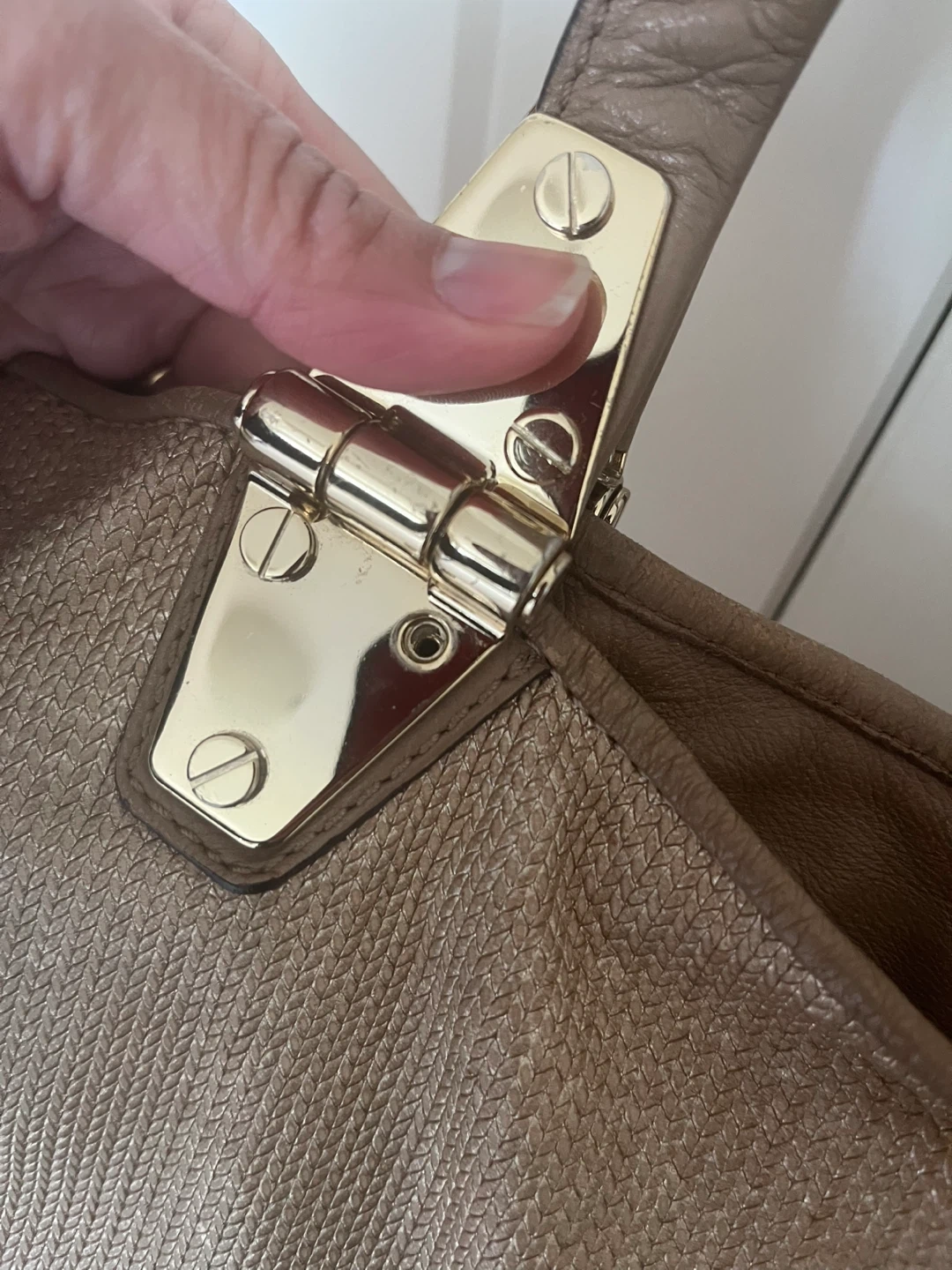 Selling a Luz da Lua bag. It has beautiful light brown and golden tones and unique design. Soft genuine leather with lots pf internal space. It’s in good used condition. But lots of life left. Some scuff and a missing screw as show in pictures.