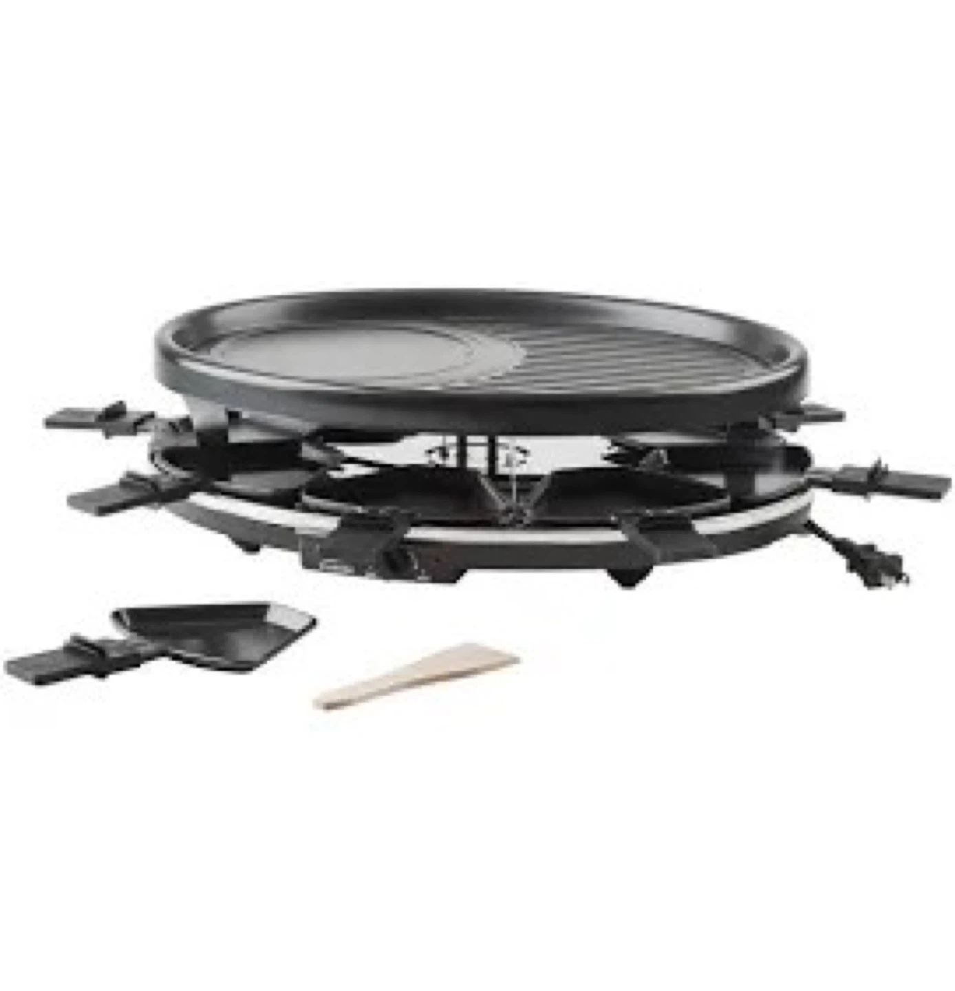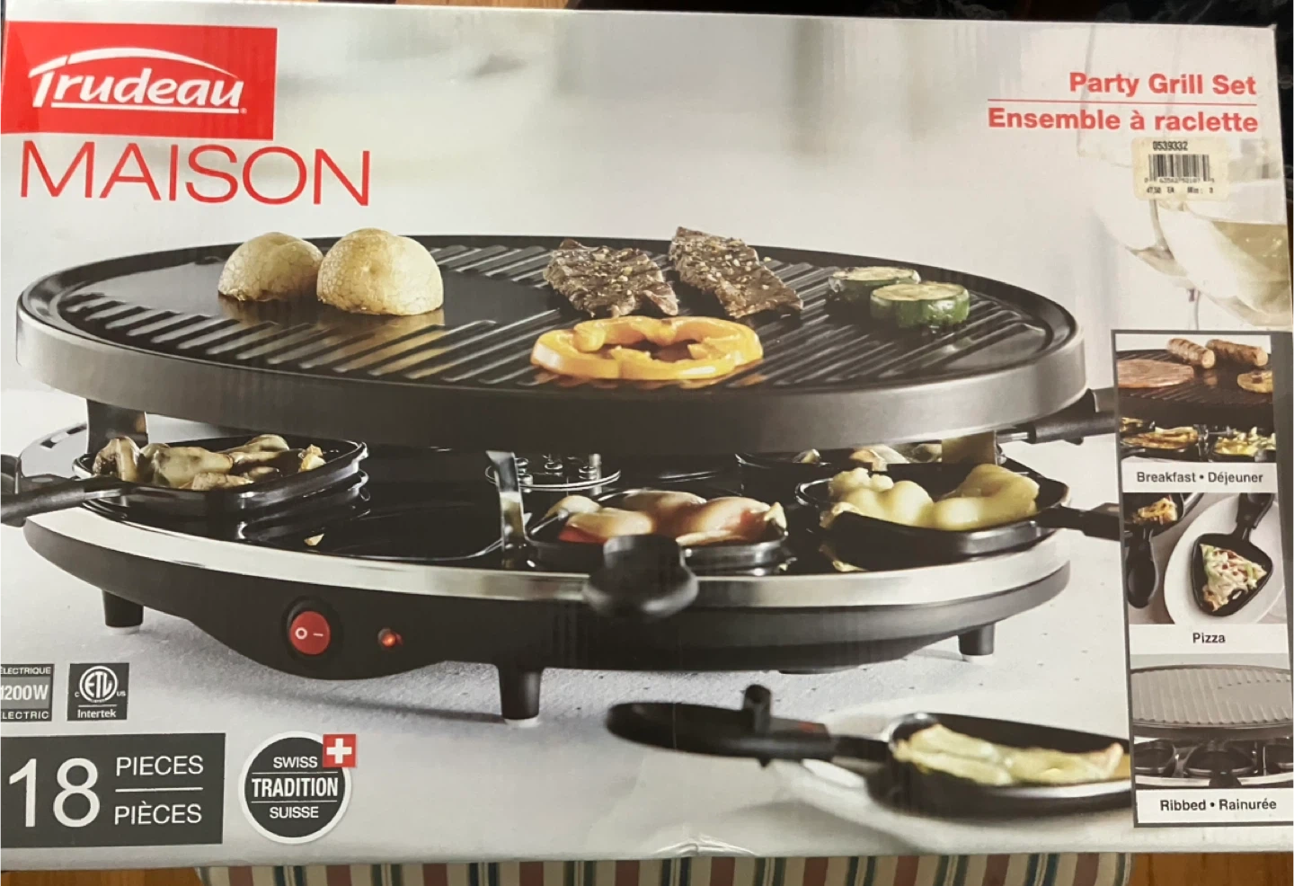 I'm selling a Trudeau Maison Party Grill Set! It's perfect for a fun night with friends and family. This raclette set includes 18 pieces, so everyone can join in the cooking. It features a 200W electric grill with a ribbed surface, ideal for grilling meats and veggies. Enjoy making breakfast, lunch, or even pizza right at your table!