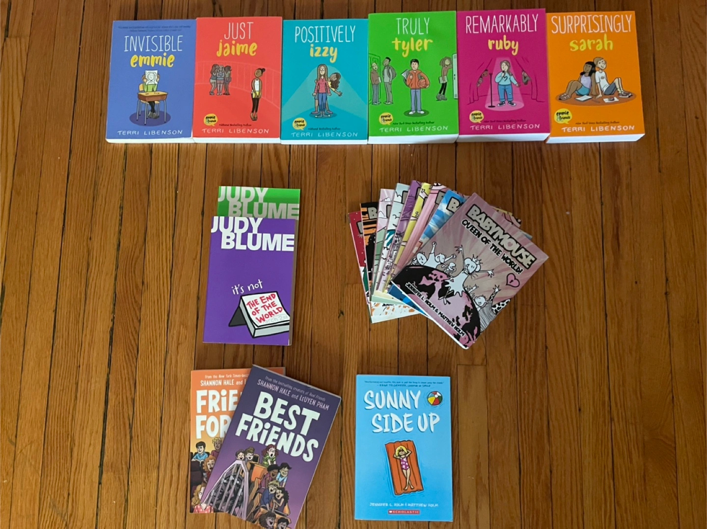 Selling “lots” of kids' books! $5 and up… $30 Set 1 Terry Libenson Series: - Invisible Emmie - Just Jaime - Positively Izzy - Truly Tyler - Remarkably Ruby - Surprisingly Sarah $5 Set 2 Judy Blume: - It's Not the End of the World - Then Again Maybe I Won’t $20 Set 3 Babymouse: #1 Queen of the World + 8 others $15 Set 4 Various Graphic Novels: - Friends for Life - Best Friends - Sunny Side Up