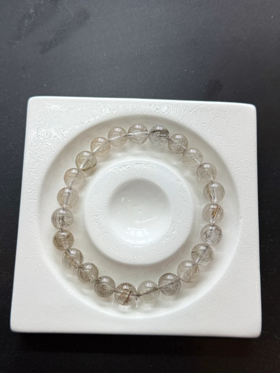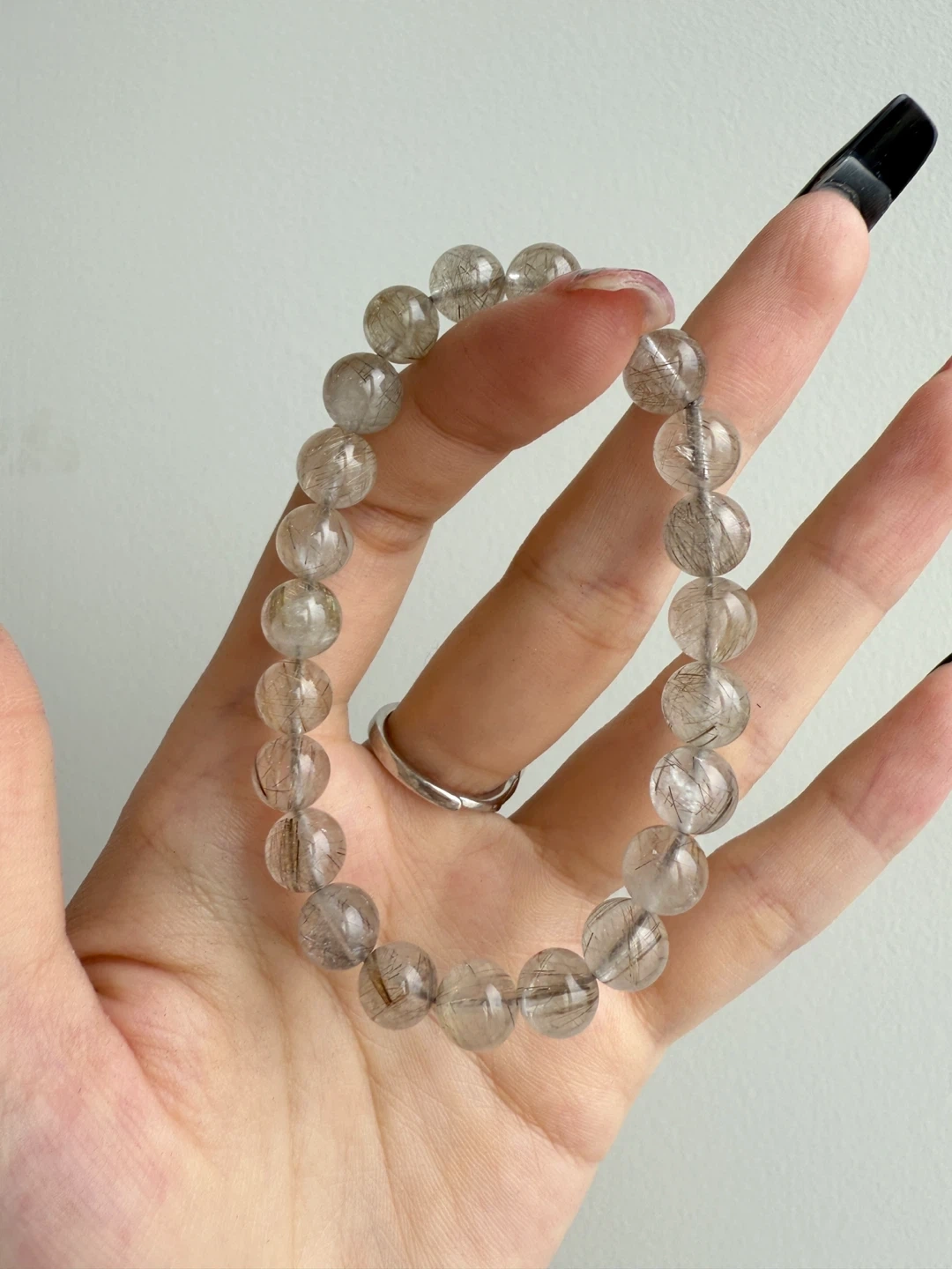 High quality crystal bracelet with reasonable price and special designs. High Clarity Silver/Golden/Black mixed Rutilated Quartz! 1️⃣Crystal size: 8+ mm Wrist size: 15 cm Can customizable wrist circumference Rutilated Quartz is a clear quartz crystal embedded with fine, silvery-white/ golden/ black rutile (titanium dioxide) inclusions. These needle-like threads glisten like strands of moonlight and are remarkably rare, making this crystal both visually striking and energetically potent. It symbolizes wealth and power, can enhance personal confidence and decisiveness, and help leaders unite teams and develop their careers. It also has the power to ward off evil spirits and bring good luck, dispel negative emotions and energy, and attract unexpected wealth. 📩 DM for customize bracelet