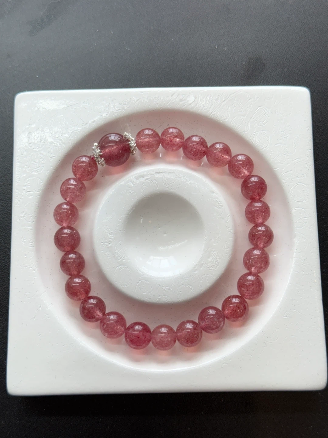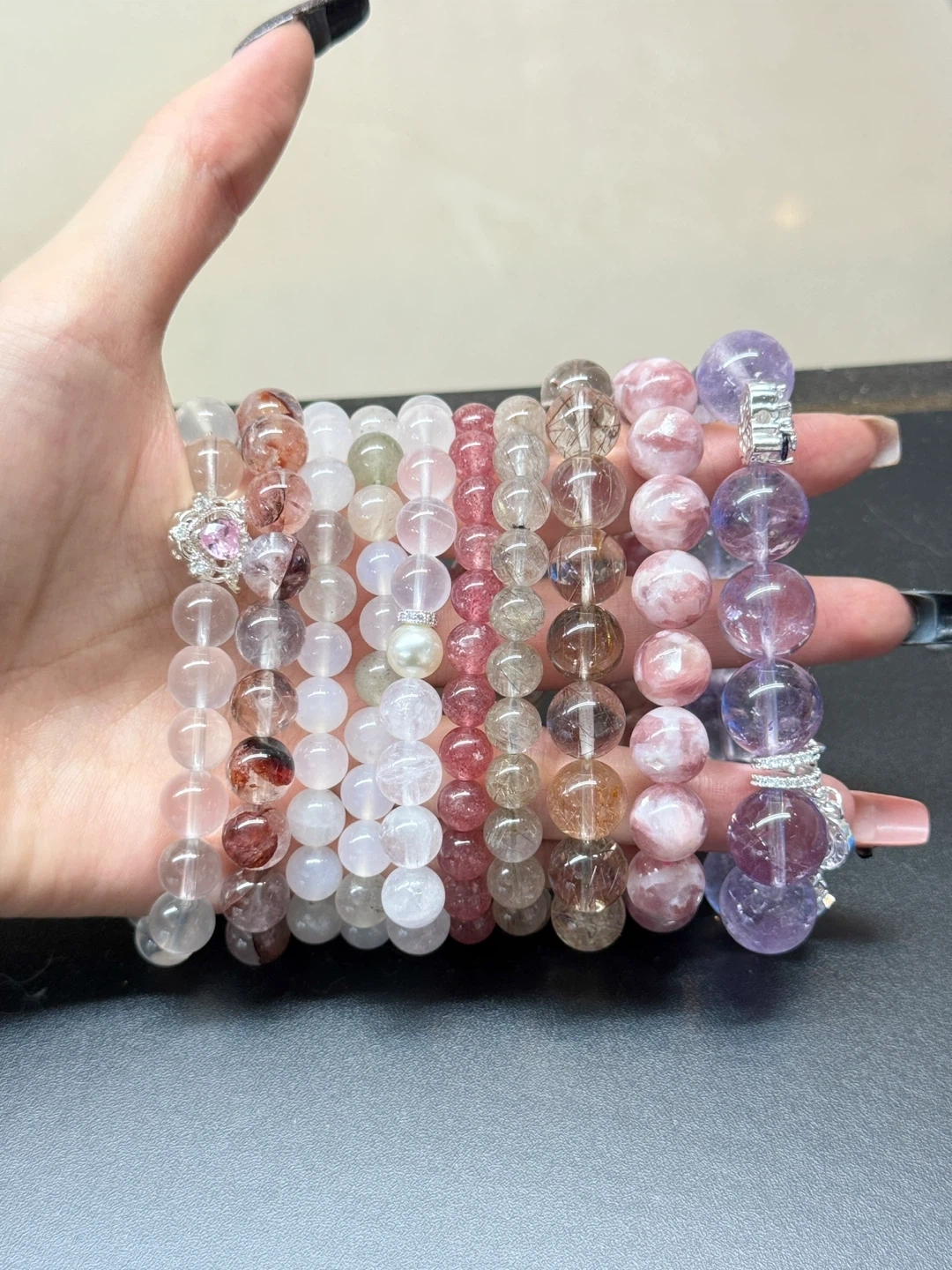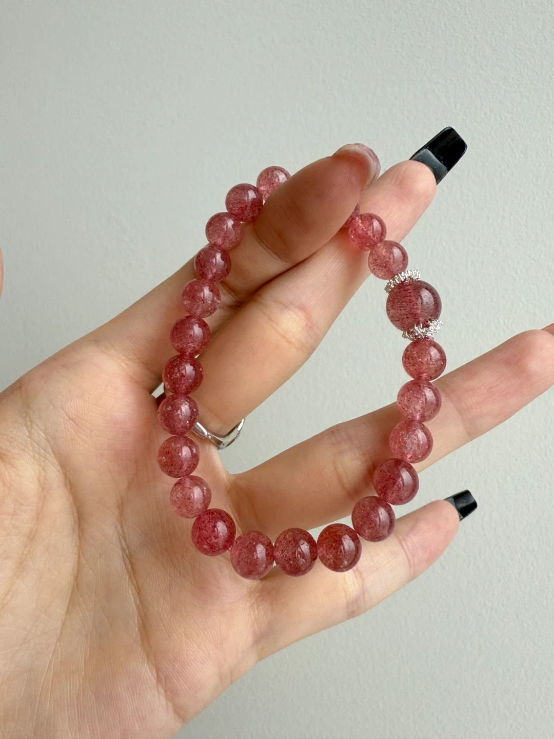 High quality crystal bracelet with reasonable price and special designs. Crystal size: 8mm+ top 10mm Wrist size: 15cm Can customizable wrist circumference. Strawberry Quartz is a rare variety of quartz crystal with a soft pink hue, often containing fine red or reddish-brown mineral inclusions that resemble tiny strawberry seeds. Strawberry Quartz represents sweet love, positive energy, and emotional healing. Wearing on the left hand. š© DM for customize bracelet