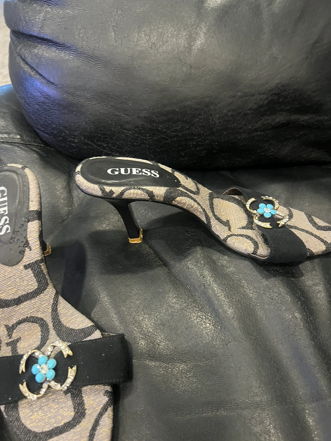 Cute pair of Guess heels in size 6. They feature a black and beige pattern with a decorative flower detail. Perfect for dressing up!