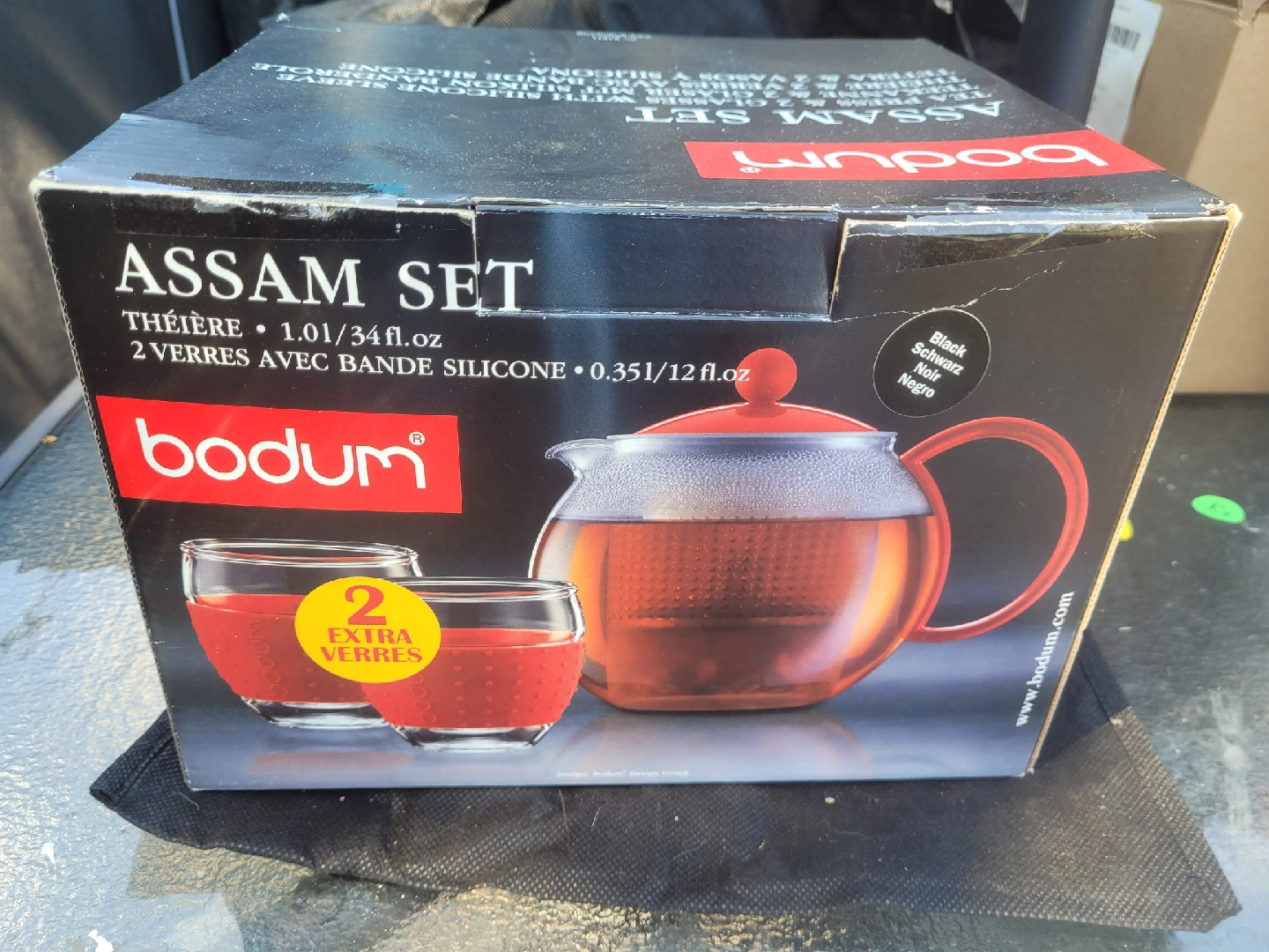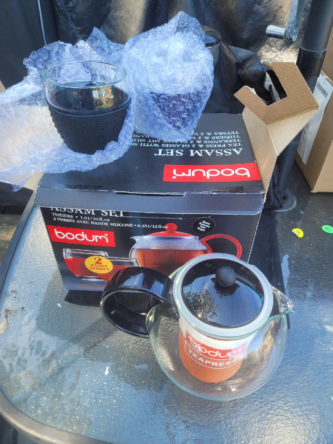 Selling a Bodum Assam Tea Set, which includes a 1.0L teapot and two glasses with silicone sleeves! The teapot has a capacity of 1.01/34 fl.oz, and the glasses are 0.35l/12 fl.oz each. It comes with 2 extra sleeves. The set is in great condition still wrapped and ready for a new home!