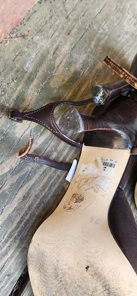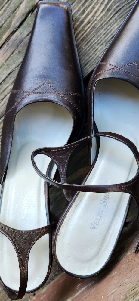 These are Velez Shoes heels in a dark brown colour. They are a size 7. The heel .bit worn. They are in used condition.