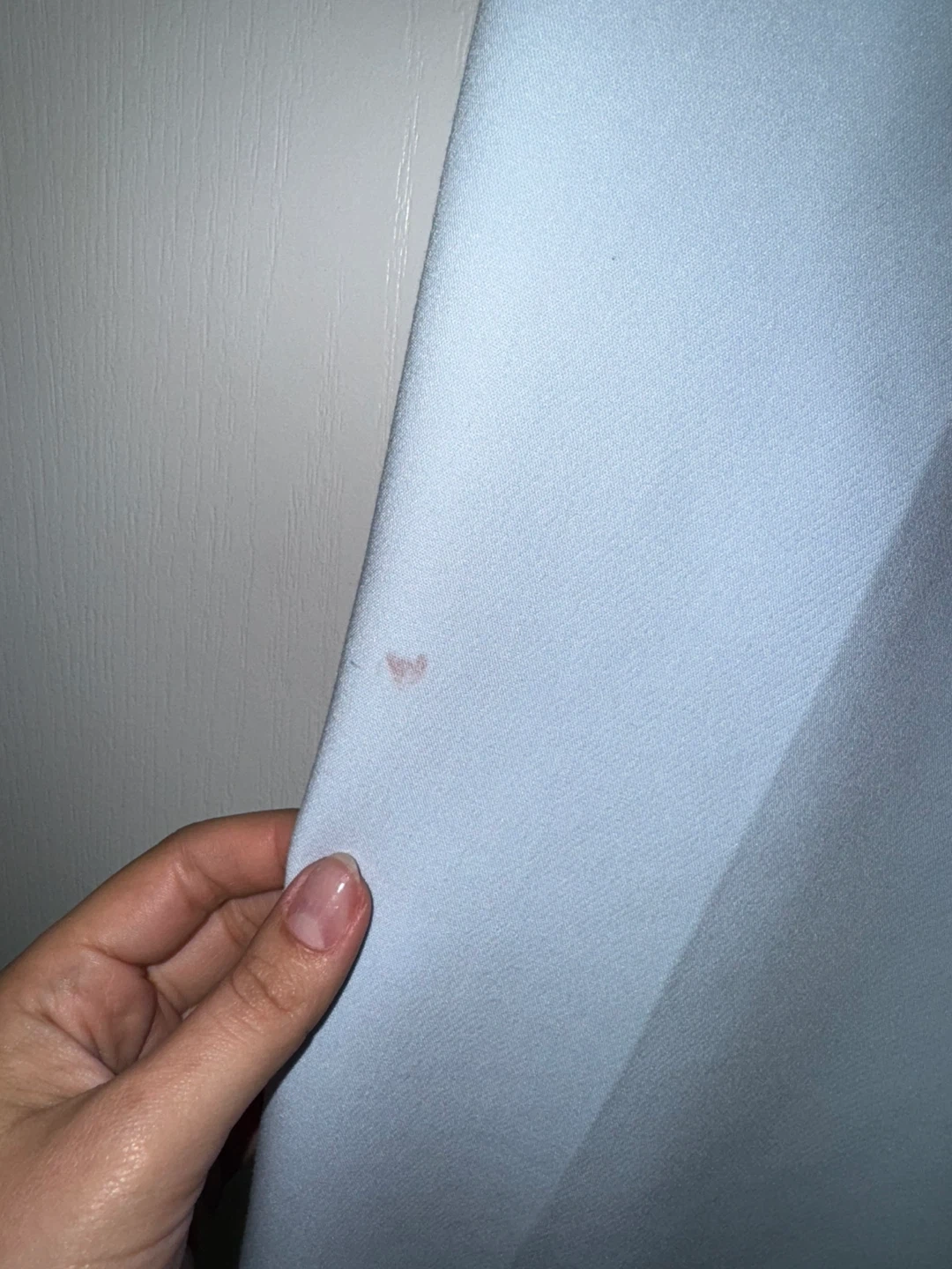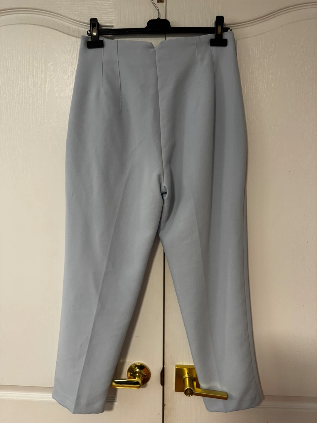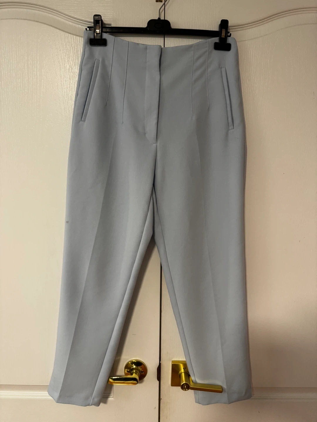 Selling a pair of Zara trousers in light blue. They are size L and show a small stain as pictured. Still in good condition otherwise!