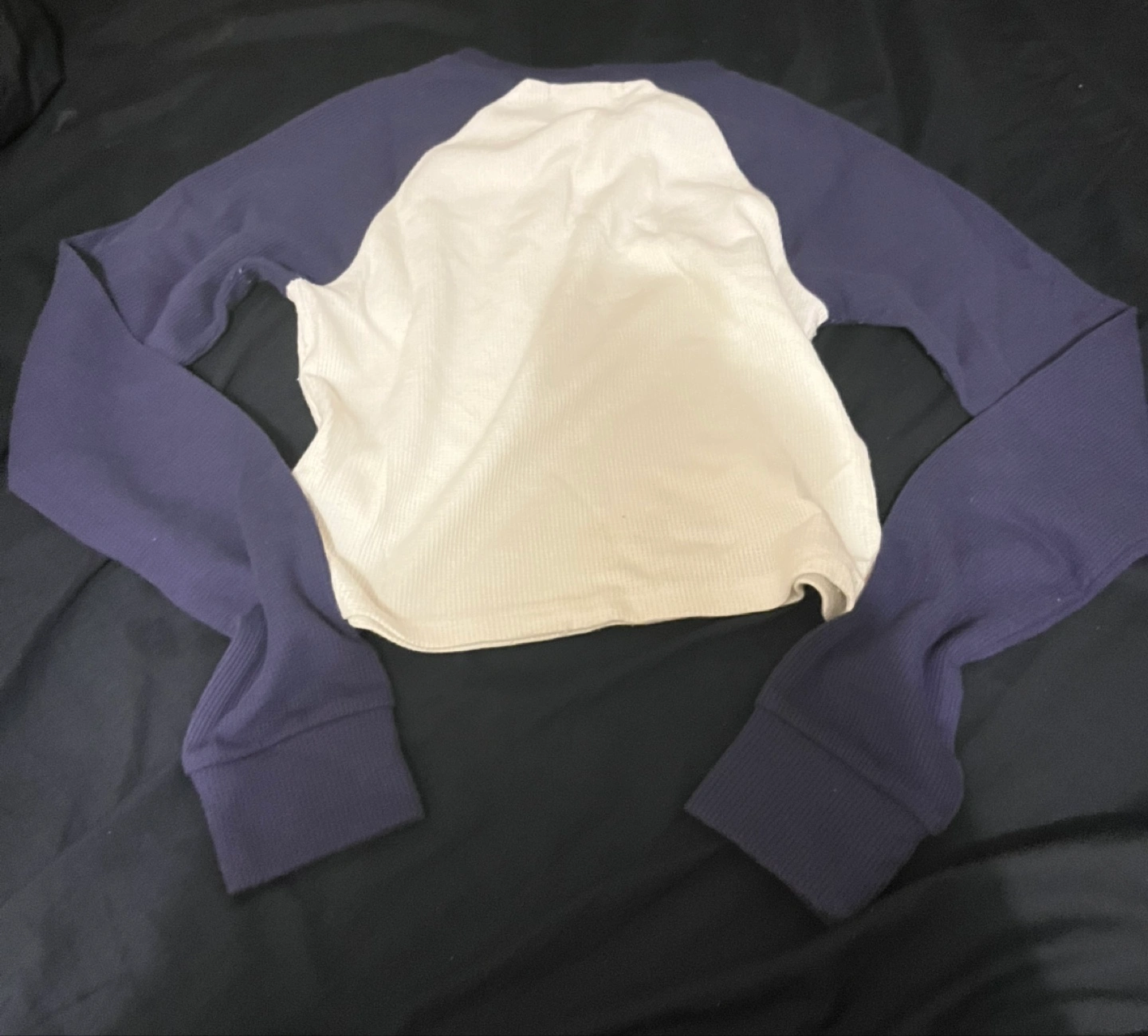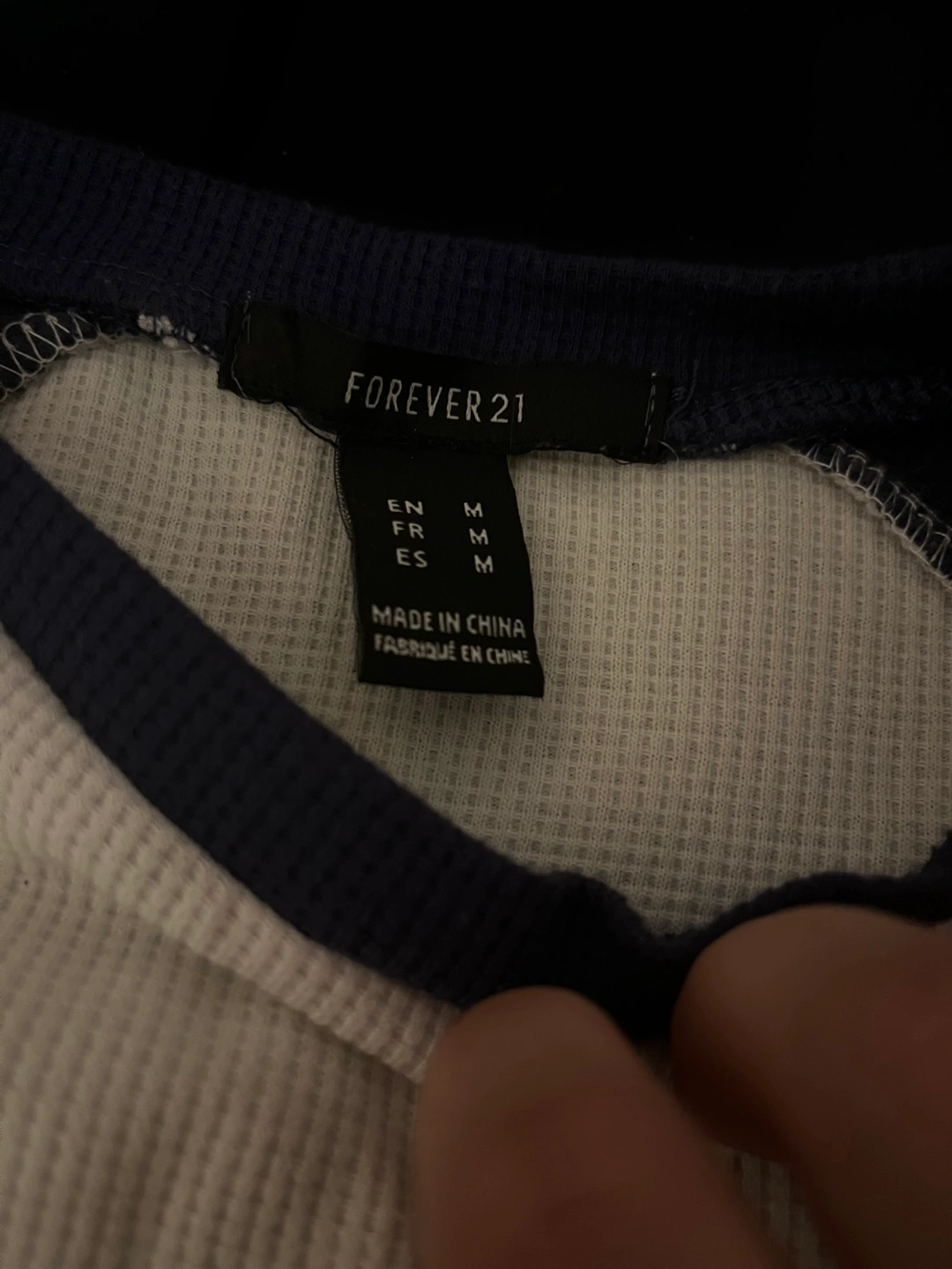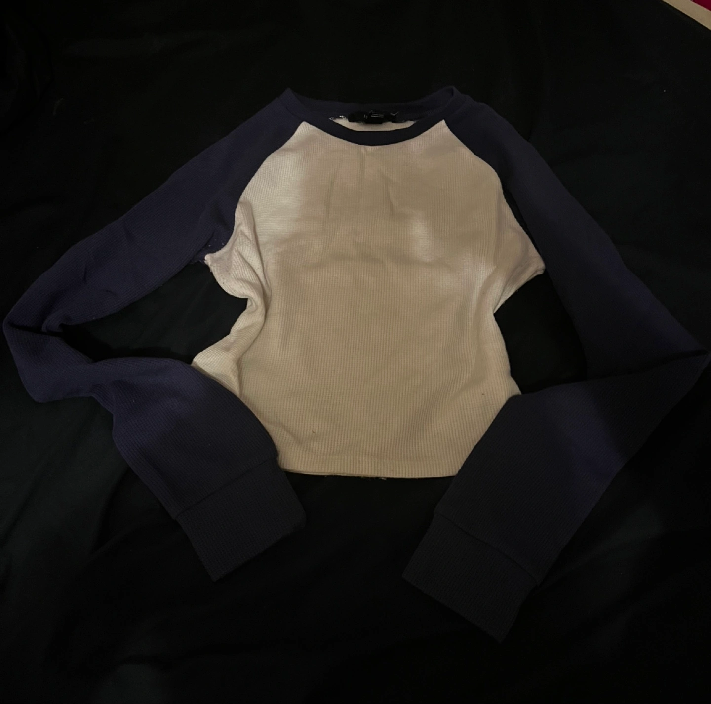 Cute Forever 21 crop top! It's a size medium and has a waffle knit texture with navy blue sleeves and trim. Only worn once or twice.