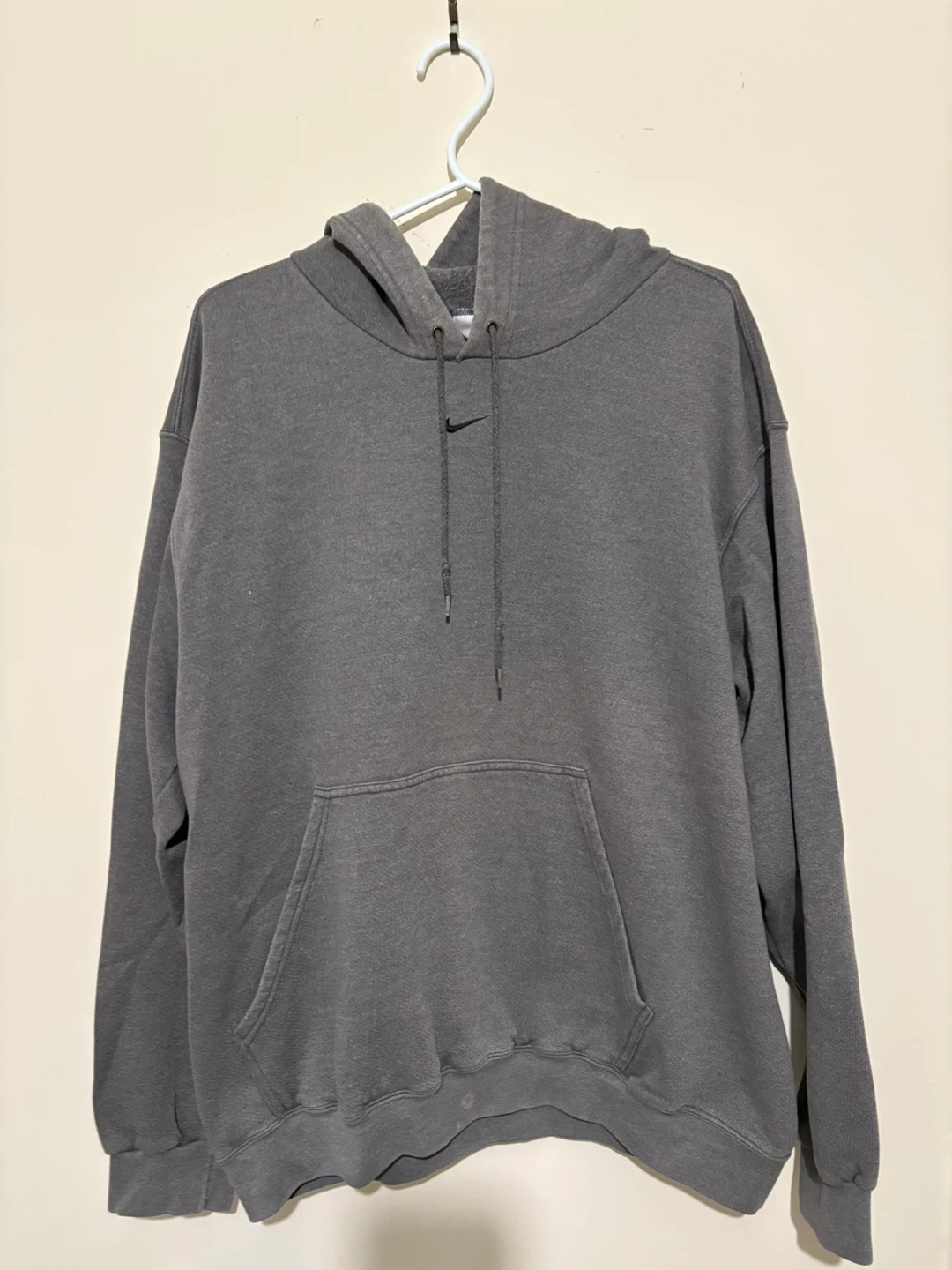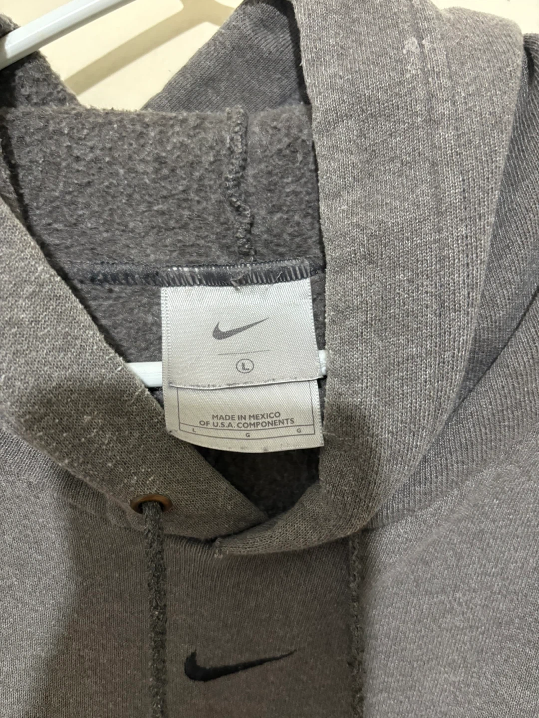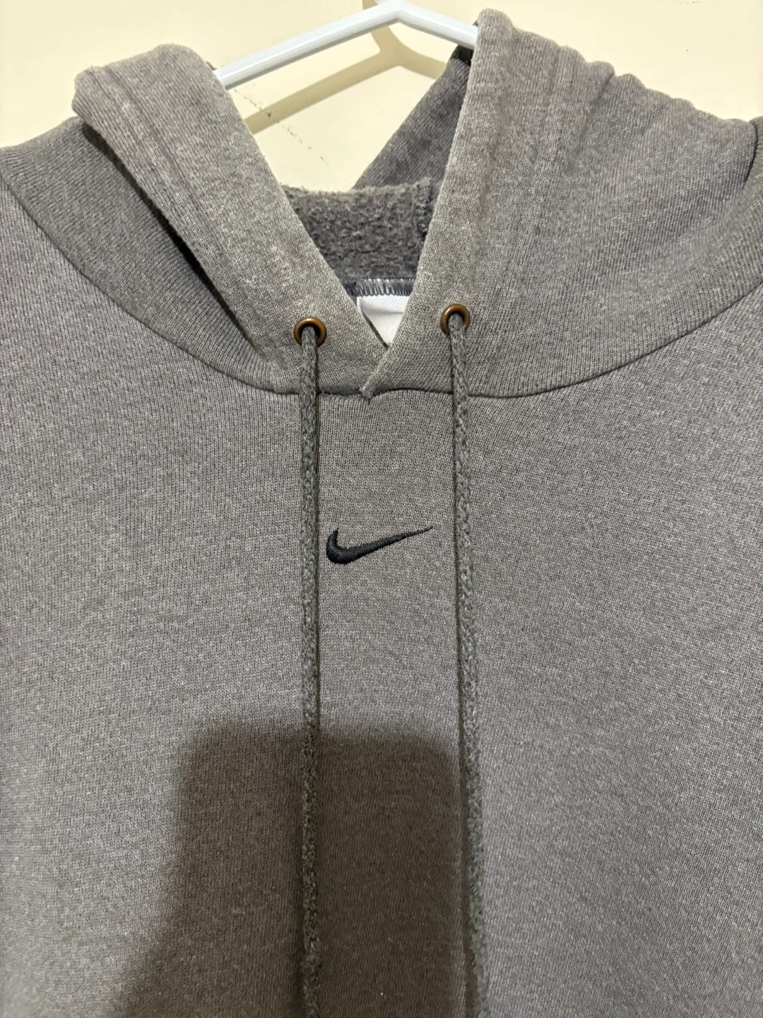 Nike Men’s Vintage 90s Hoodie Sweatshirt, Size Large, Center Swoosh. Pre-owned – Good condition. Features a small stain near the bottom. Dark grey color. Hard-to-find piece.