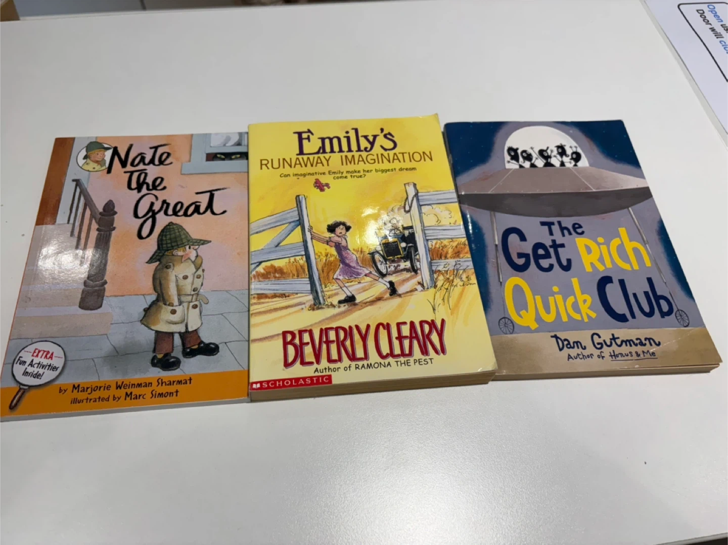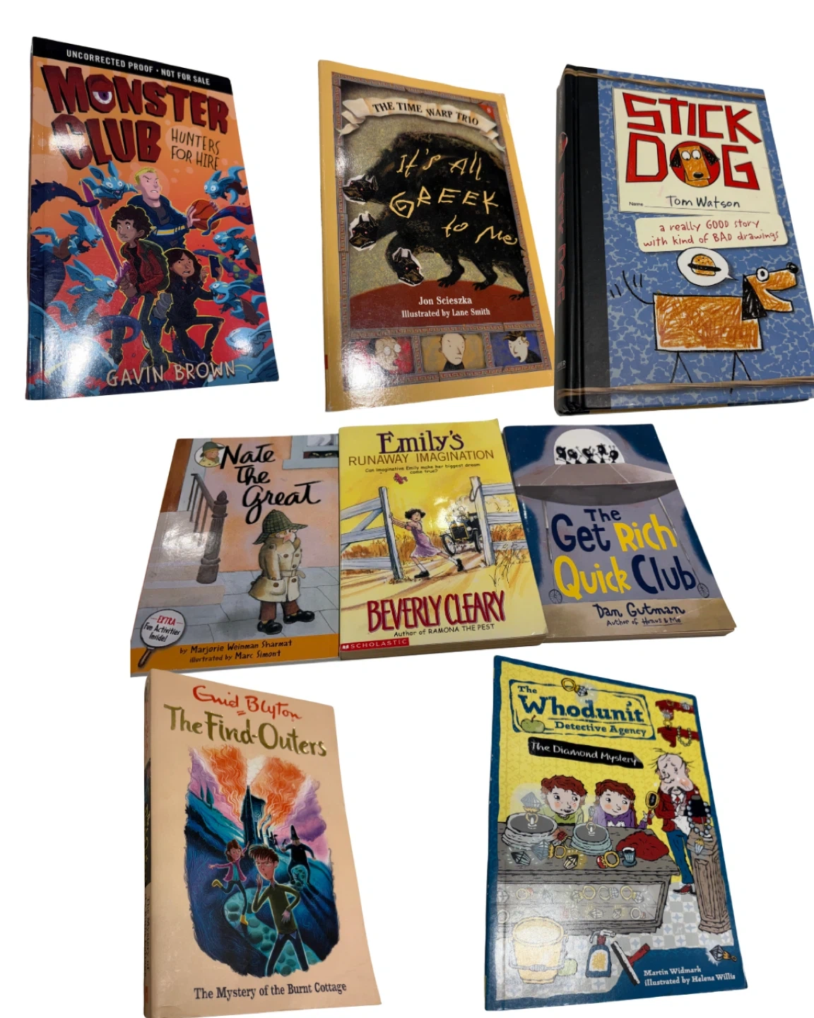 $5 each except all Greek to me and monster club $10 each 1. The Find-Outers: The Mystery of the Burnt Cottage – Enid Blyton • First published in 1943, this is the first book in the Five Find-Outers and Dog series (often just called The Find-Outers). • A classic British mystery series where children solve crimes, often outsmarting the bumbling village policeman, Mr. Goon. • Your edition looks like a modern reprint with updated cover art. ⸻ 2. Monster Club: Hunters for Hire – Gavin Brown • A more recent children’s adventure book. • Your copy is marked “Uncorrected Proof – Not for Sale”, which makes it a pre-publication review copy (ARC). • Collectors sometimes find ARC editions valuable, especially if the book/author becomes very popular. ⸻ 3. The Whodunit Detective Agency: The Diamond Mystery – Martin Widmark, illustrated by Helena Willis • A Swedish children’s mystery series (LasseMaja’s Detective Agency in the original). • This book is the first in the series, first published in Sweden in 2002; English translation by Gecko Press came later. • Aimed at young readers who enjoy solving puzzles along with the characters. ⸻ 4. Stick Dog: A Really Good Story with Kind of Bad Drawings – Tom Watson • First in the Stick Dog series (2013). • Illustrated in a doodle-style notebook format, aimed at fans of Diary of a Wimpy Kid. • Sparked multiple sequels featuring Stick Dog and his canine gang. ⸻ 5. The Time Warp Trio: It’s All Greek to Me – Jon Scieszka, illustrated by Lane Smith • Part of the Time Warp Trio series (Book 8). • First published in 1999, these books follow three boys who time-travel with the help of a magical book. • This volume drops them into ancient Greece with monsters like Cerberus. ⸻ 6. Nate the Great – Marjorie Weinman Sharmat, illustrated by Marc Simont • First in the classic Nate the Great detective series, originally published in 1972. • Aimed at early readers; Nate solves small neighborhood mysteries with his dog, Sludge. ⸻ 7. Emily’s Runaway Imagination – Beverly Cleary • Standalone novel (not part of the Ramona or Henry Huggins series). • First published in 1961, inspired by Cleary’s own Oregon childhood. • Follows Emily, a small-town girl with big dreams. ⸻ 8. The Get Rich Quick Club – Dan Gutman • Published in 2004. • About a group of kids who decide to become millionaires by the end of the summer, leading to all kinds of humorous schemes. • Gutman is also well known for My Weird School and Honus & Me.