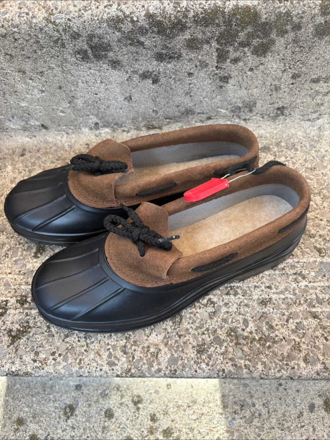 Selling a pair of Totes brand rain shoes in Women’s size 9 (Unisex). They're new never used and perfect for wet weather! Two Tone Colour - Black with Tan and Bow Accents Slip-On Rain Loafer Flat Duck Shoes / Boots. Perfect for wearing in Fall, Summer or Spring to keep your feet / socks dry. Great to wear when it’s raining, washing the car and gardening and easy to wipe clean and always look like new.