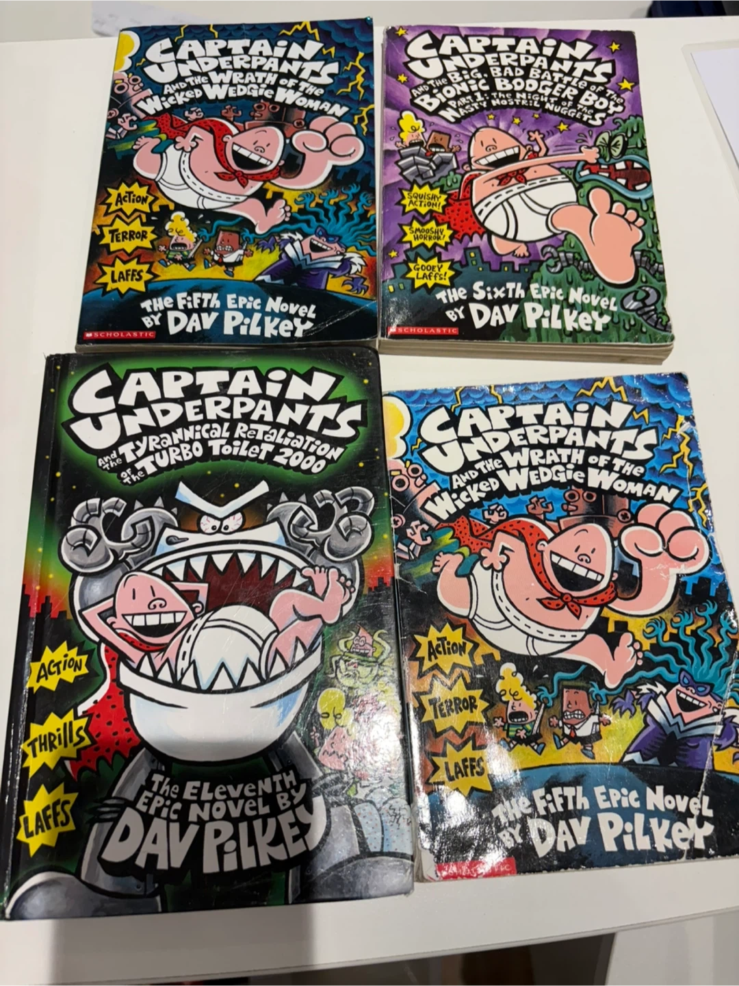 $5 each 1. Captain Underpants and the Wrath of the Wicked Wedgie Woman (Book 5, 2001) • Ms. Ribble, the boys’ teacher, gains superpowers and becomes a villainess. 2. Captain Underpants and the Big, Bad Battle of the Bionic Booger Boy Part 1: The Night of the Nasty Nostril Nuggets (Book 6, 2003) • Introduces a snot-filled villain in this gross-out, action-packed adventure. 3. Captain Underpants and the Tyrannical Retaliation of the Turbo Toilet 2000 (Book 11, 2014) • The Turbo Toilet 2000 returns for revenge in one of the later books in the series. 4. Captain Underpants and the Wrath of the Wicked Wedgie Woman (another copy of Book 5)