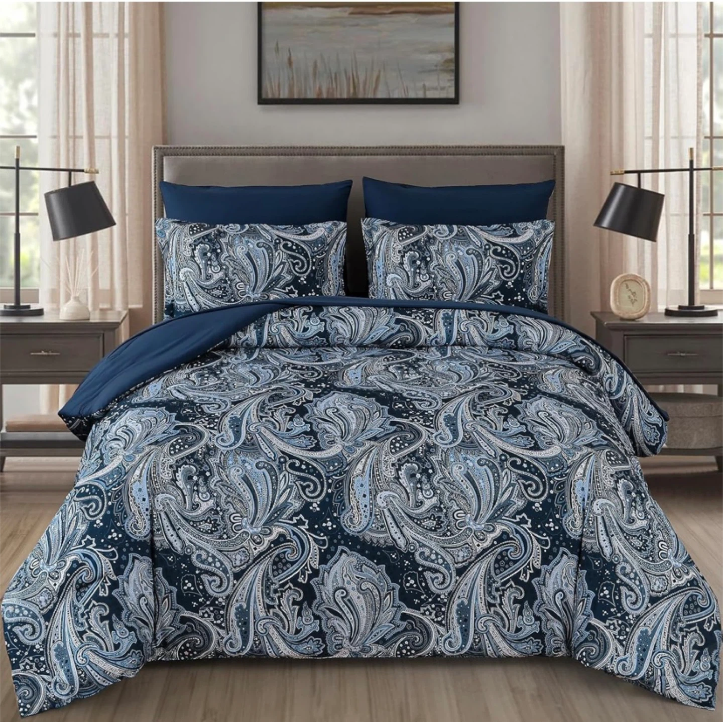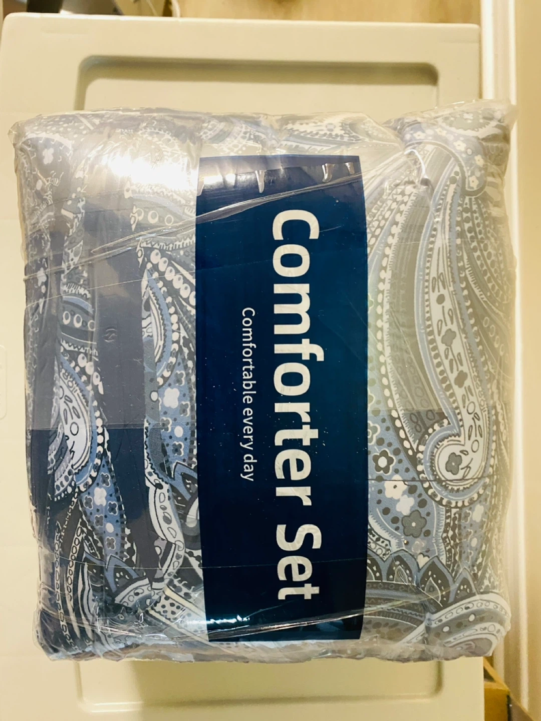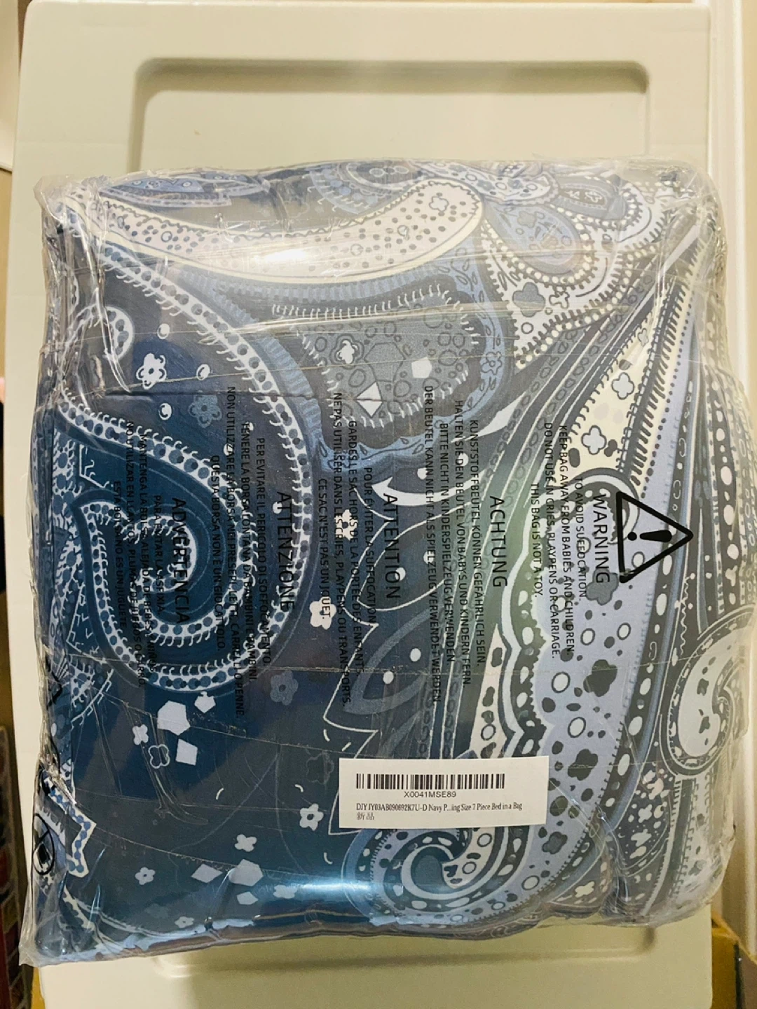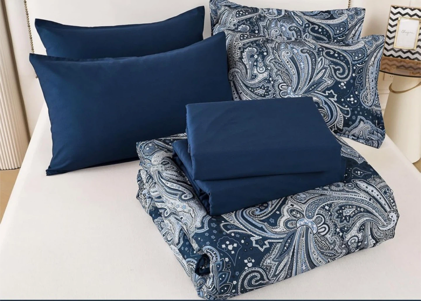 This is a D Navy Paisley 7 Piece Bed in a Bag, King Size. It's a comforter set that's comfortable every day. The set includes everything you need to make your bed look stylish and inviting! Perfect for adding a touch of elegance to your bedroom decor - 100% new, never used - new in bag