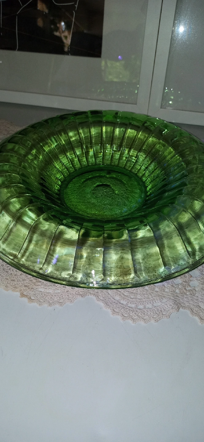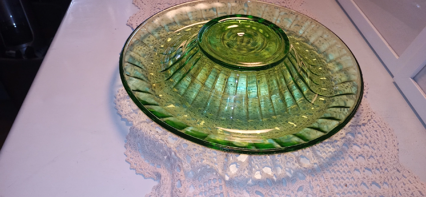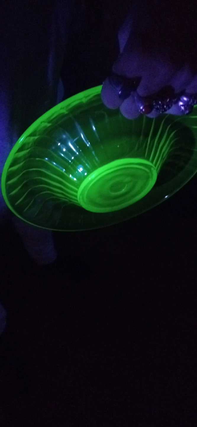 Selling a uranium glass bowl. It measures approximately 3 inches in height and 11 inches in diameter. It would look lovely as a centrepiece or as a decorative item in your home. From 1929 to 1932. No chips! Great glow under UV light. Art deco piece.