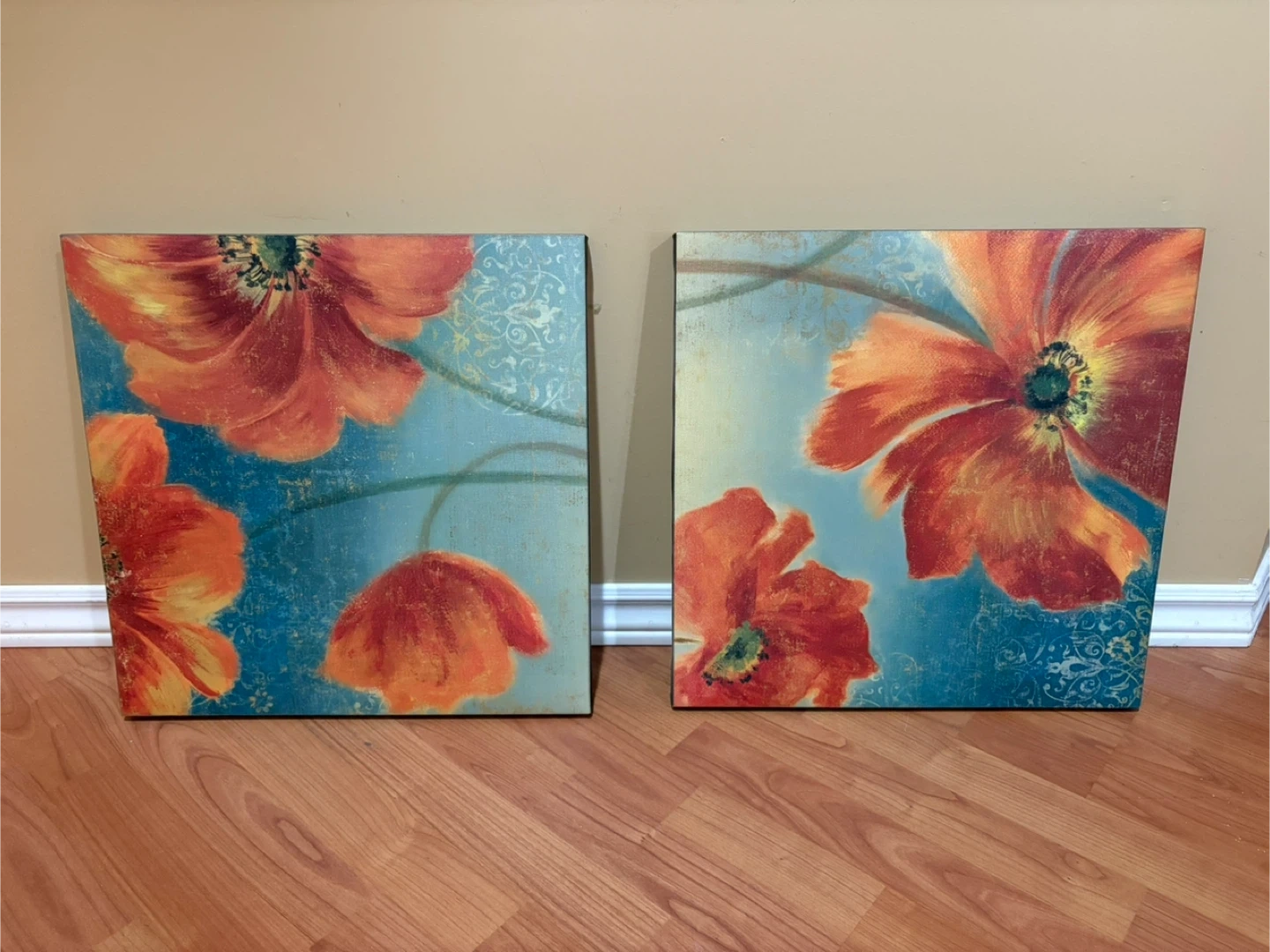 Selling a set of two beautiful canvas wall art pieces. They feature a vibrant floral design with orange flowers on a blue background. These would add a lovely pop of colour to any room! Both of them for 40$ 17.5x17.5 inches