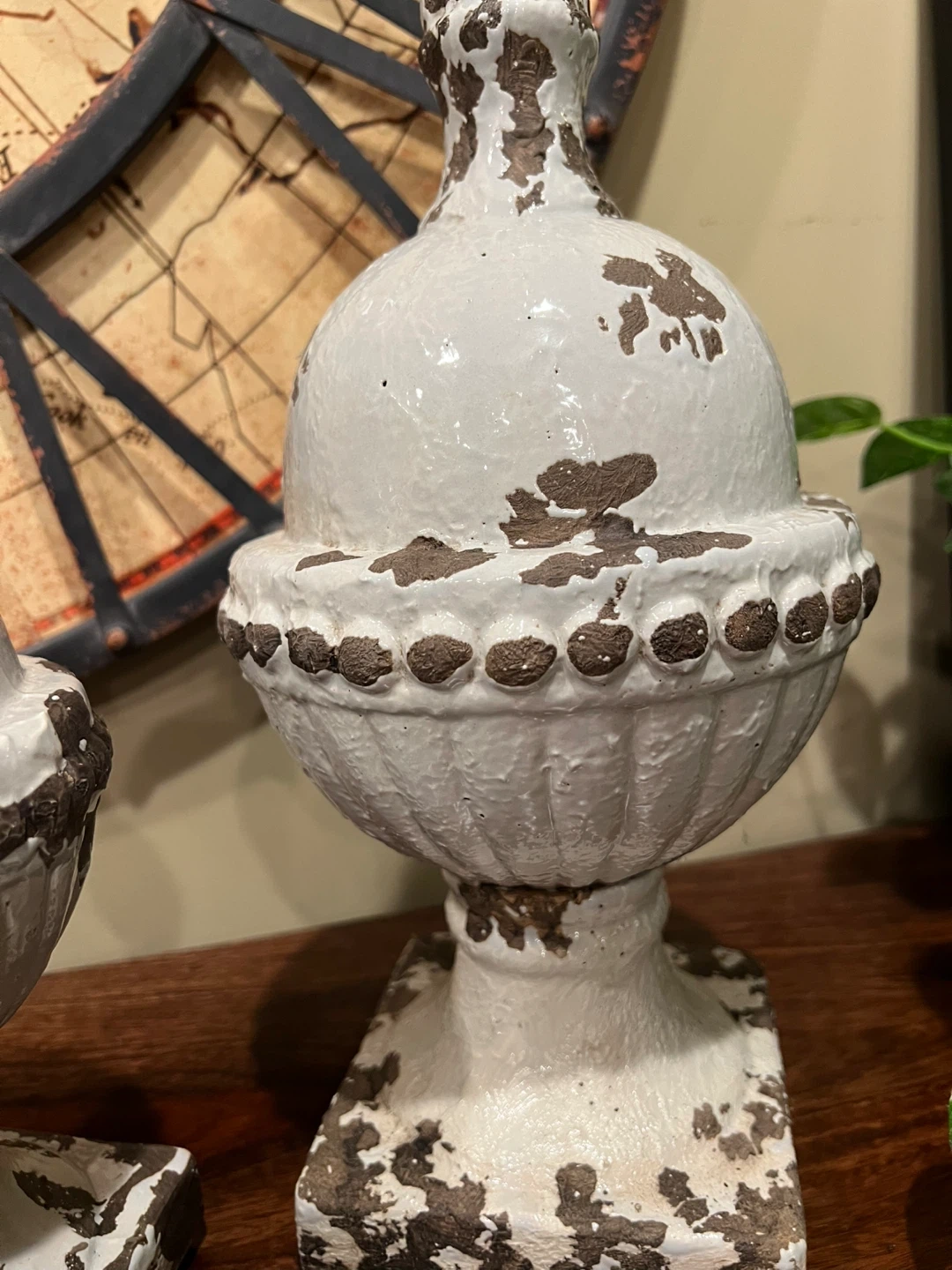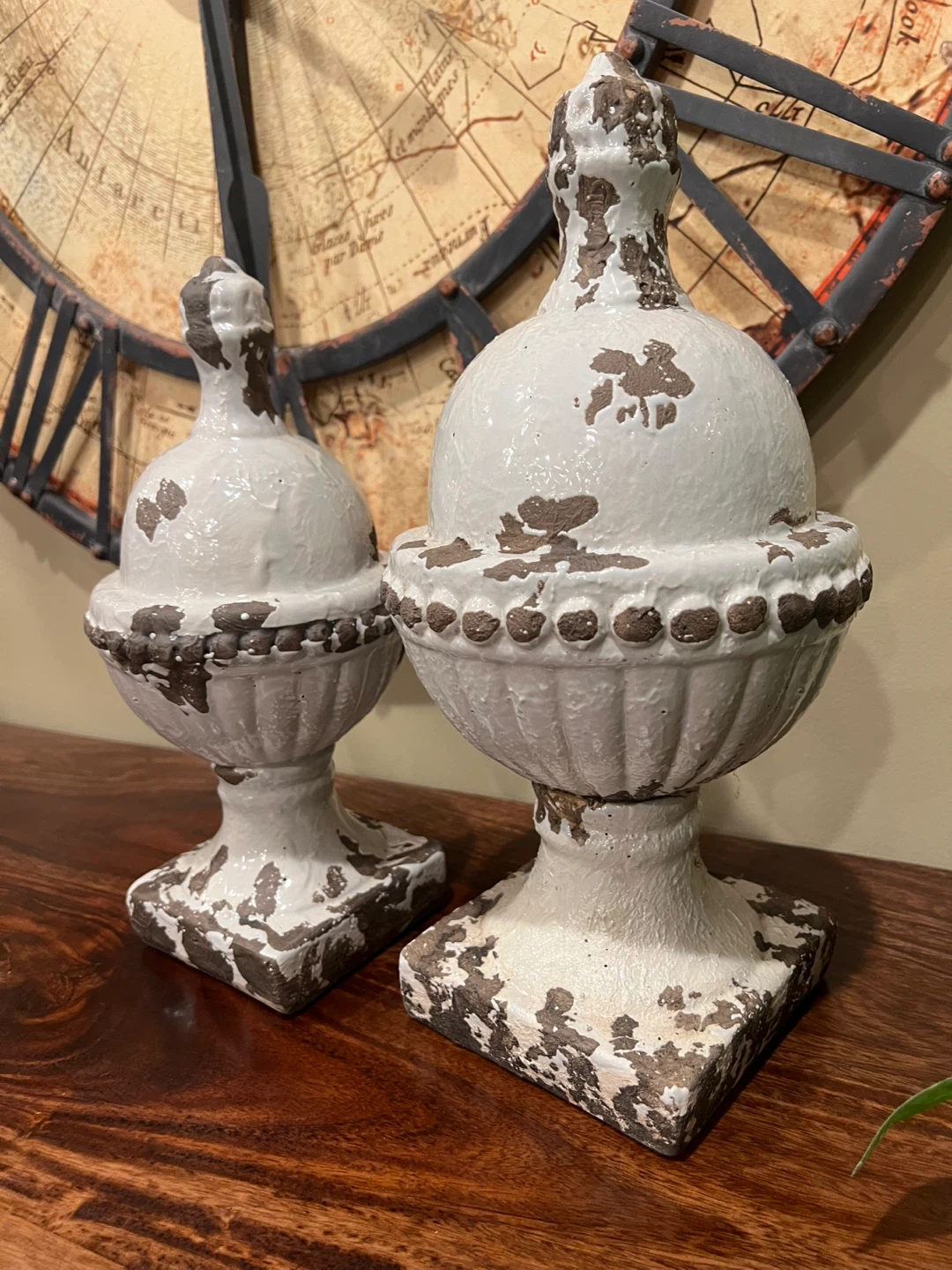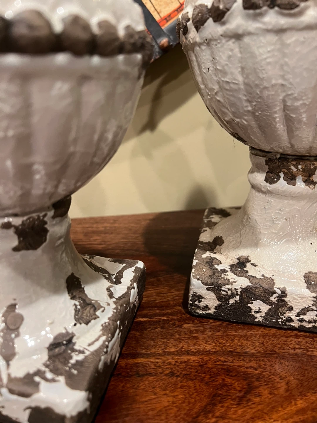 Distressed white finish with brown undertones Charming vintage vibe Perfect for shelves, mantles or as a unique table centrepieces… Perfect condition 14 “ and 12” tall Asking $30 for both/Sold as a set Interested? Message me and please check my other listings…