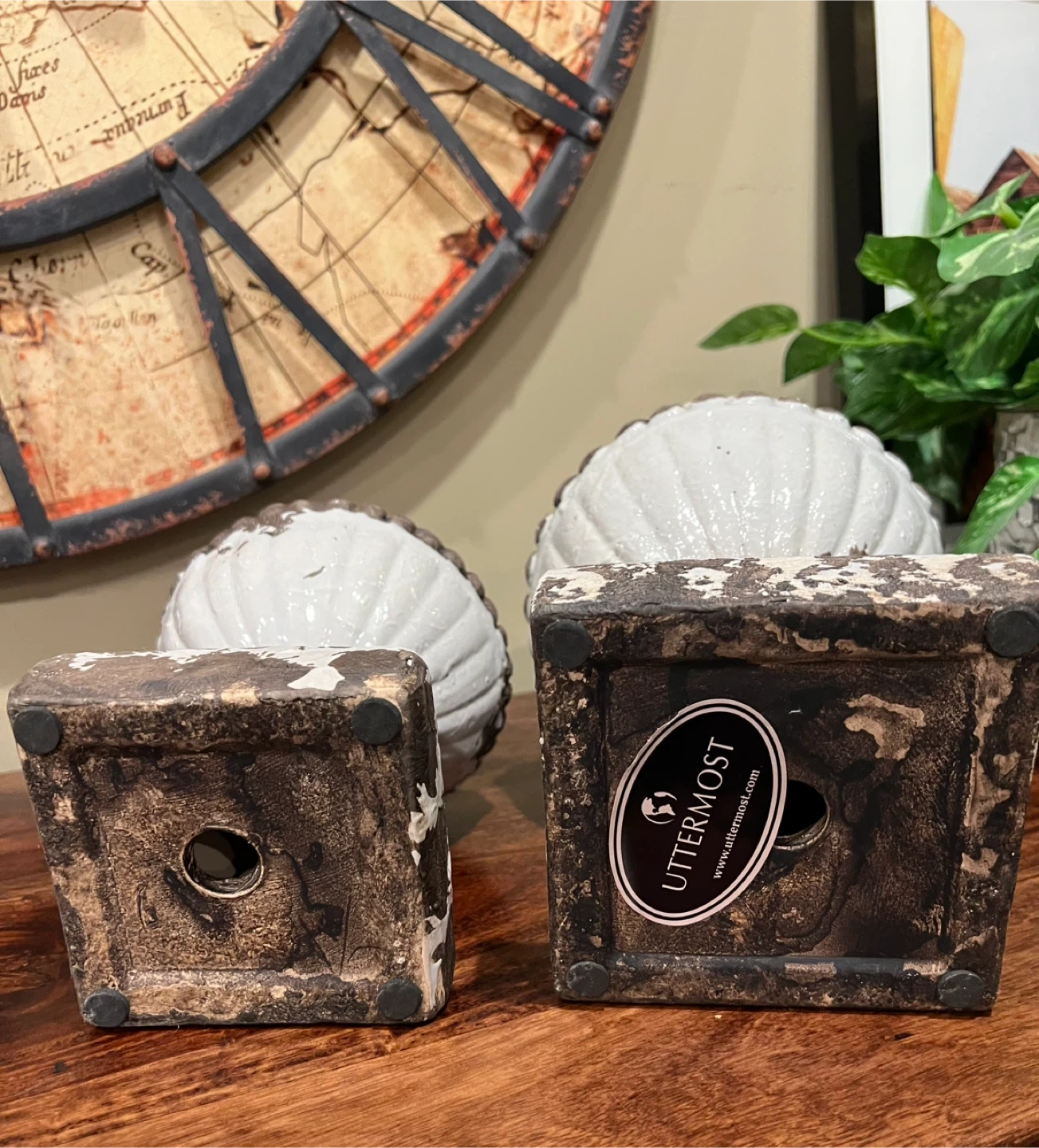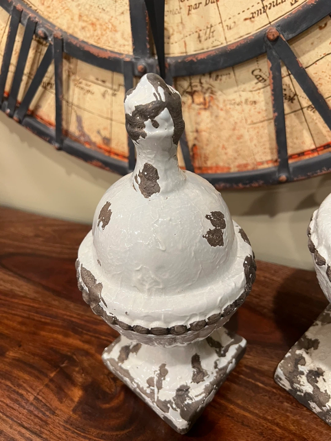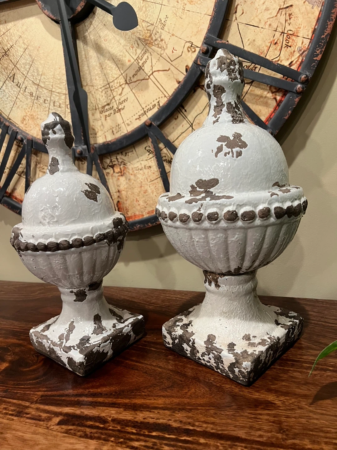 Distressed white finish with brown undertones Charming vintage vibe Perfect for shelves, mantles or as a unique table centrepieces… Perfect condition 14 “ and 12” tall Asking $30 for both/Sold as a set Interested? Message me and please check my other listings…
