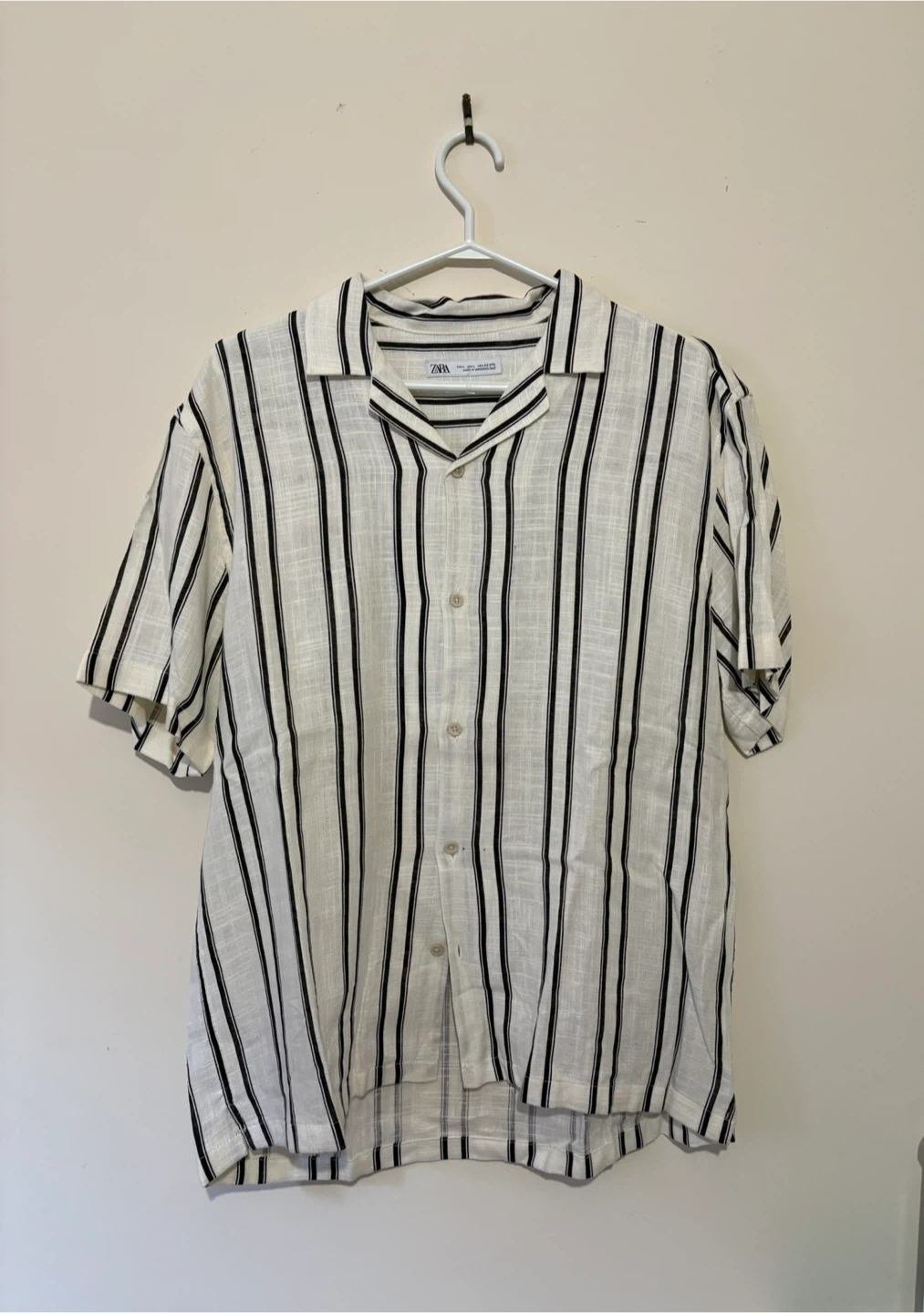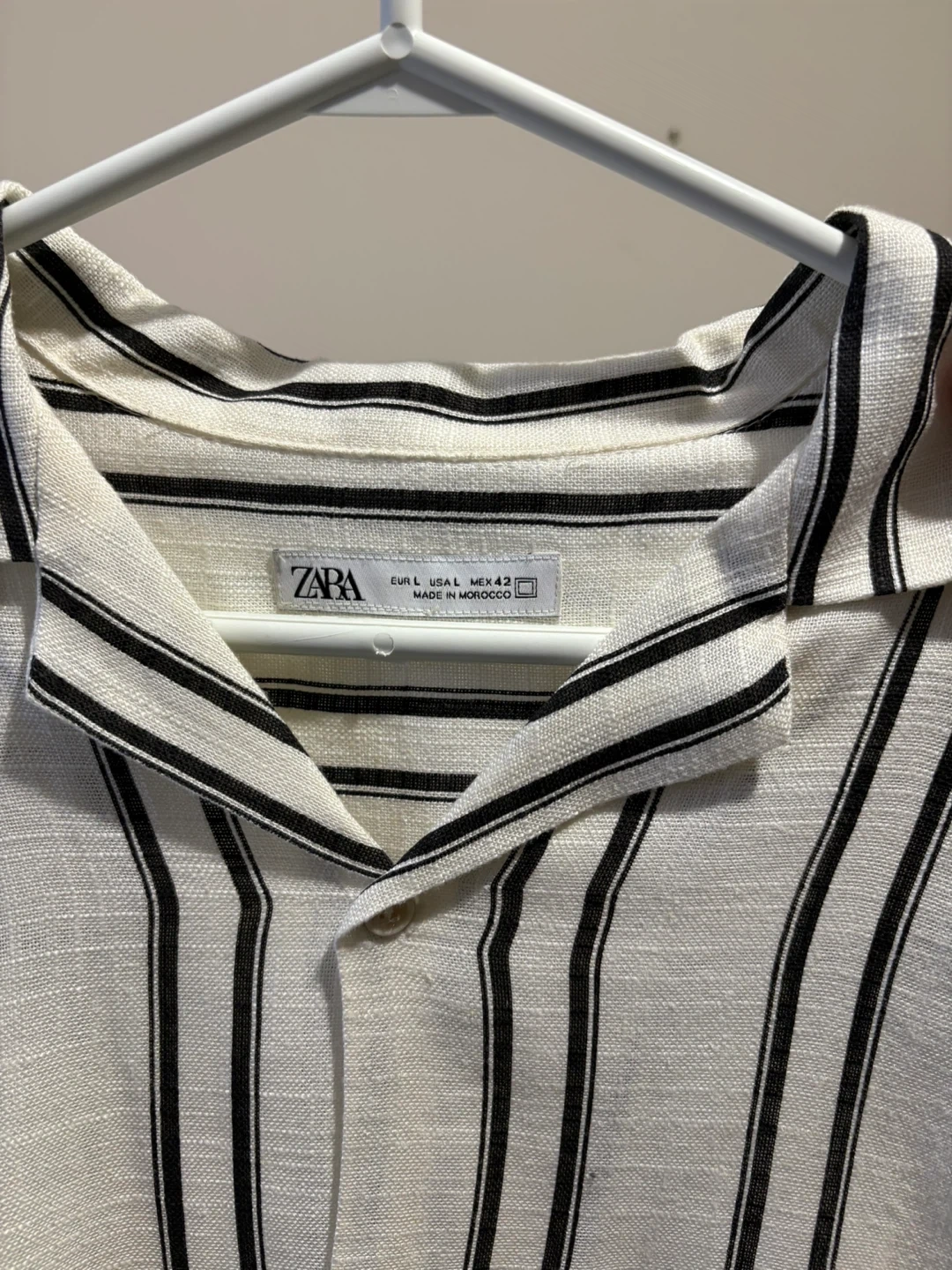 Selling a Zara linen blend shirt in a striped pattern! It's a size L and made in Morocco. The material is lightweight and perfect for summer days!