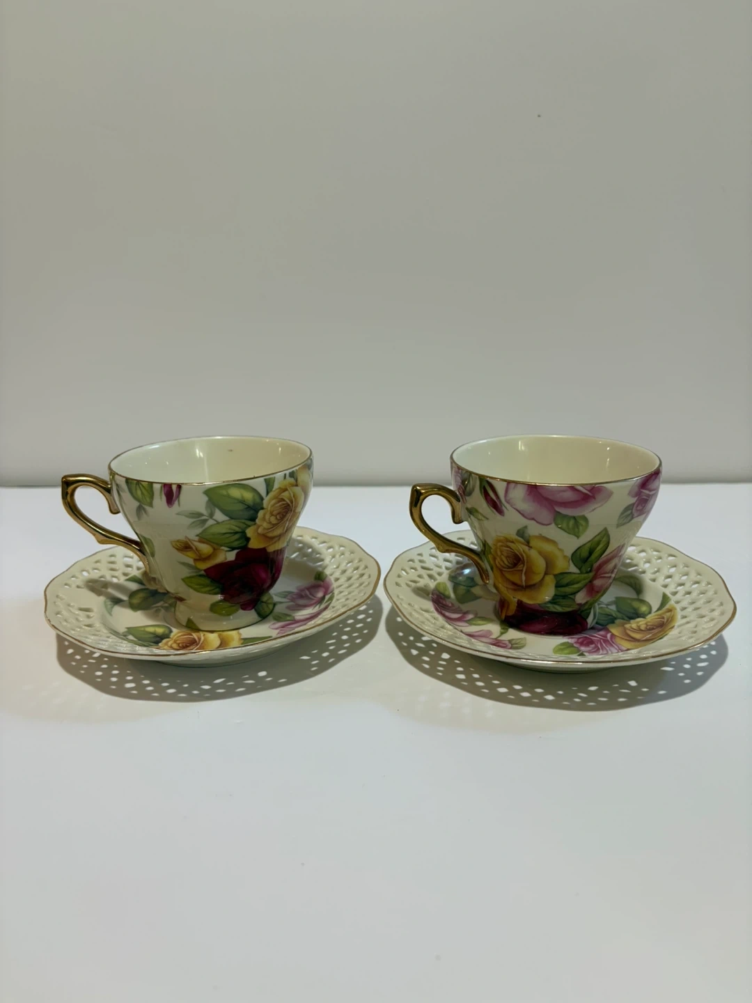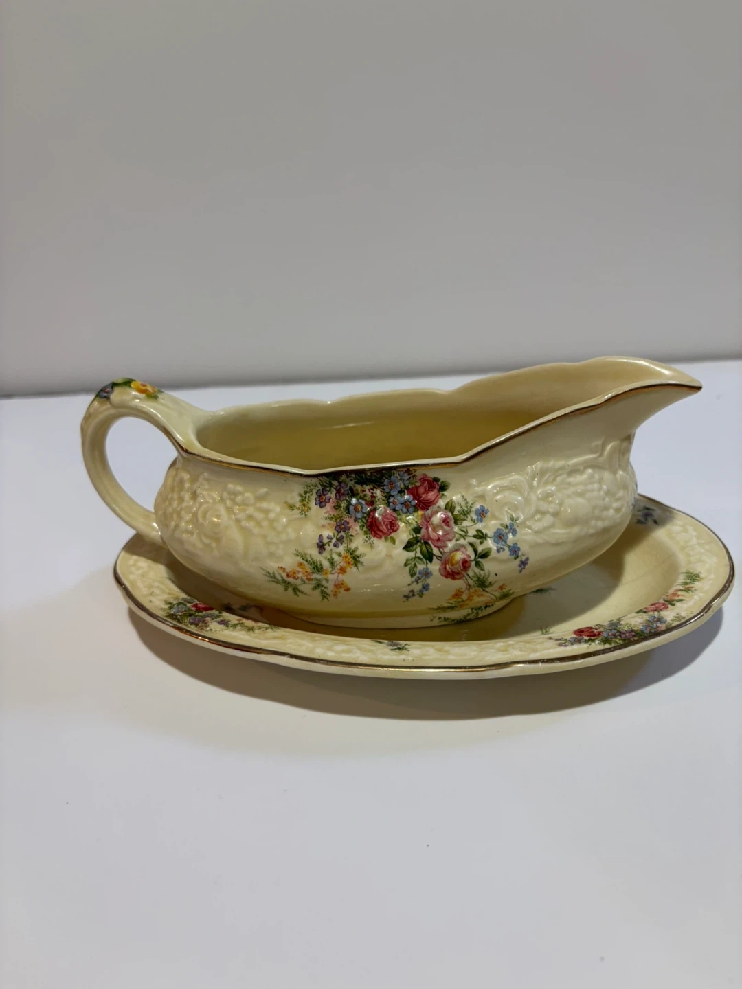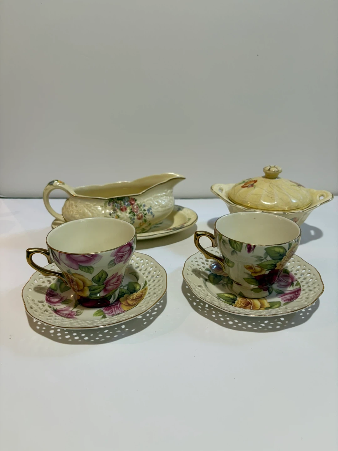Selling a vintage tea set with a beautiful floral design. Includes two teacups with saucers, a gravy boat with a small plate, and a small bowl with a lid. (8 Pieces) All pieces are in good condition and would make a lovely addition to any collection.