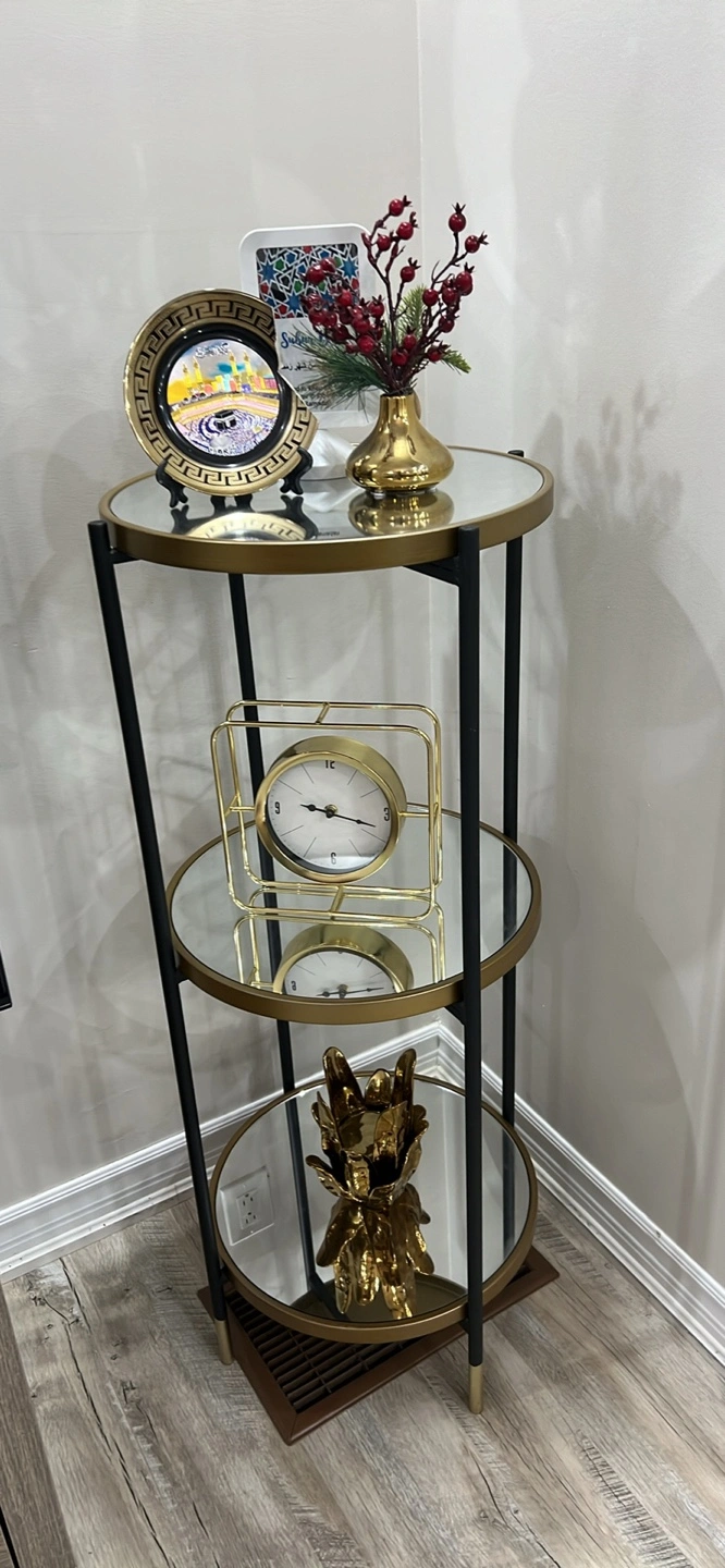 Add a touch of elegance to your home with this stylish 3-tier accent table! It features round mirrored shelves and a sleek black and gold frame. Perfect for displaying your favourite decor items! comes with gold clock and vase with red flowers