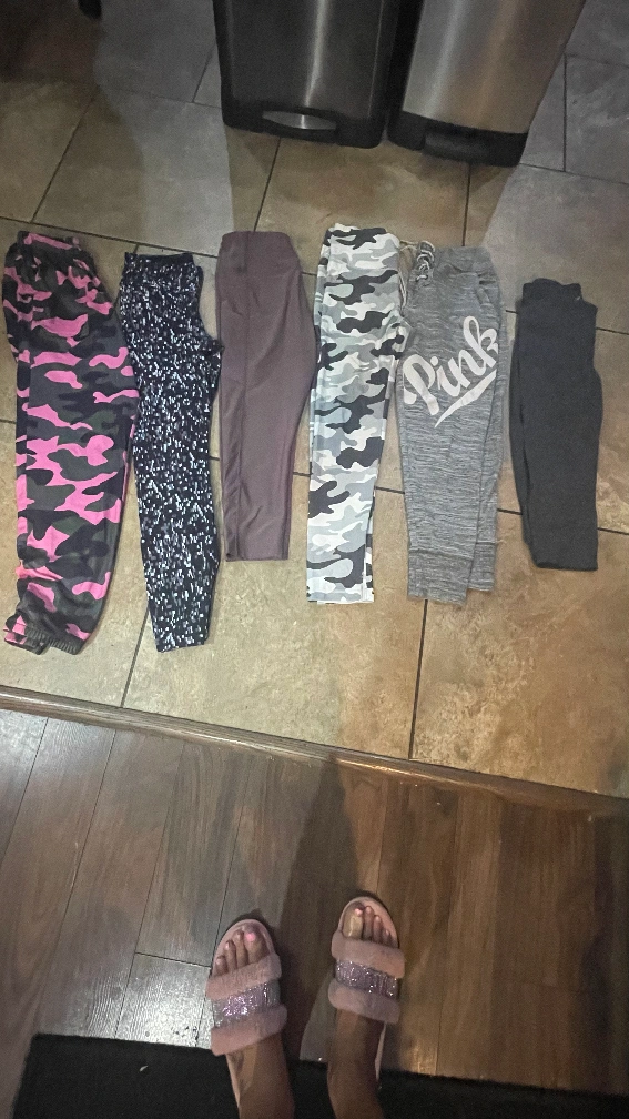 Selling a bundle of leggings! There's a mix of patterns and colours, including pink camo, grey camo, and a grey pair with 'Pink' on the leg. Great for workouts or just lounging around!