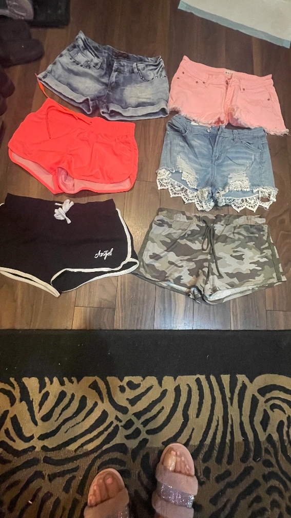 A collection of gently used women's shorts in various styles and colours. There are denim shorts, a pair of pink shorts, black shorts with white trim and a pair of camo shorts. All are in good condition and ready for a new home!
