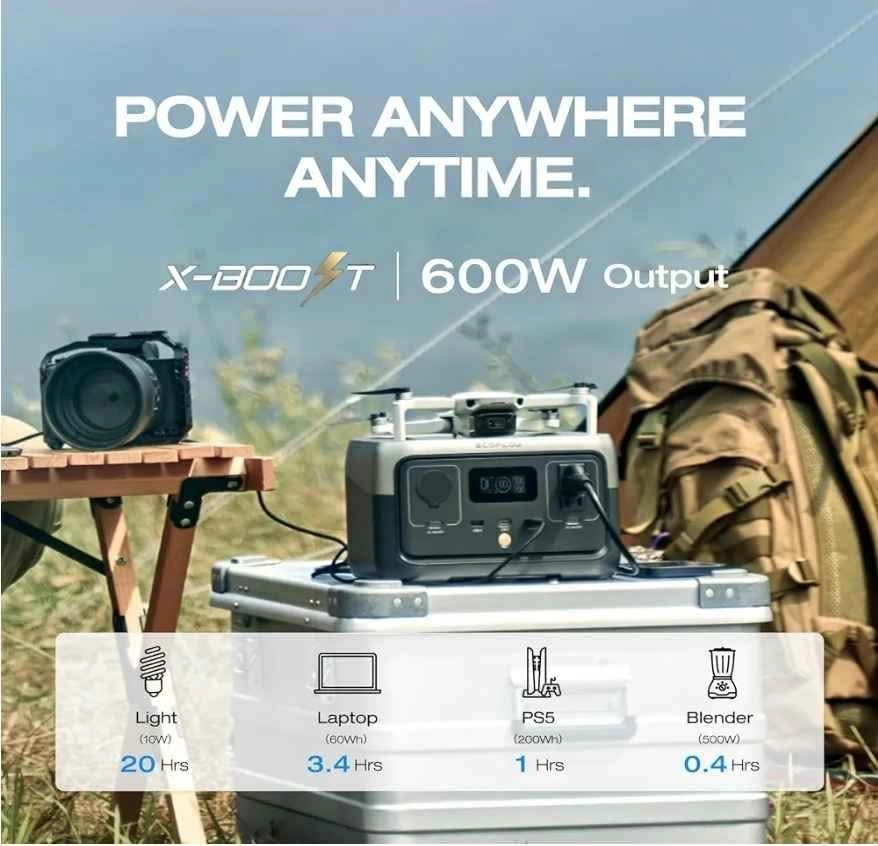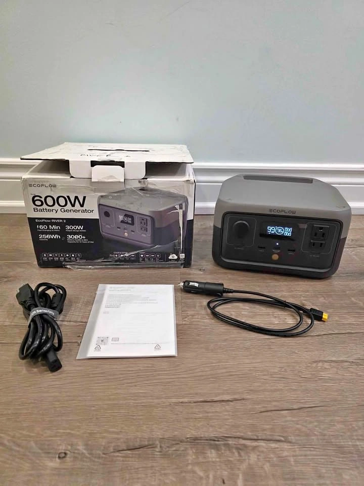Compact 256Wh LiFePO4 portable power station with 600W output (X-Boost). Features 2 AC outlets, USB-C, USB-A, and car outlet. Fast charges in 1 hour, powers up to 6 devices (lights, laptops, PS5, blender, etc.). Perfect for camping, RVs, road trips, or emergency backup. Brand new and tested. Pulled from a liquidation pallet. 3 left out of 6 available.