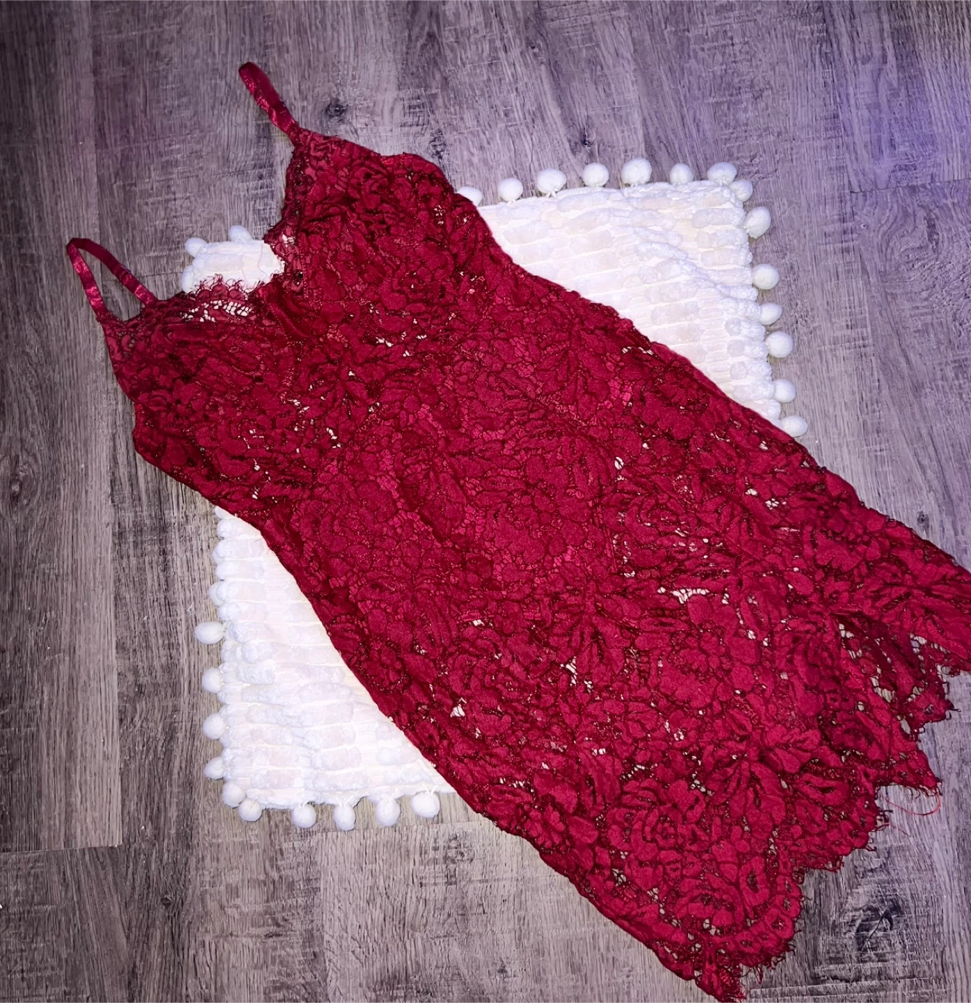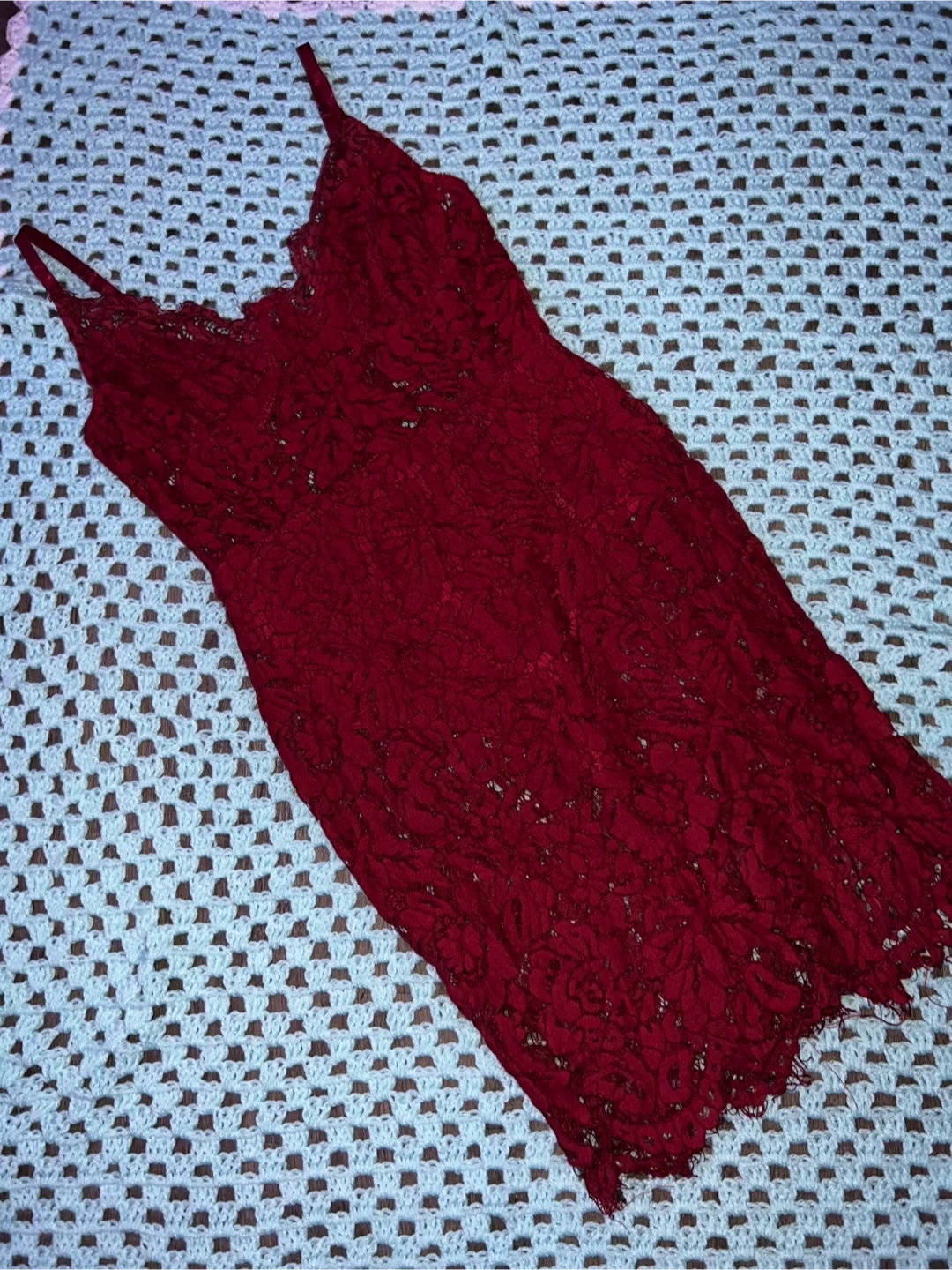 A beautiful burgundy lace dress! It's in great condition and ready for a new home. Perfect for a night out or a special occasion. The lace detailing adds a touch of elegance. It's a lovely addition to any wardrobe