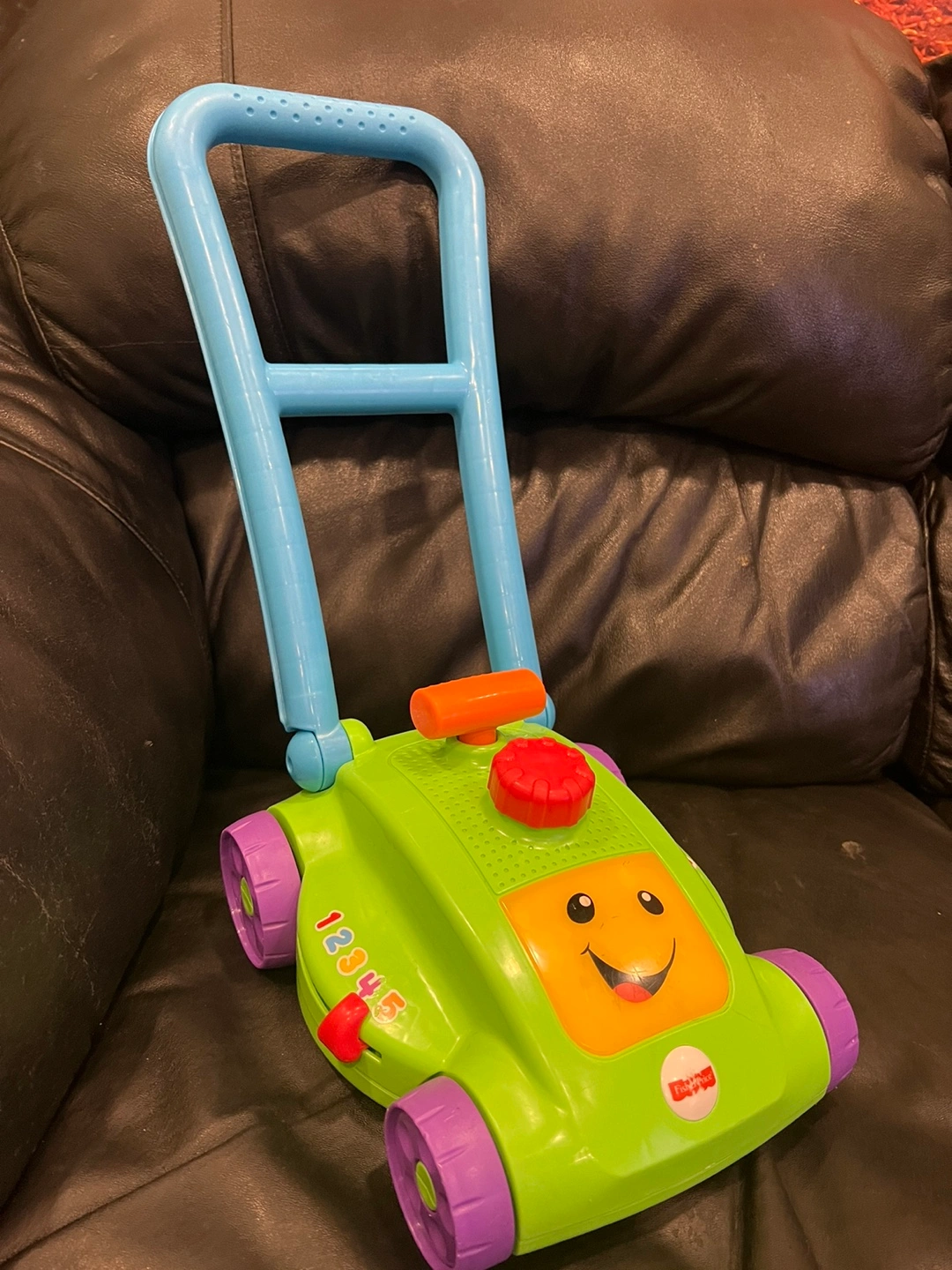 I'm selling a Fisher-Price toy lawn mower. It's in great condition and ready for a new home! This toy is perfect for toddlers who love to mimic outdoor activities. It features bright colours, a smiley face, and numbered decals to make playtime fun and educational