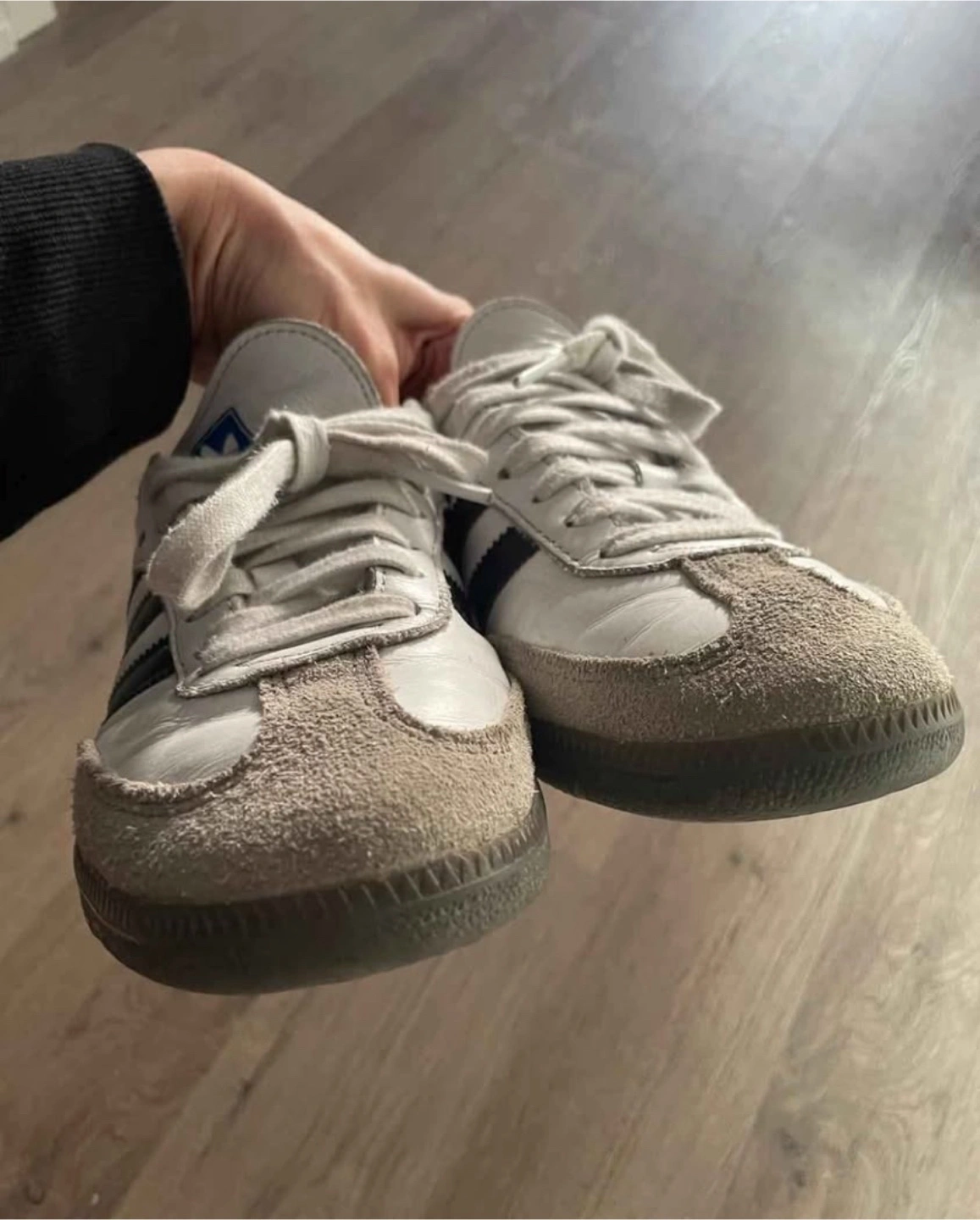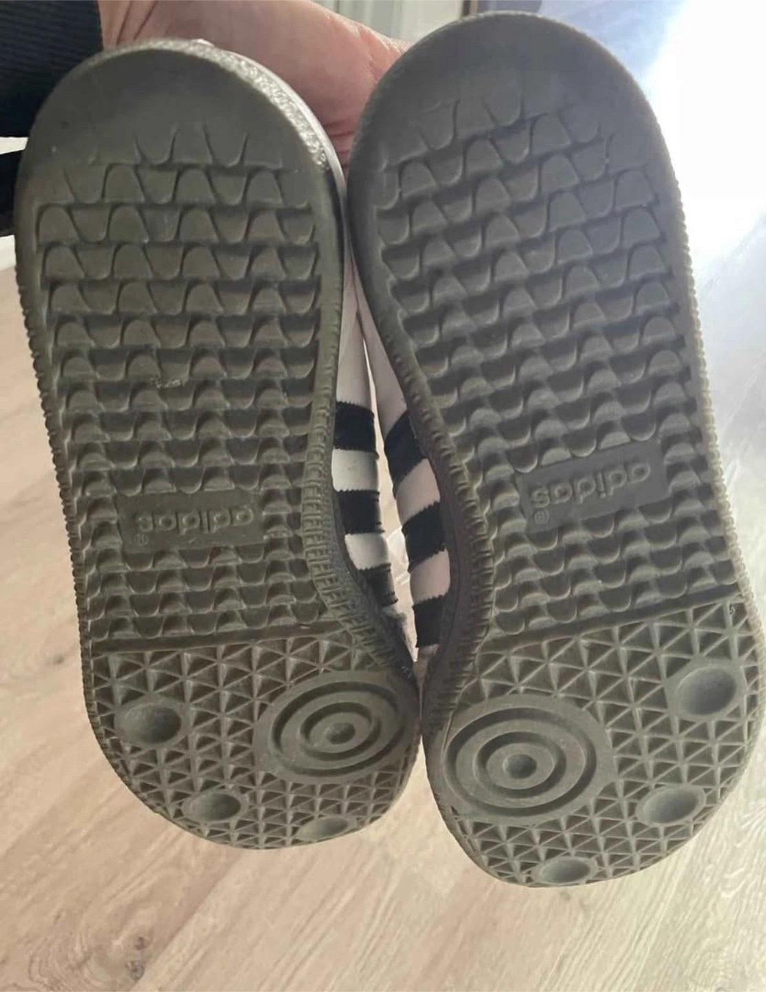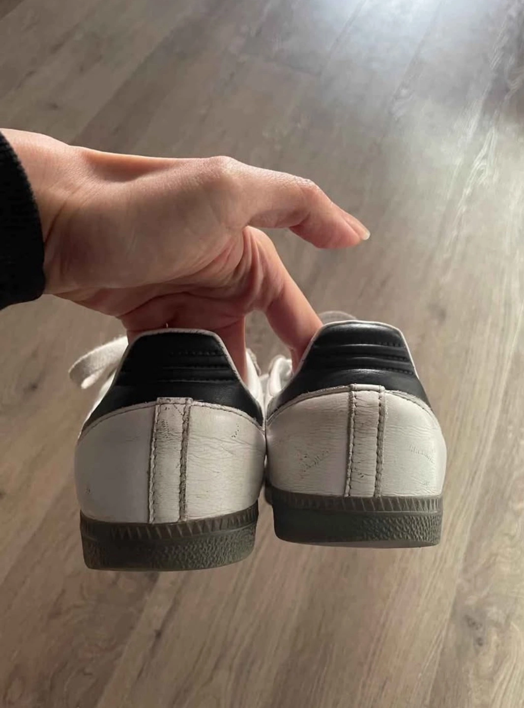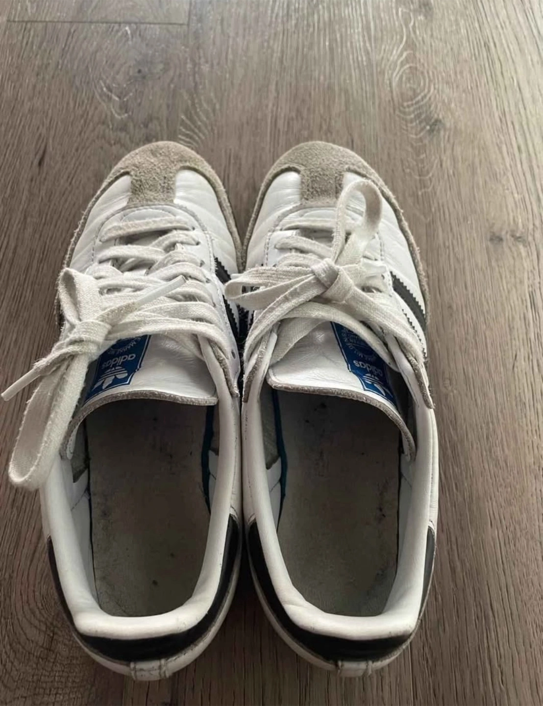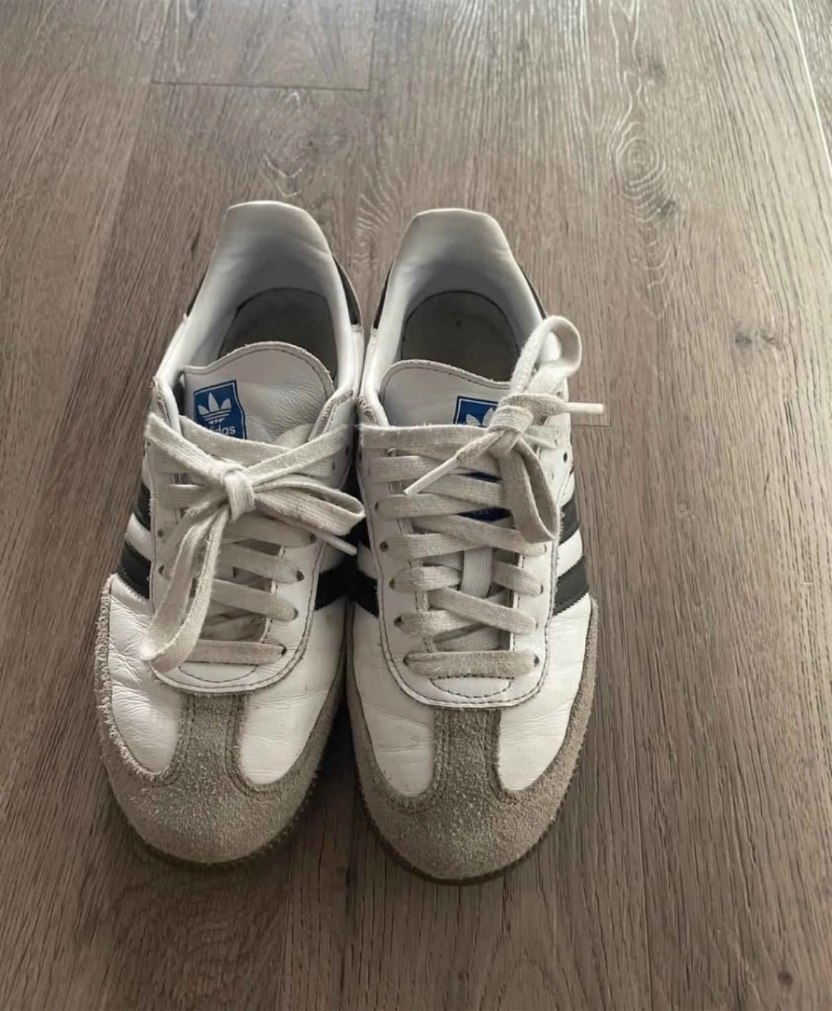 Selling a pair of Adidas Samba sneakers in white. They are in used condition, as you can see in the photos. The size is 4 US, 3.5 UK, 36 2/3 FR, and 225 JP. Perfect for casual wear!