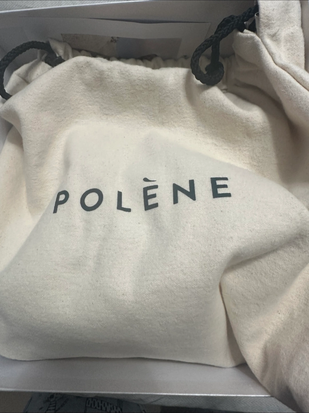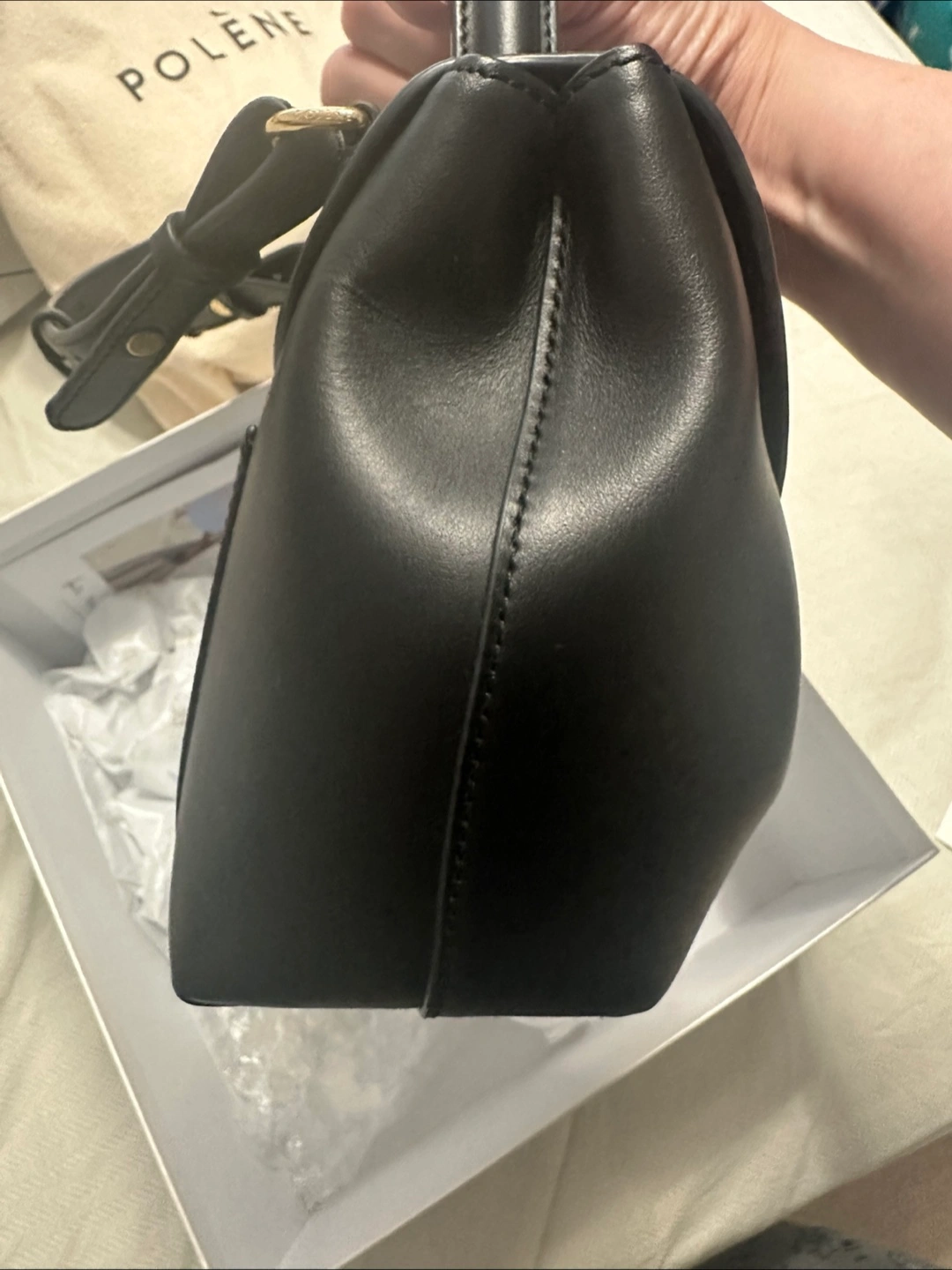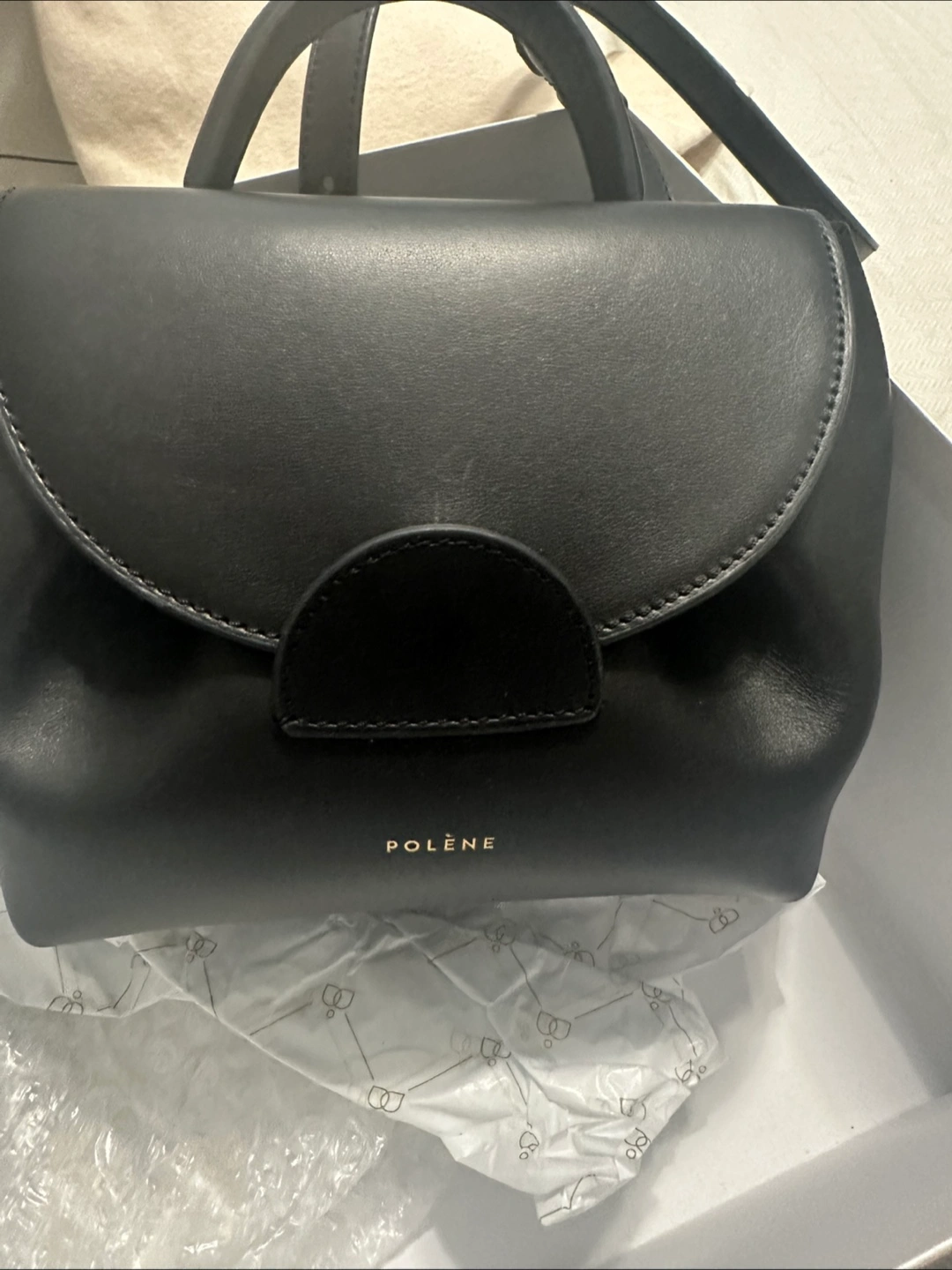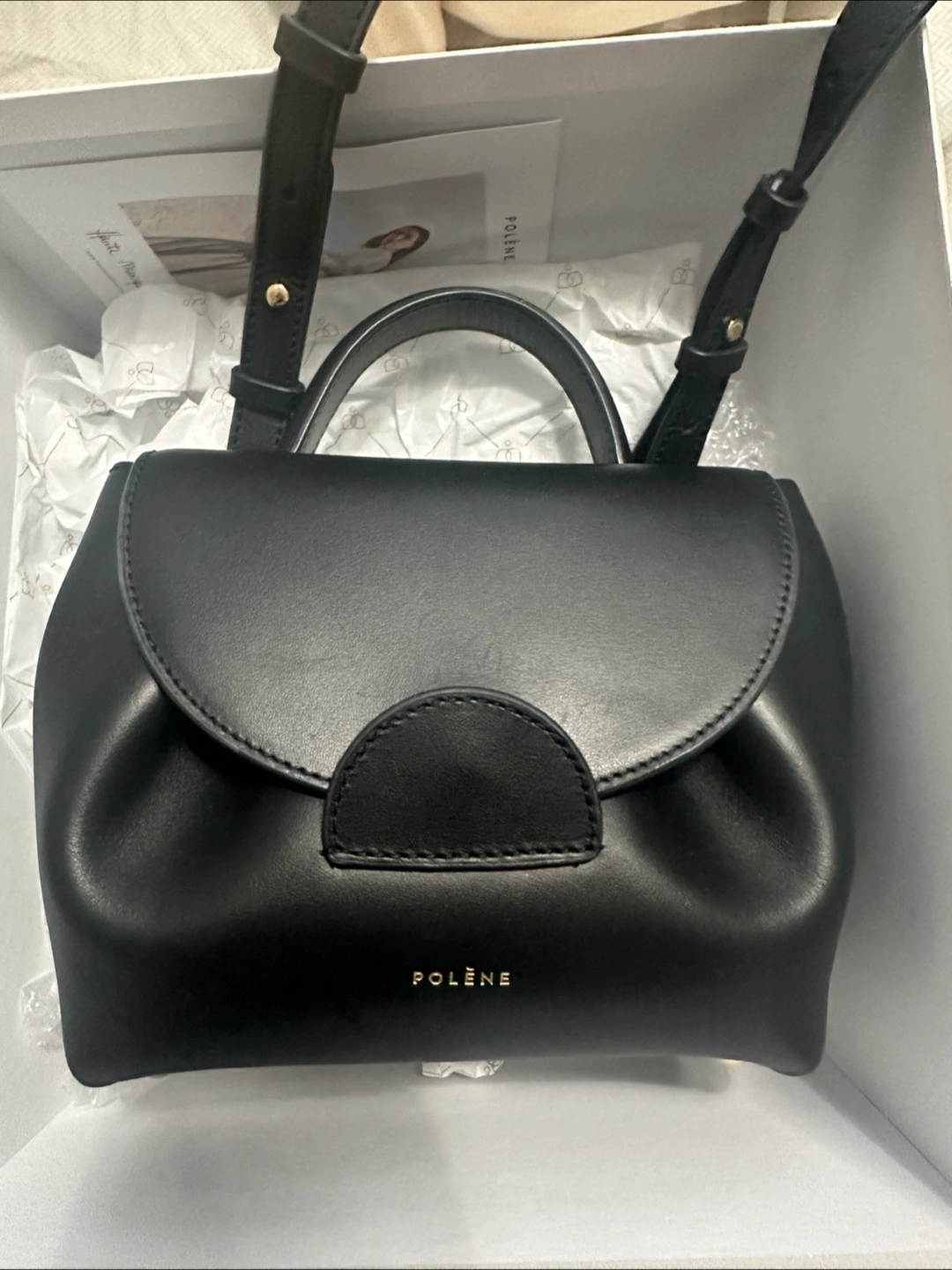 Discover elegance with the Black Leather Women's Bag. Perfect for any occasion, this bag combines style and functionality. Made by leather goods artisans in Ubrique, Spain. Signature folds held in place by hand stitching. Certified Italian full-grain textured calf leather. Handbag, shoulder bag, or crossbody bag. Dimensions: 20.5 X 17 X 9 cm. Weight: 440 g. Adjustable shoulder strap: 132 cm. Back pocket. Interior pocket. Magnetic closure. Certified Italian full grain smooth calf leather. 100% cotton twill lining. Slightly used and minimal signs of wear Complete inclusion Box Dust bag Tag Bought online from Polene website Authentic Retail price: $470 usd plus customs fee