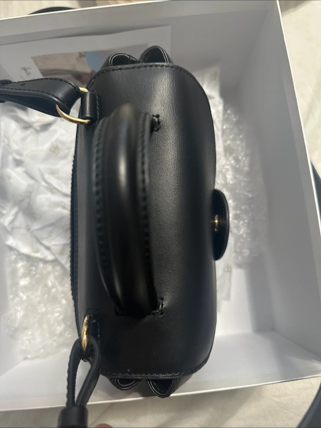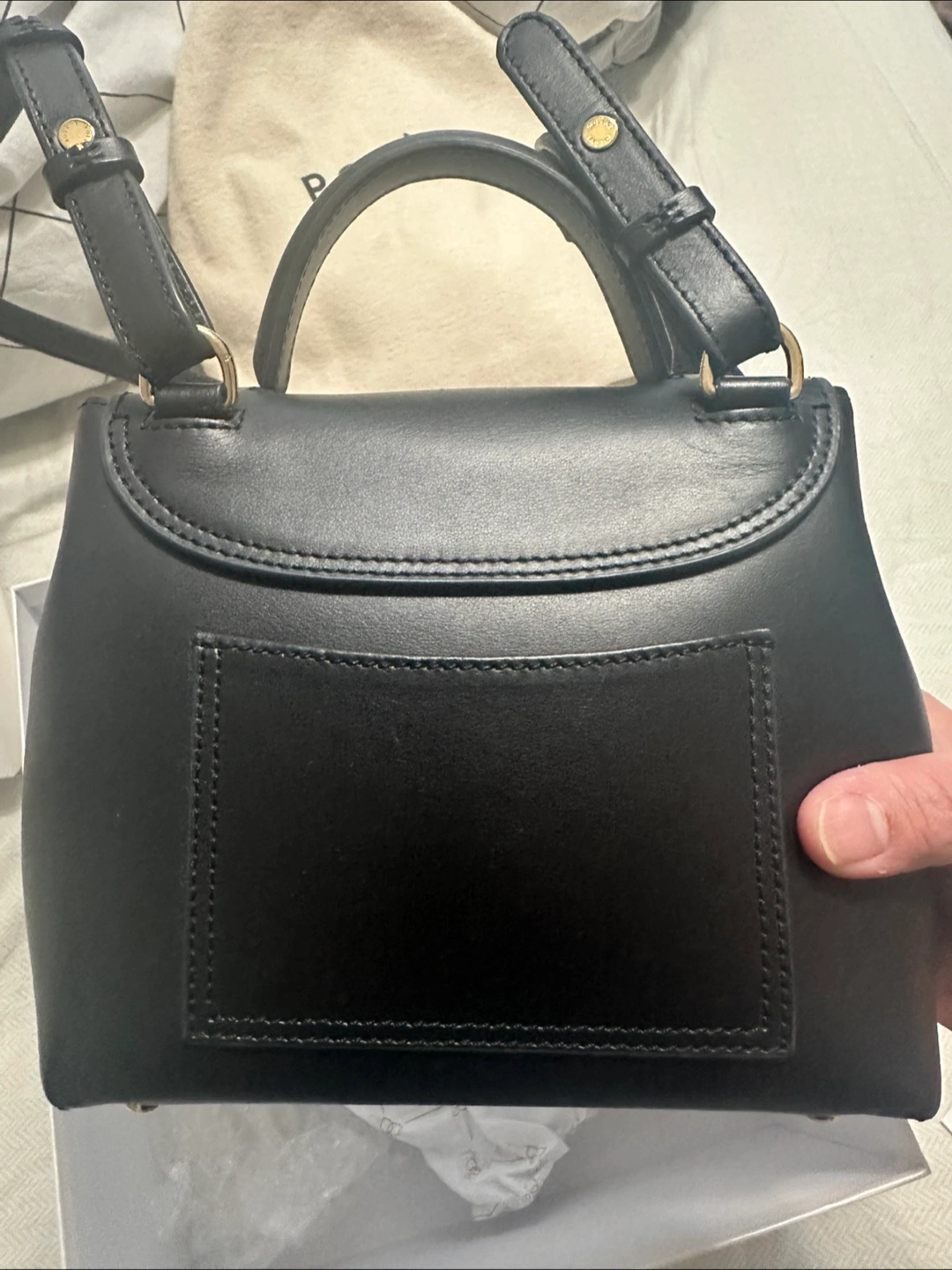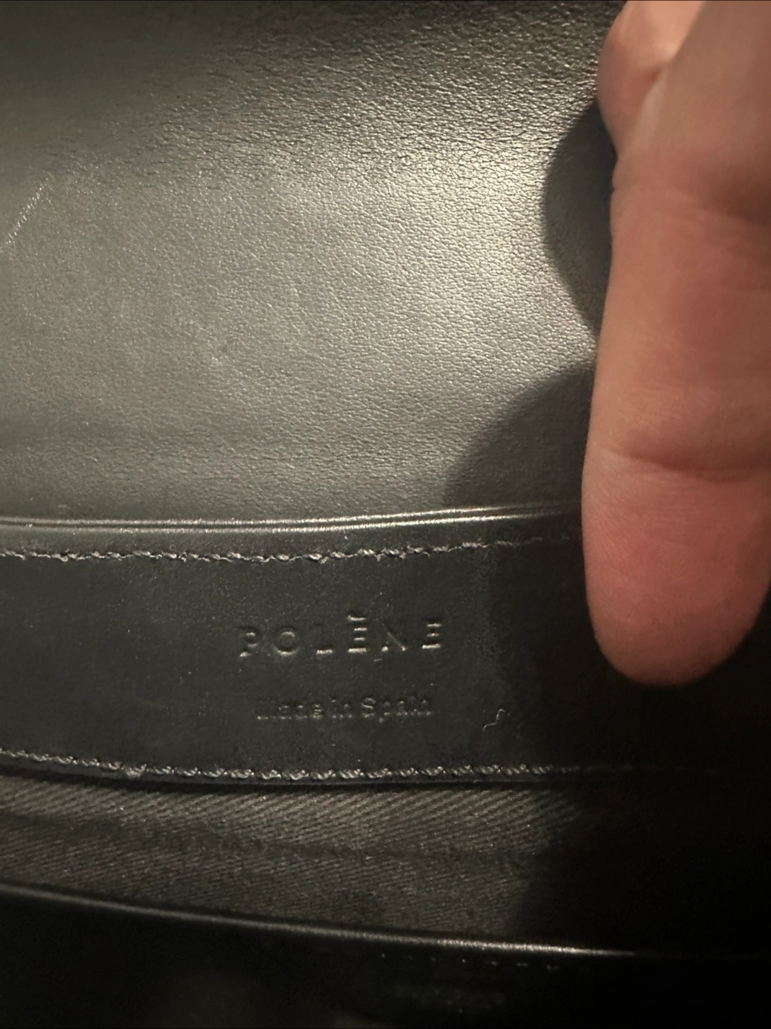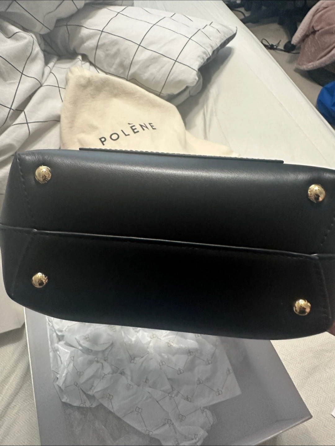 Discover elegance with the Black Leather Women's Bag. Perfect for any occasion, this bag combines style and functionality. Made by leather goods artisans in Ubrique, Spain. Signature folds held in place by hand stitching. Certified Italian full-grain textured calf leather. Handbag, shoulder bag, or crossbody bag. Dimensions: 20.5 X 17 X 9 cm. Weight: 440 g. Adjustable shoulder strap: 132 cm. Back pocket. Interior pocket. Magnetic closure. Certified Italian full grain smooth calf leather. 100% cotton twill lining. Slightly used and minimal signs of wear Complete inclusion Box Dust bag Tag Bought online from Polene website Authentic Retail price: $470 usd plus customs fee