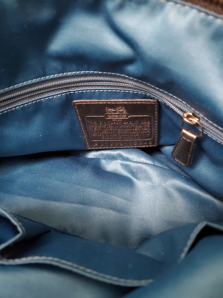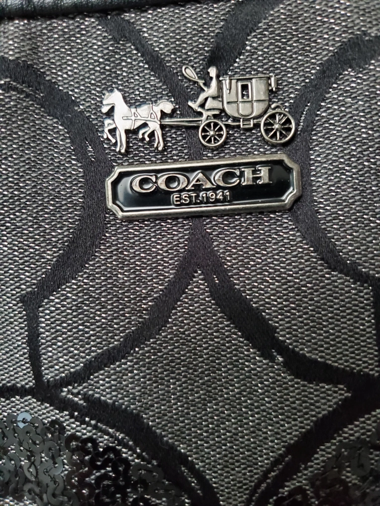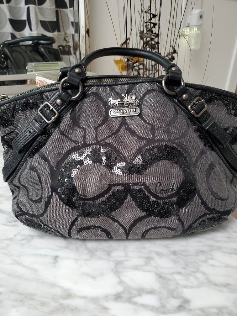 Selling a Coach handbag with a unique design! It features a black and grey sequin pattern. The bag has black leather handles and trim. The interior is lined with a blue fabric. It's in great condition and ready for a new home