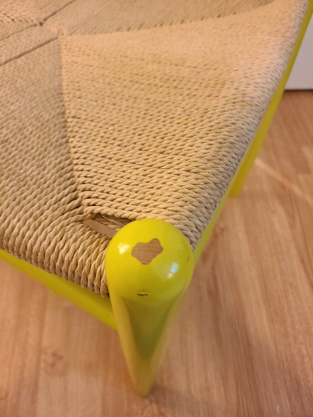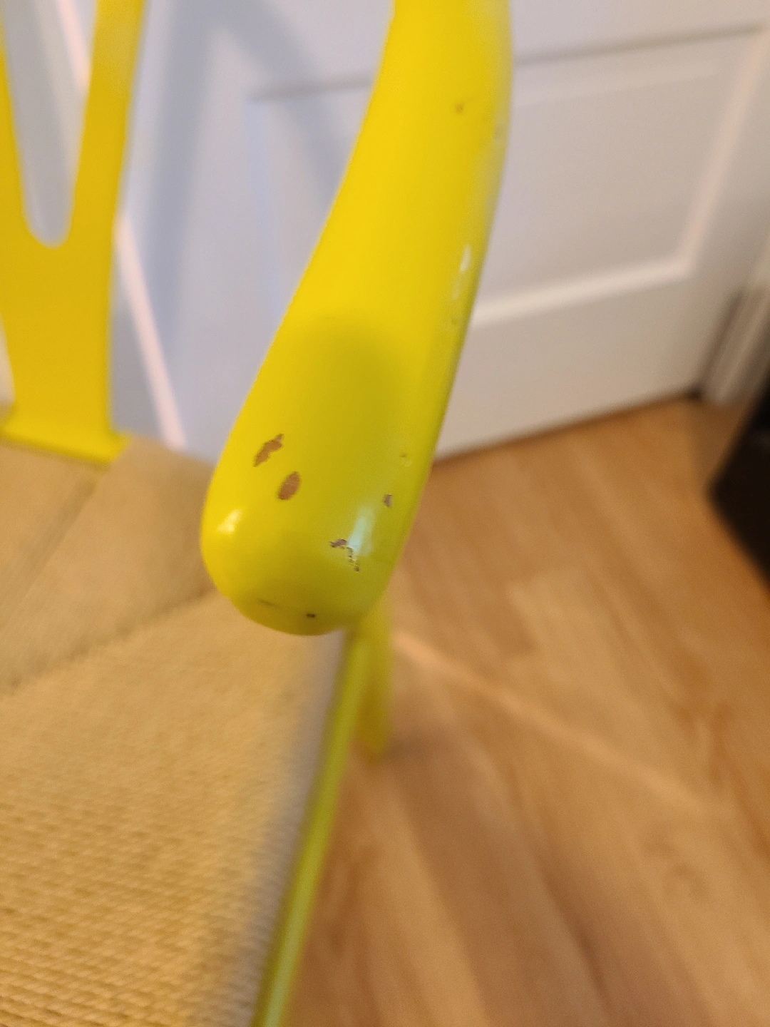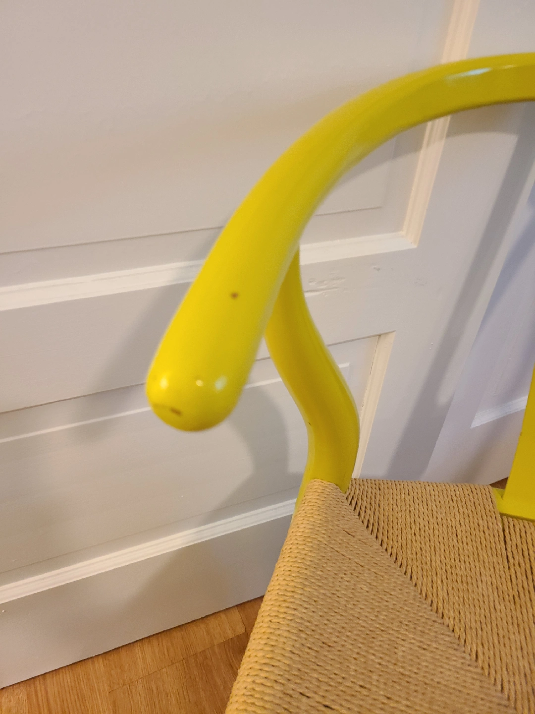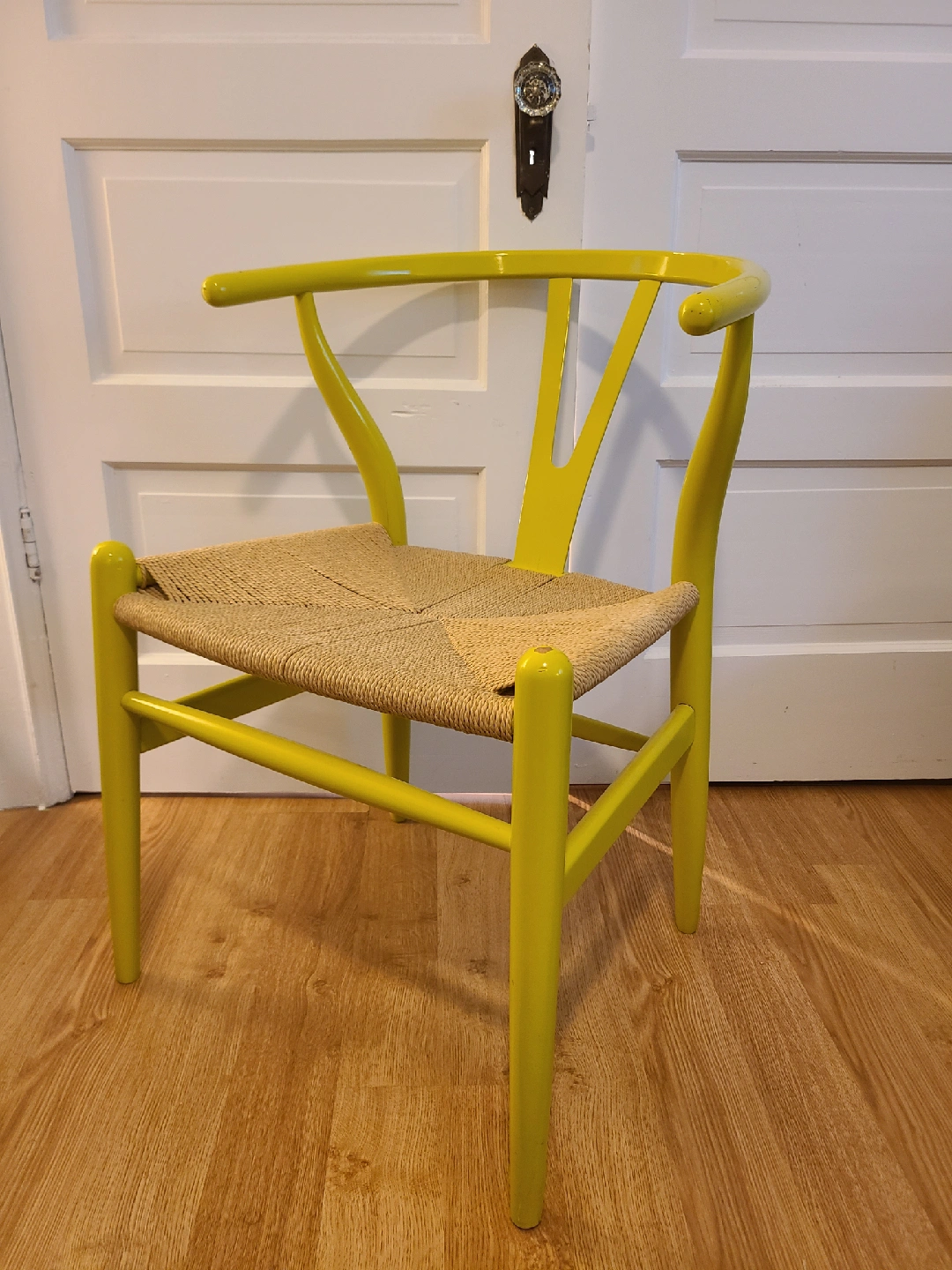 Selling a chartreuse wishbone chair. It has a woven seat. There are some small chips on the paint. It's still a very stylish, comfortable, and functional chair! From a pet-free, smoke-free home Porch pickup near Bathurst station
