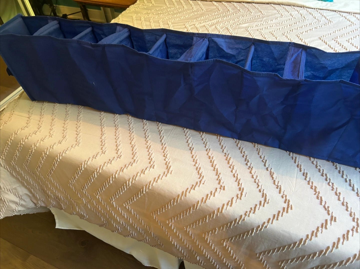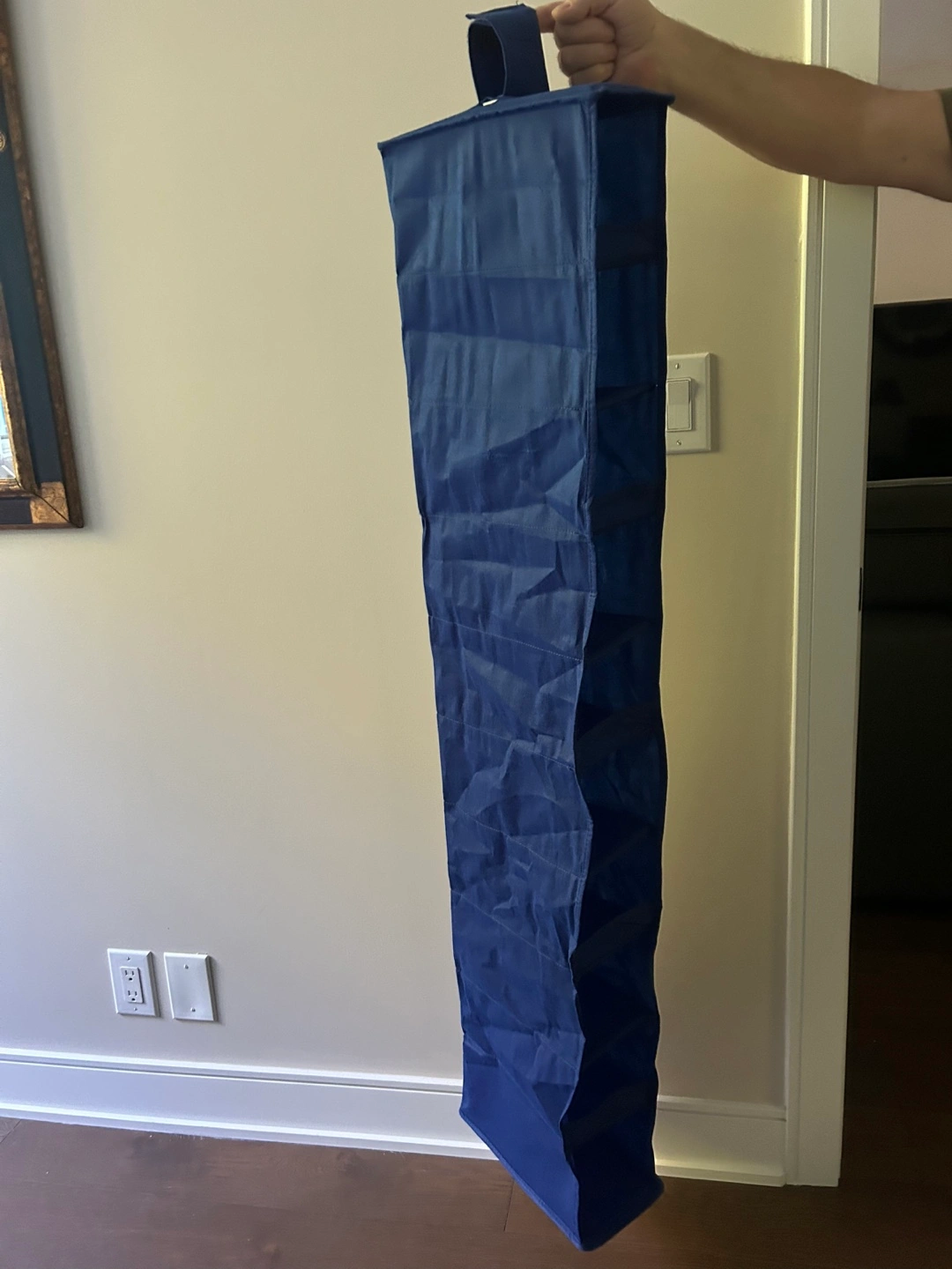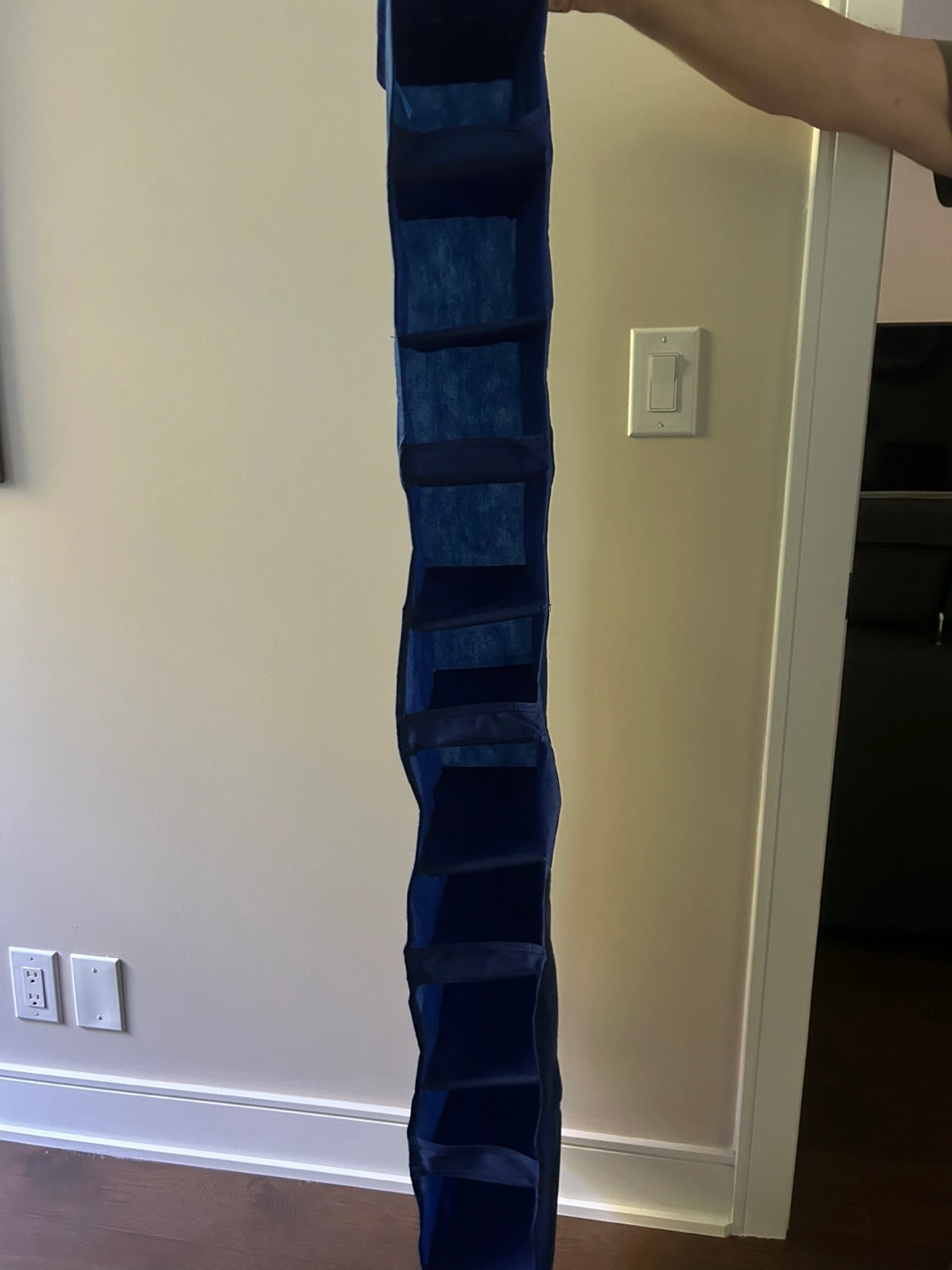 This is a blue hanging closet organizer. It's sturdy for organizing shoes, accessories, or anything else you need to keep tidy in your closet. It's in good condition