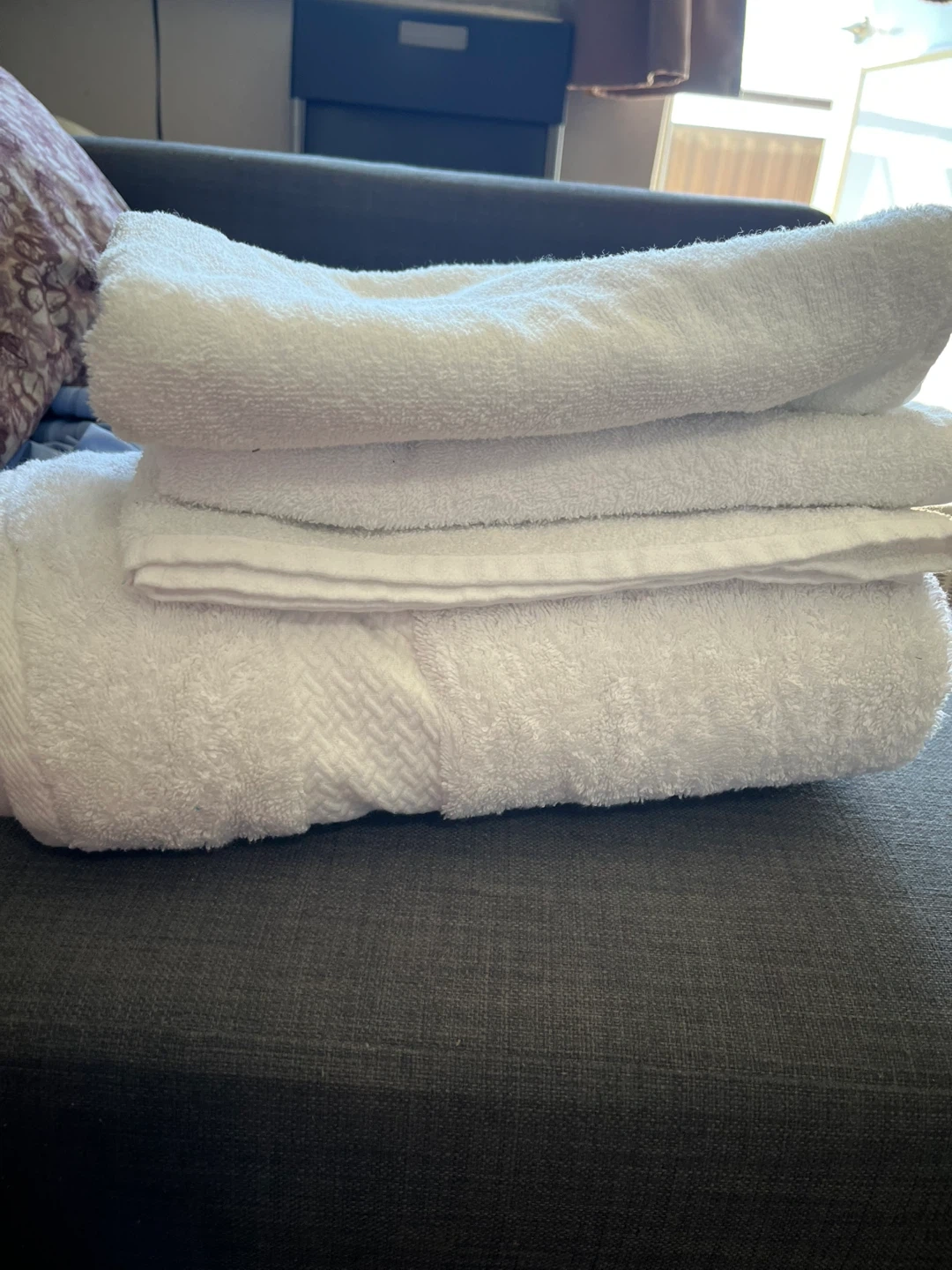 Selling a set of white towels from Serenity Home Collection. They are very new and ready for a new home. Perfect for adding a touch of comfort to your bathroom!