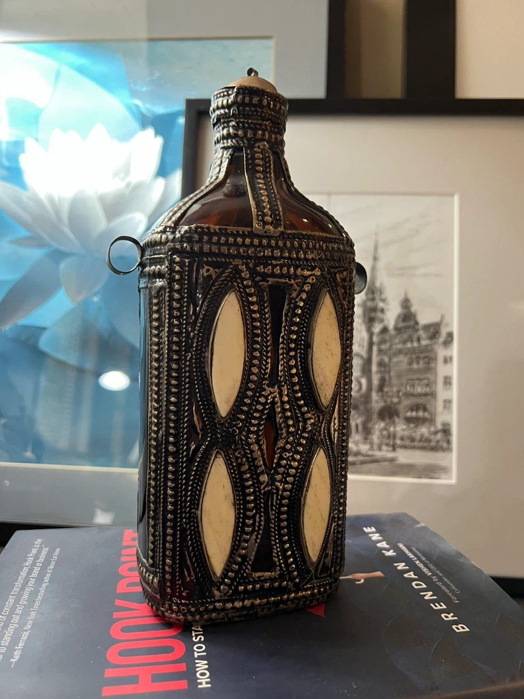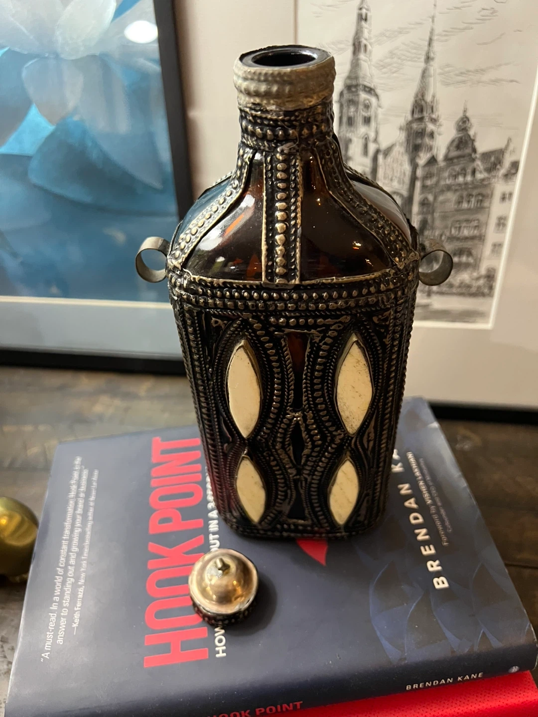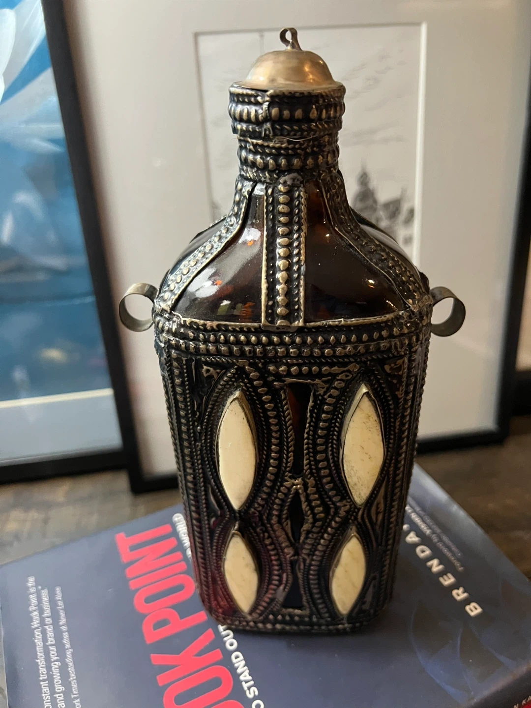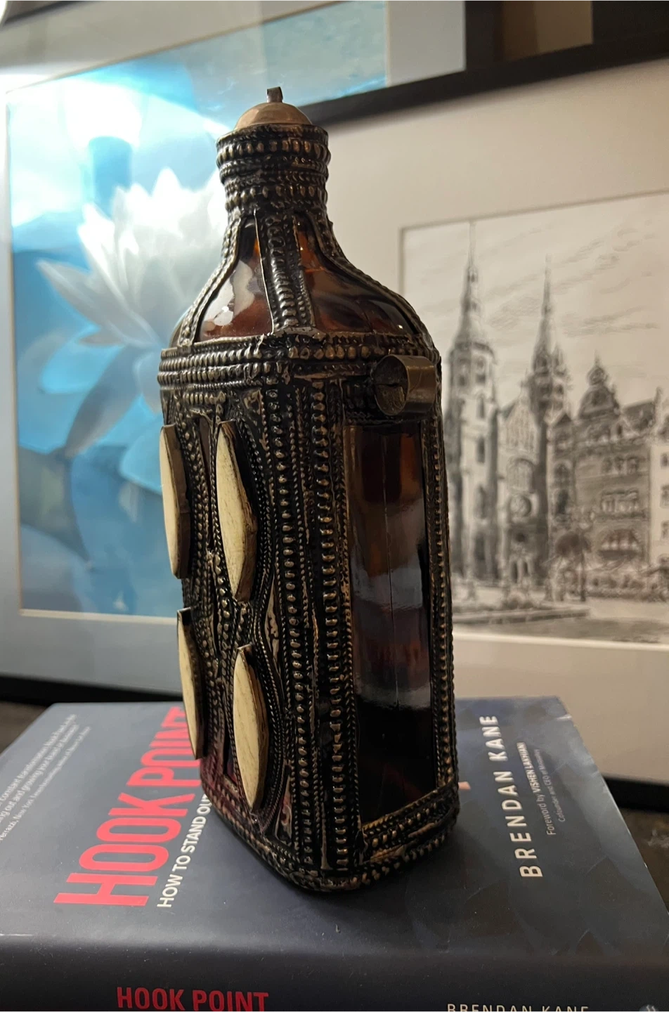 Intricate metalwork and inlaid stones accents Stopper Amber glass Ideal for interior decoration or collecting Perfect condition 9.5” x 5” x 3” Unique statement piece!! Asking $20 Interested? Message me and please check my other listings…