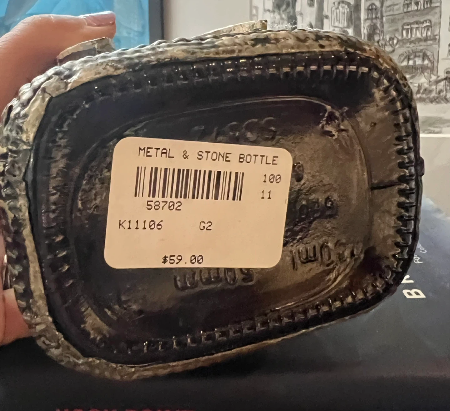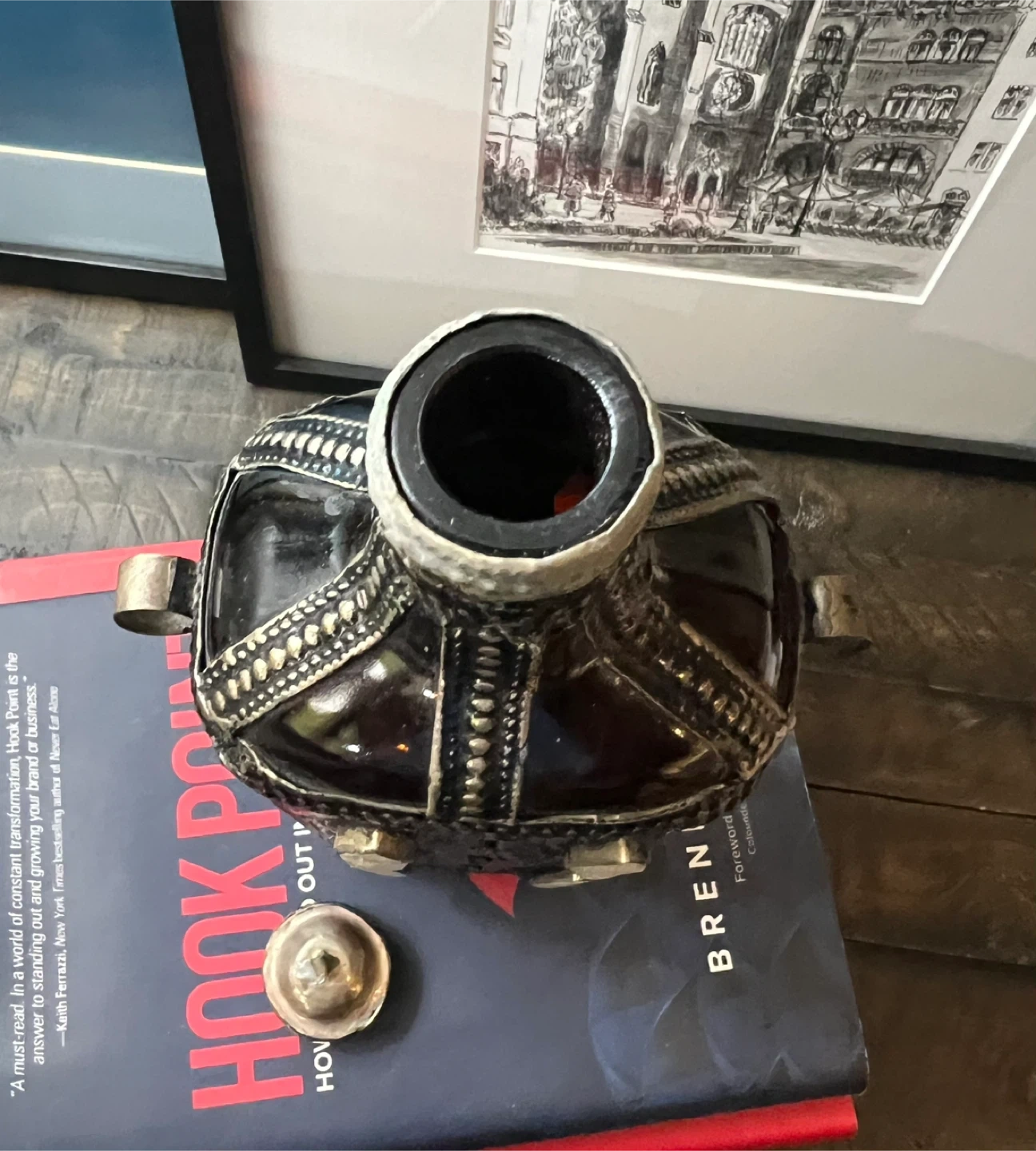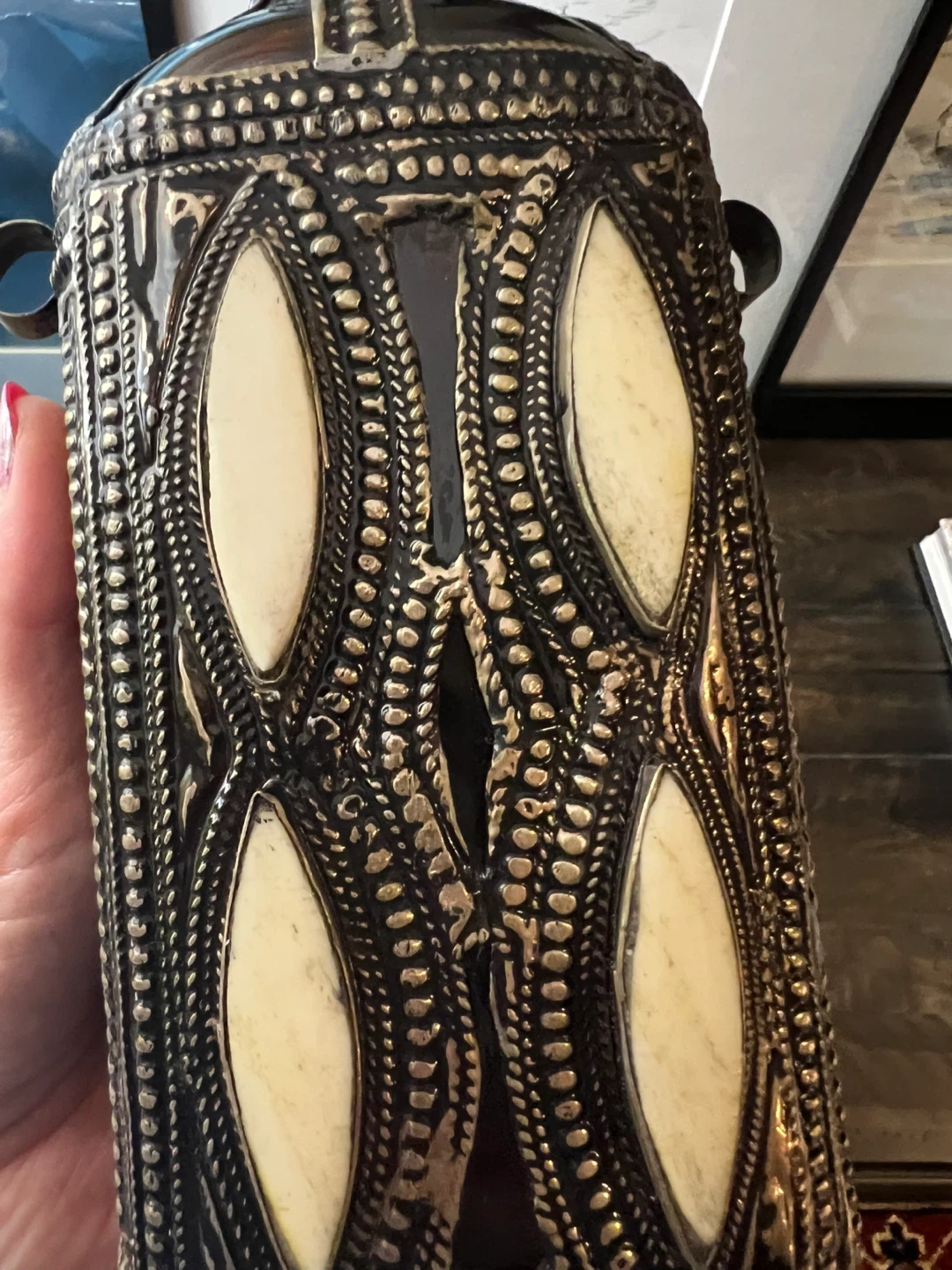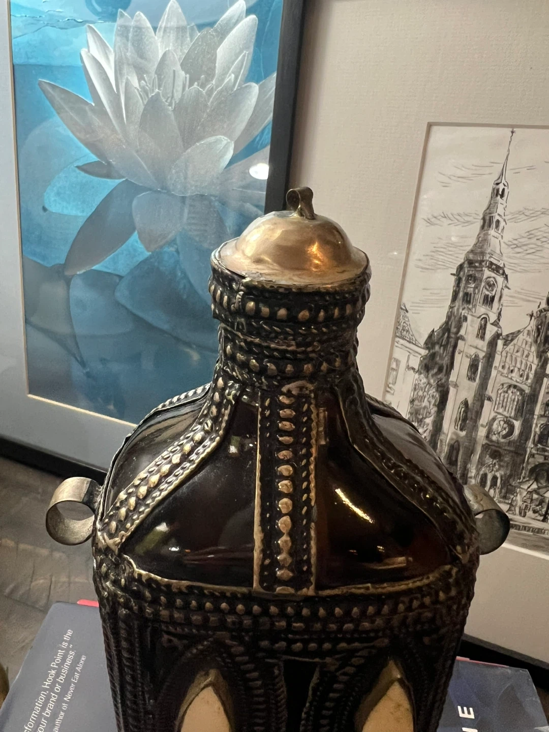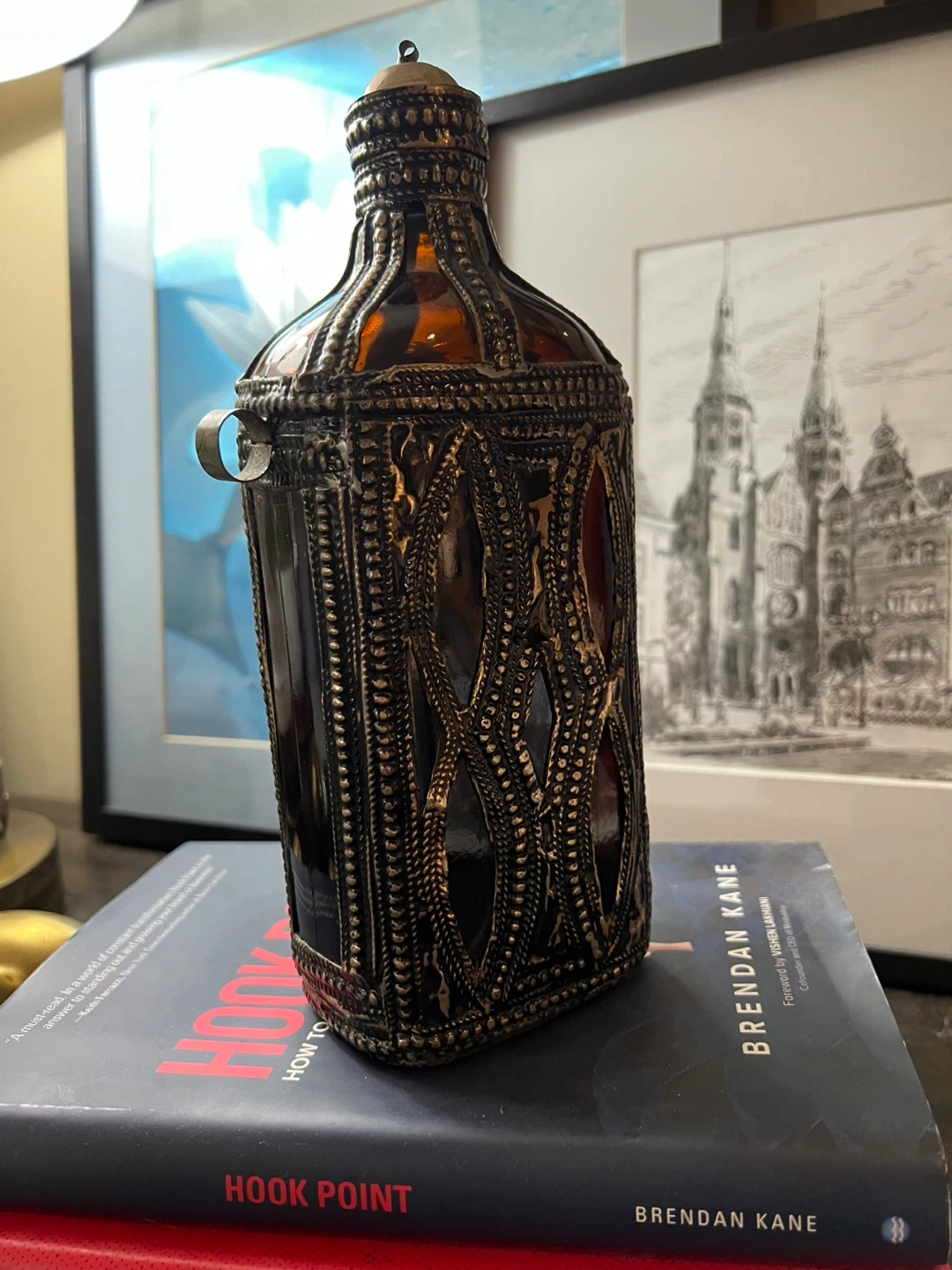 Intricate metalwork and inlaid stones accents Stopper Amber glass Ideal for interior decoration or collecting Perfect condition 9.5” x 5” x 3” Unique statement piece!! Asking $20 Interested? Message me and please check my other listings…