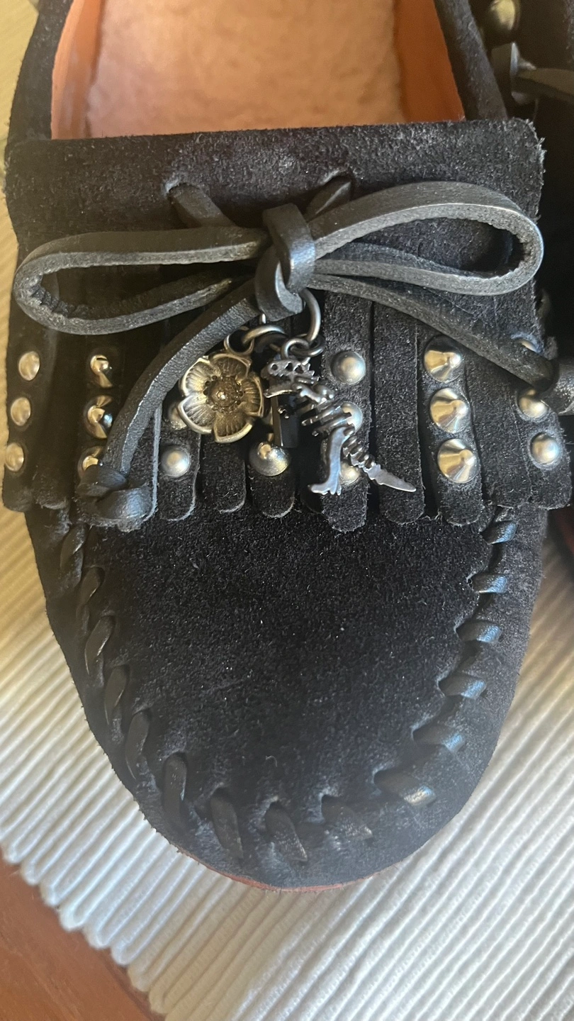 Selling a pair of Coach Roccasin slip-on shoes in women's size 5.5. These stylish black suede moccasins feature studded detailing and a cute charm on the bow. They're in great condition and ready for a new home!