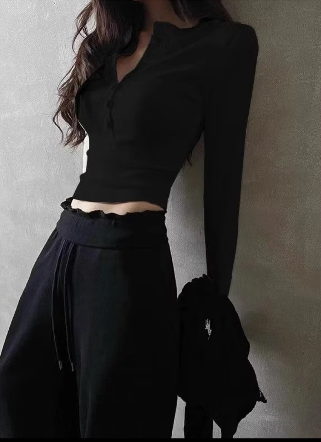 A stylish black long sleeve henley shirt! Perfect for layering or wearing on its own. It's in great condition and ready for a new home! The material is soft and comfortable, making it ideal for everyday wear