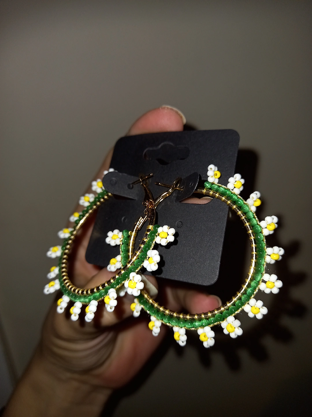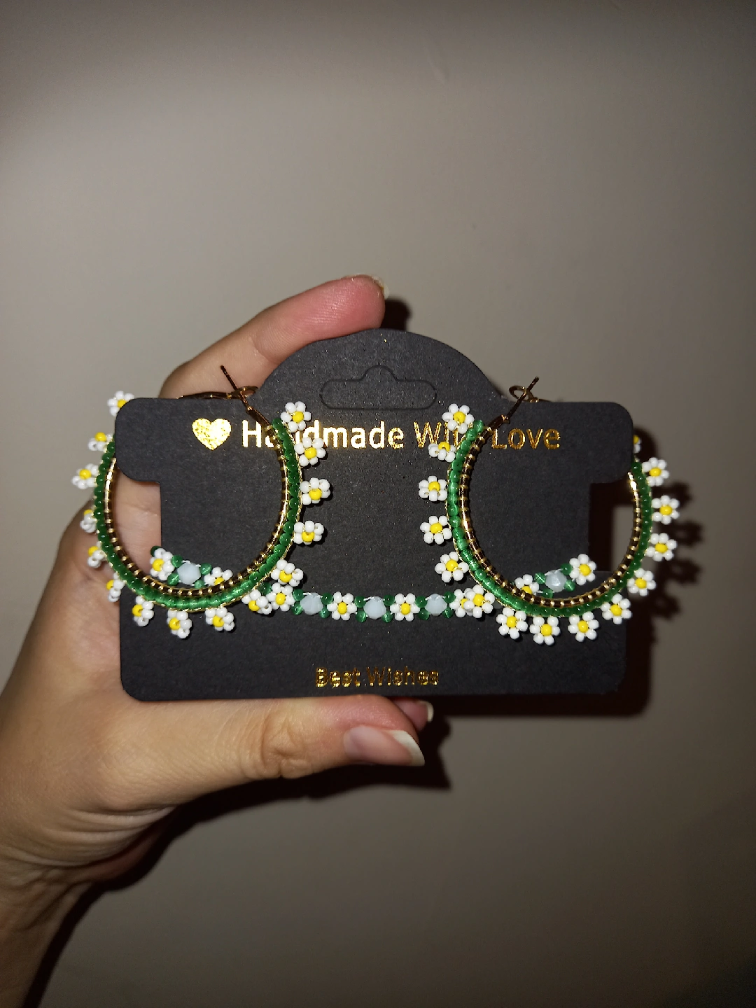 Selling a super cute handmade set of daisy earrings and a matching bracelet! The earrings are hoop-style with green and gold accents, and the bracelet has the same sweet daisy design. Perfect for adding a little sunshine to your day! I made from beads and Cat eyes ๐ป stones. nice sparkle โจ๏ธ ๐ stainless steel set - $50. separate: $30 - bracelet, $25 - earrings I can do a necklace ๐ชโค๏ธ