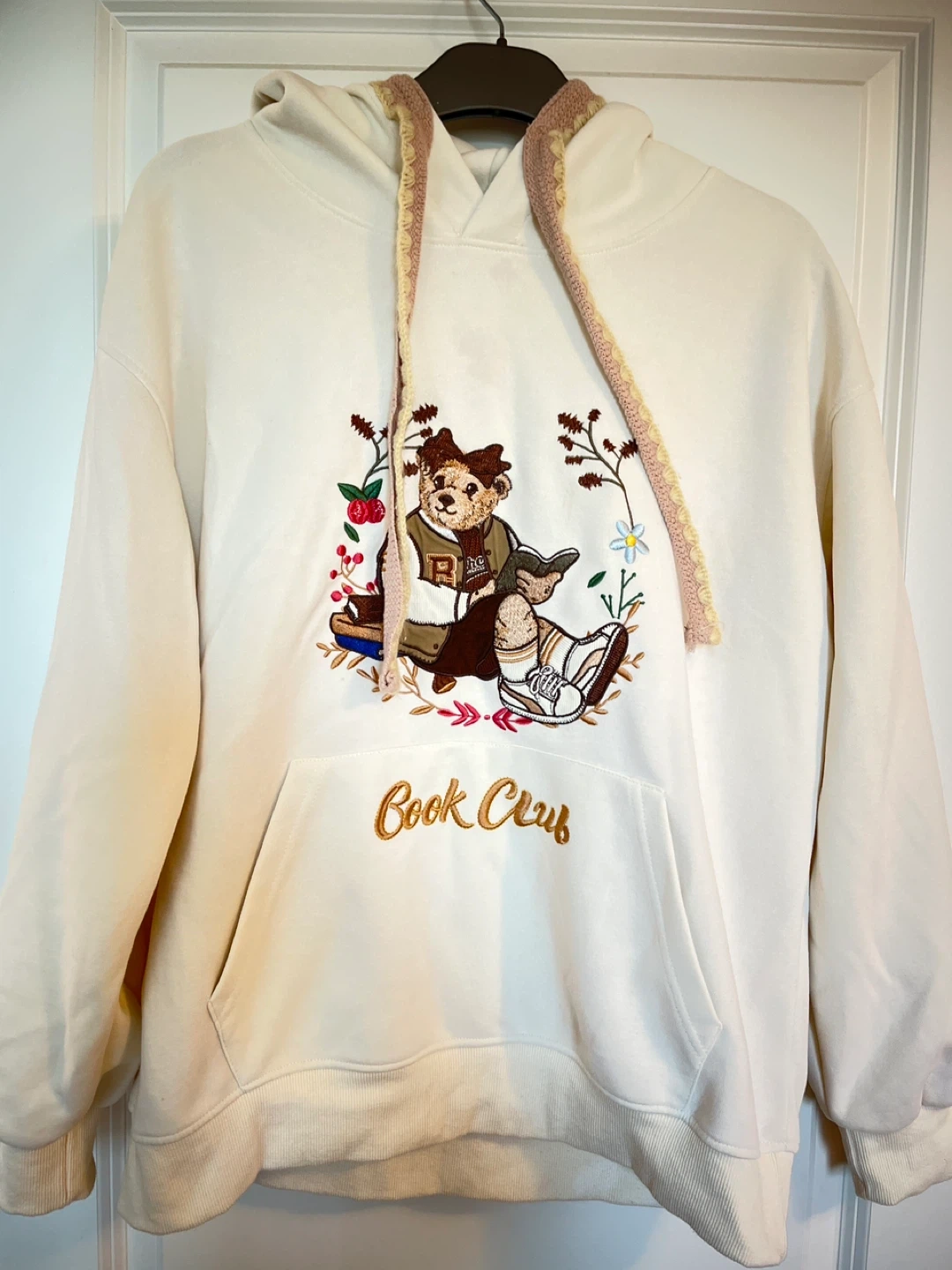Cozy cream-coloured hoodie with a cute bear reading a book design! It says "Book Club" on the front pocket. Perfect for staying warm and stylish while showing off your love for reading