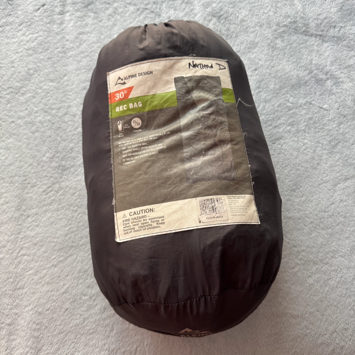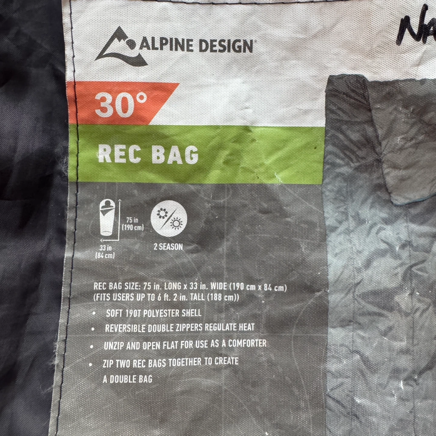 Selling an Alpine Design 30° Rec Bag sleeping bag. It’s thin, for warmer nights, or day traveling