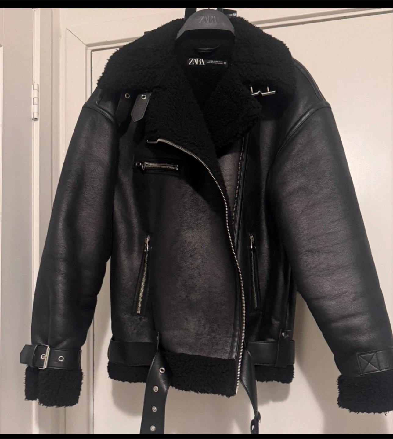 Selling a stylish Zara aviator jacket in black! It's made of faux leather with a cozy faux fur lining. Perfect for staying warm and looking fashionable this season!